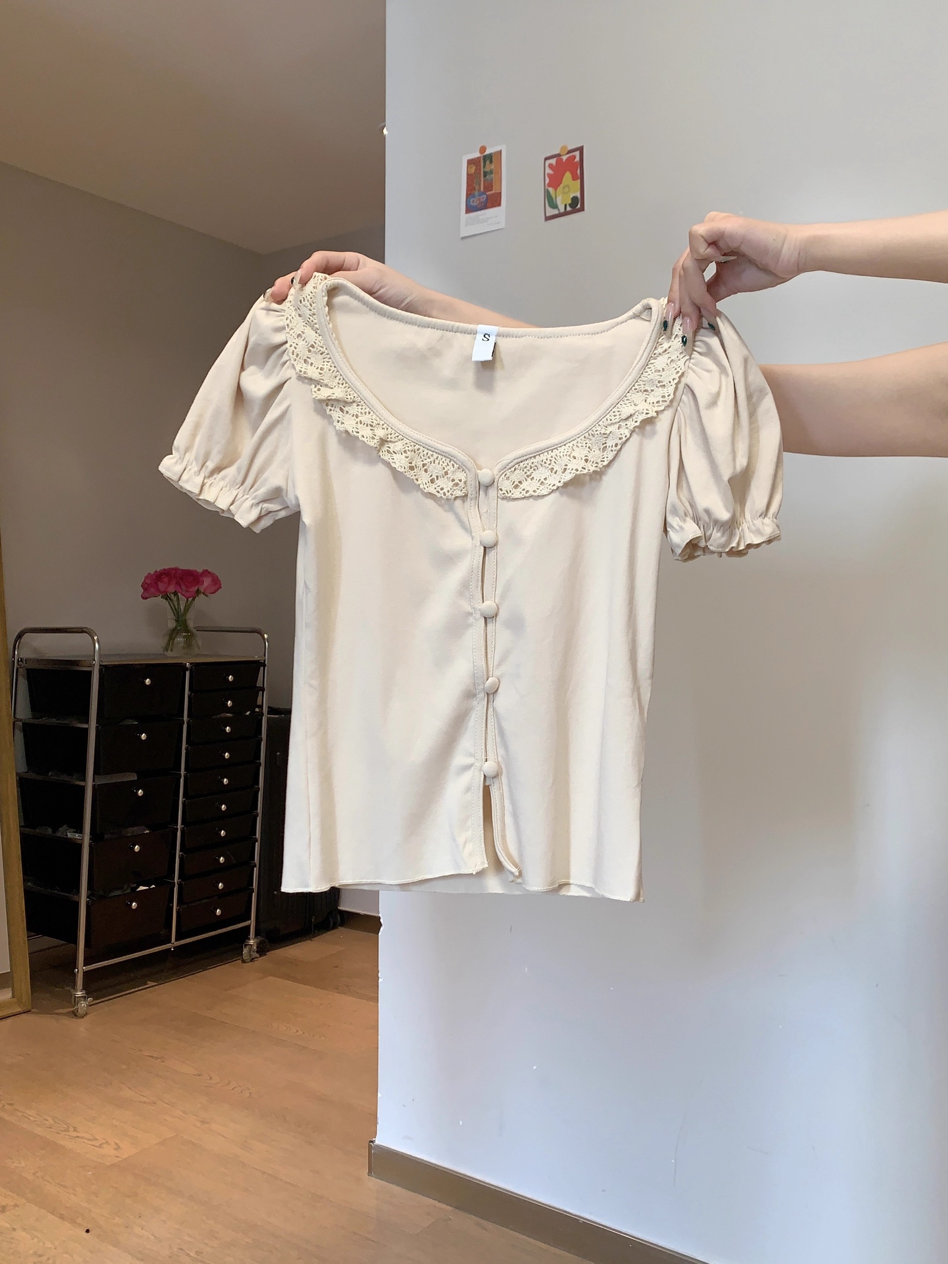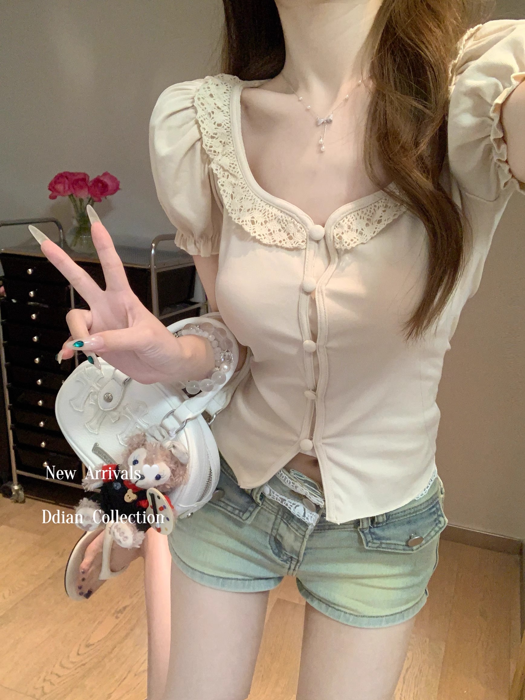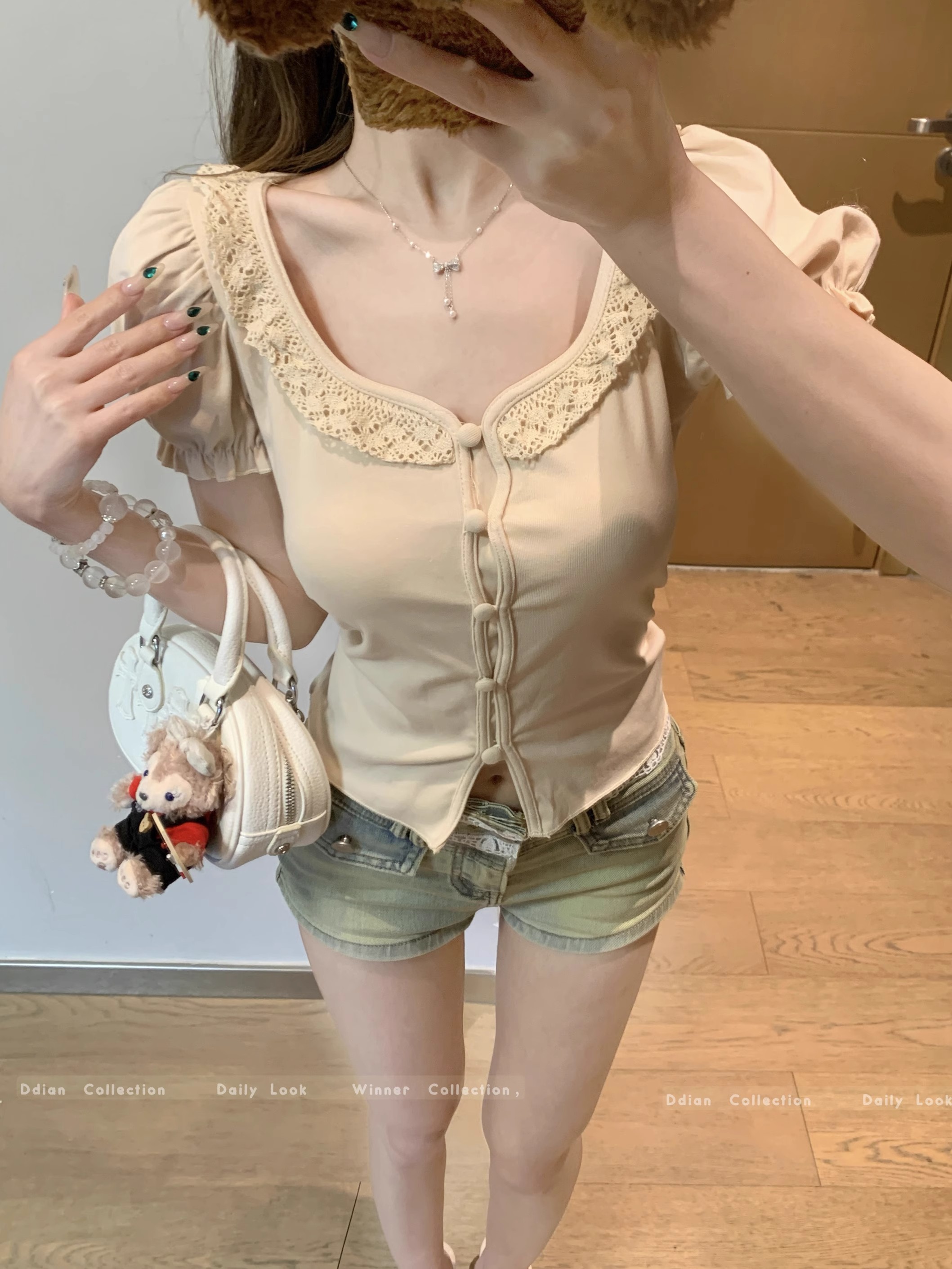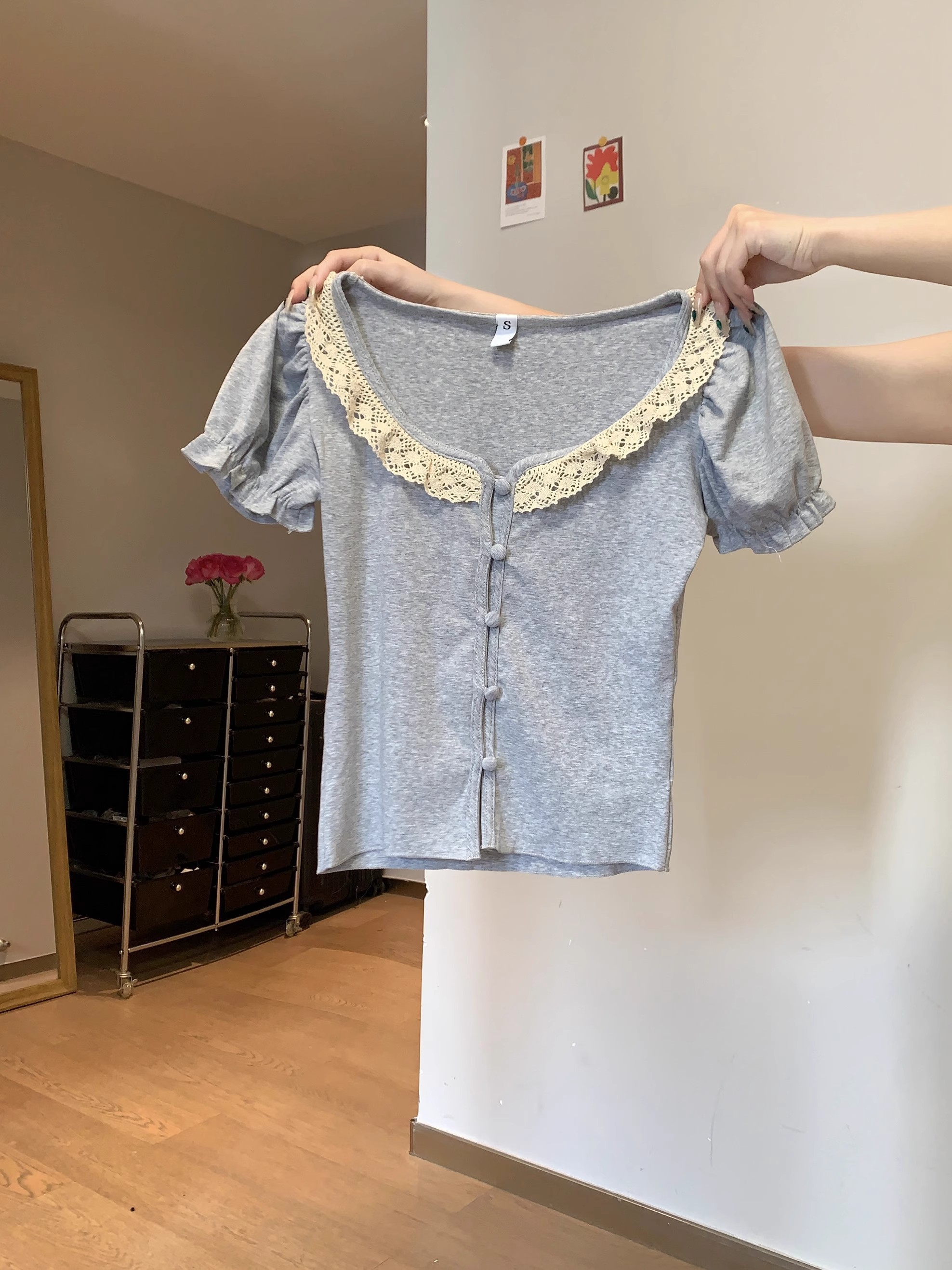 MY16982# 蕾丝拼接短袖T恤女正肩短款上衣女裝貨源服裝批發