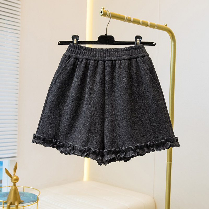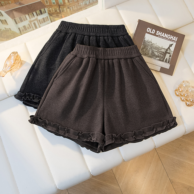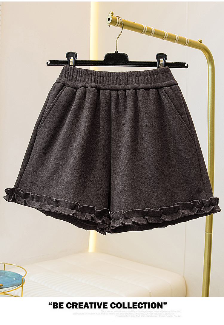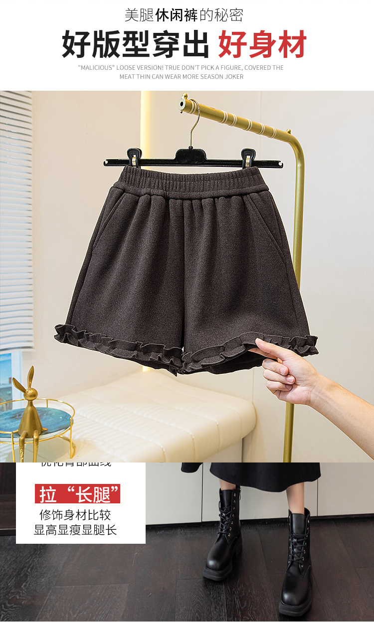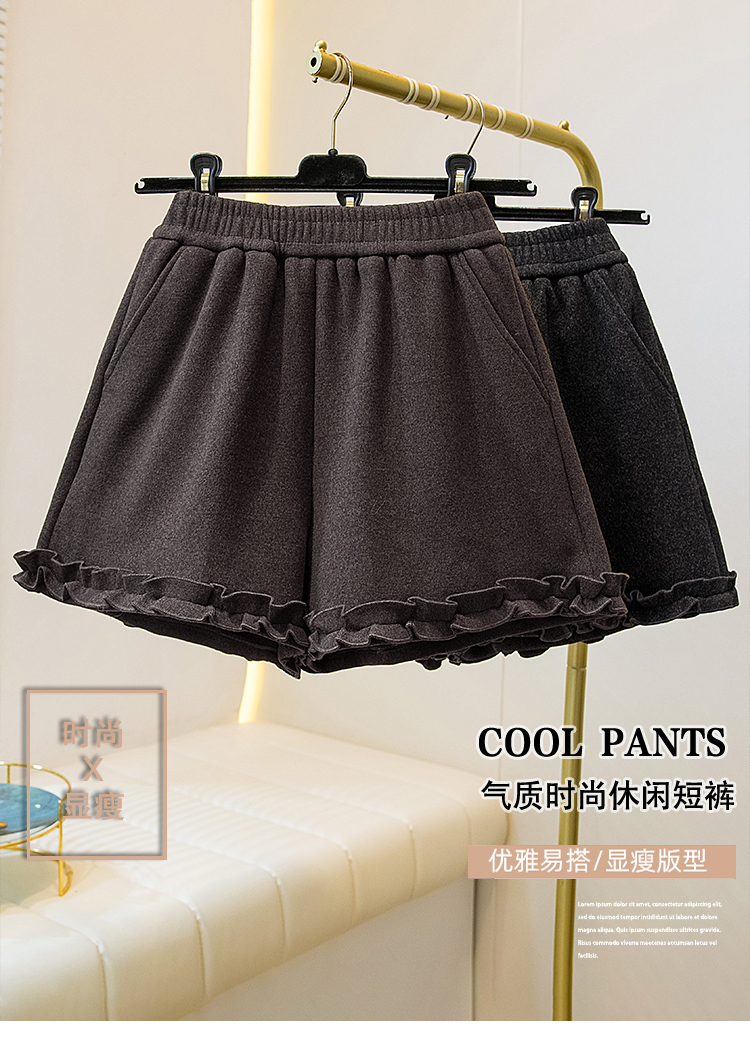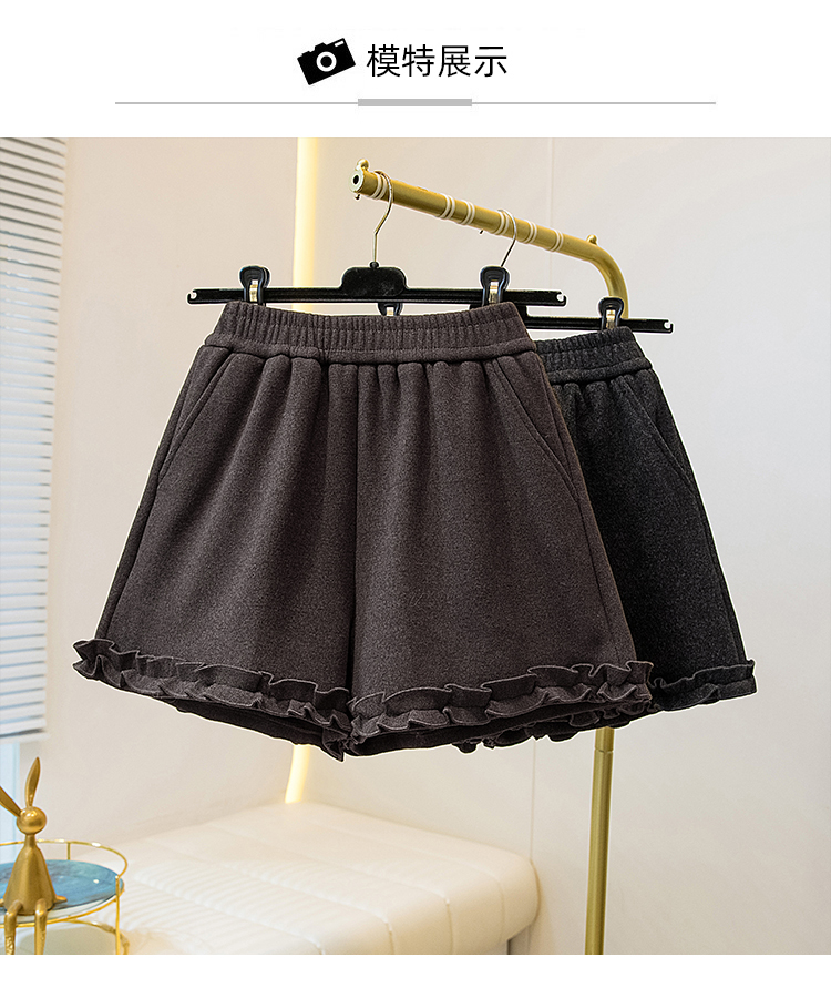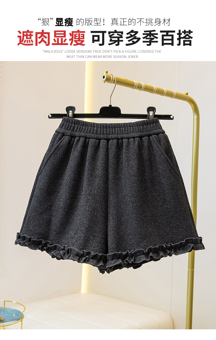 MY17260# 大码胖MM新款木耳花边毛呢加绒短裤女百搭显瘦休闲a字靴裤女裝貨源服裝批發