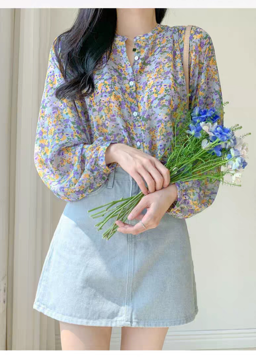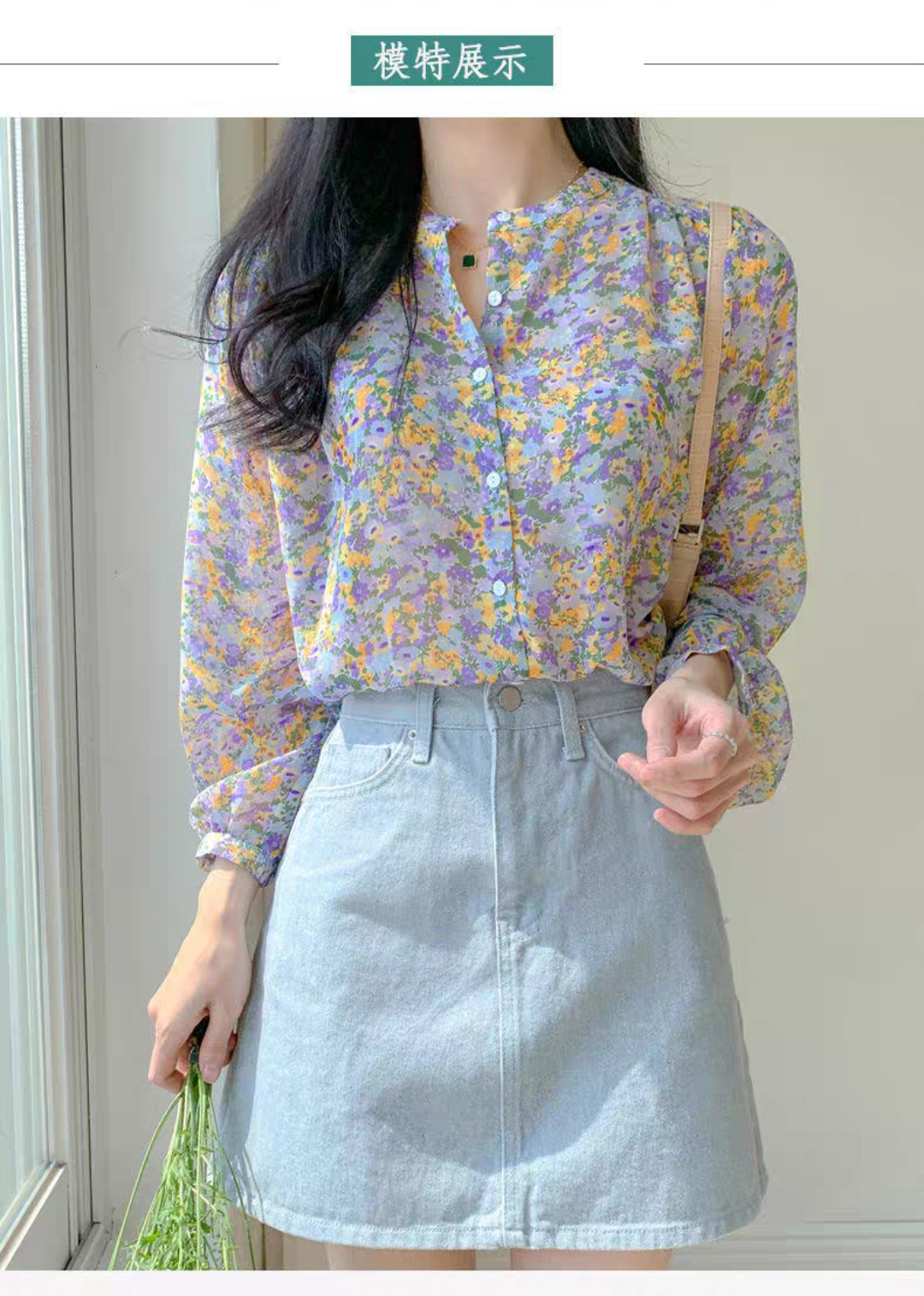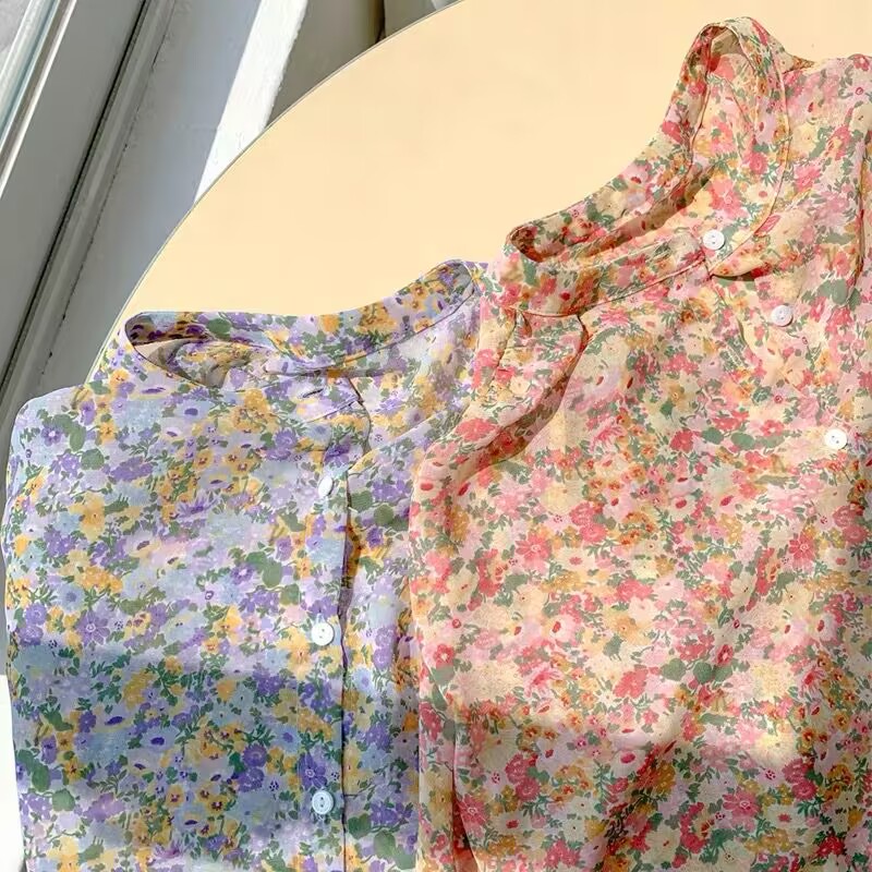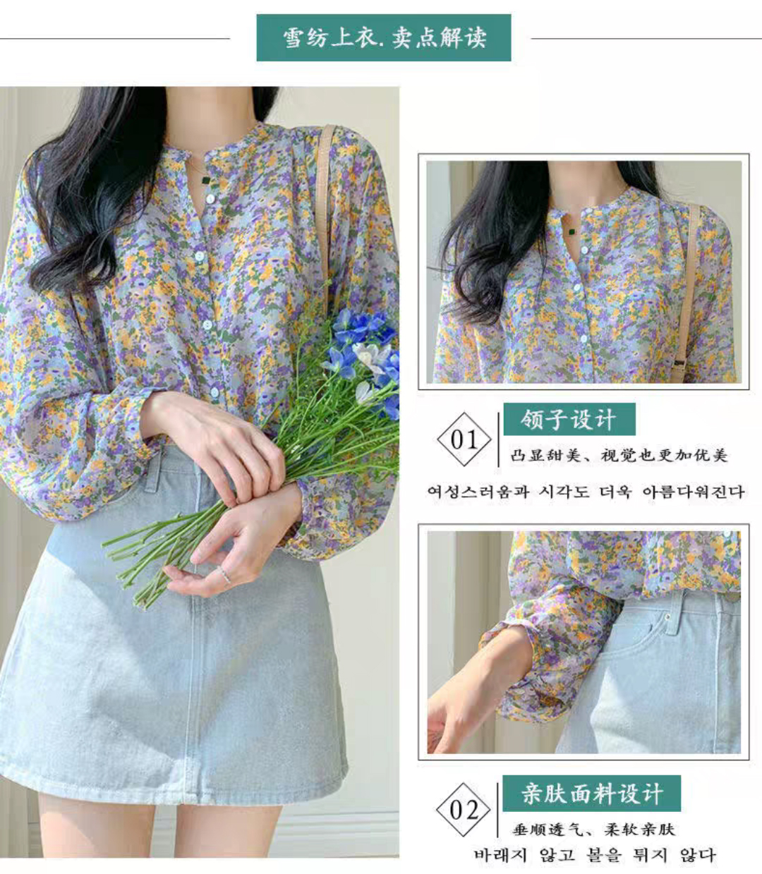 MY17263# V领碎花雪纺衬衫女超仙设计感长袖印花洋气很仙上衣甜美开衫女裝貨源服裝批發