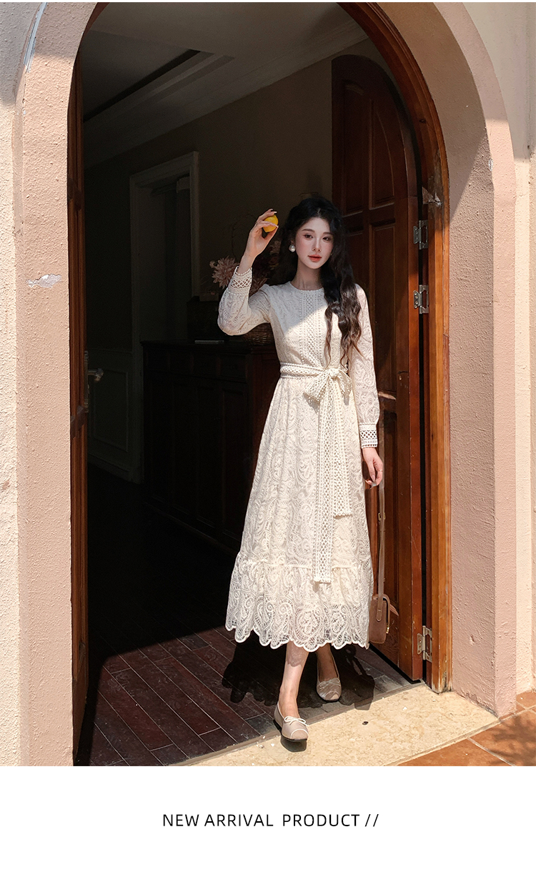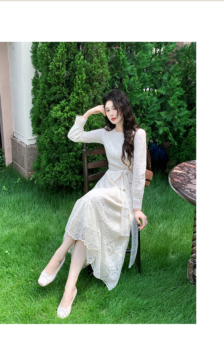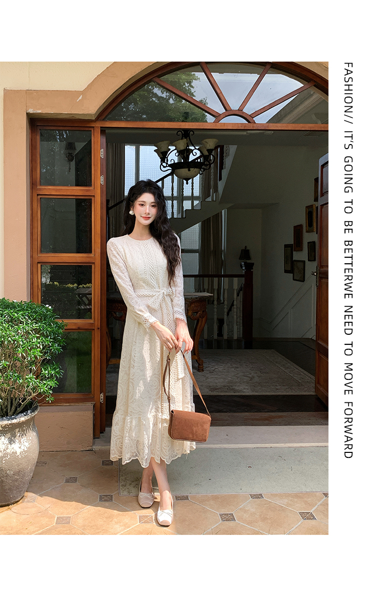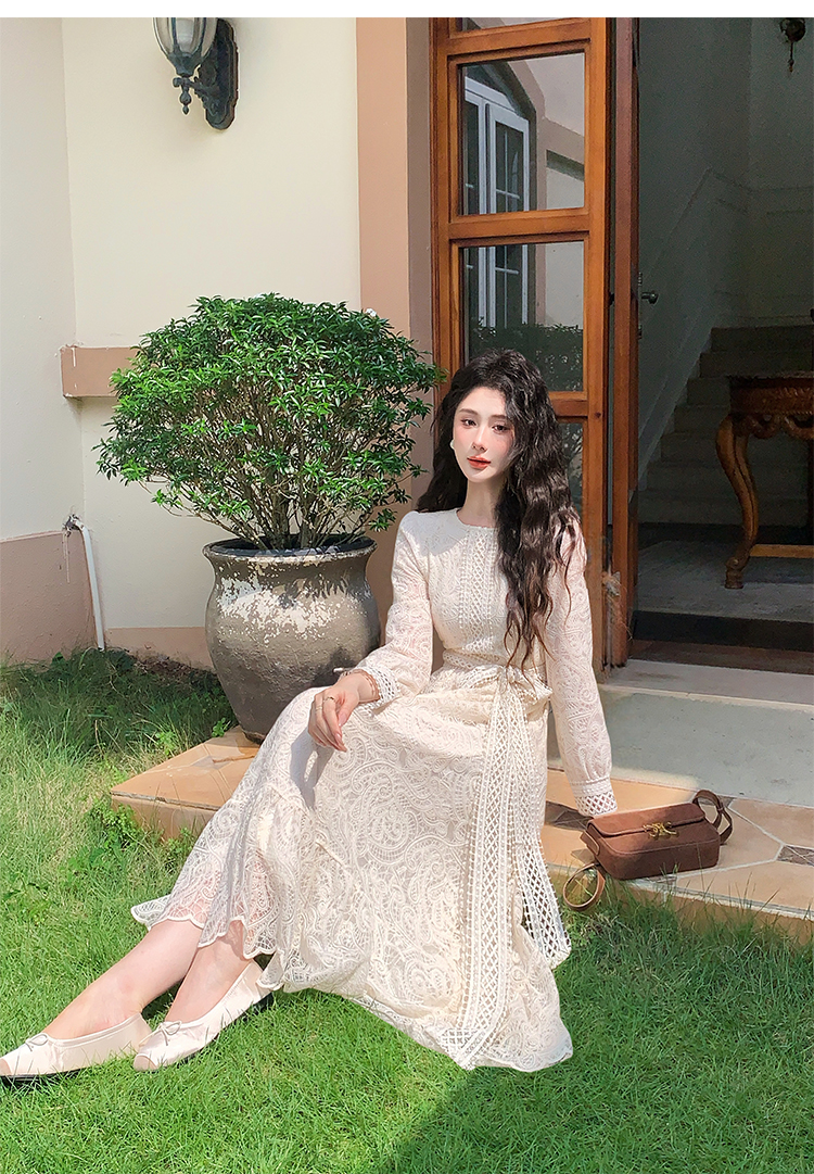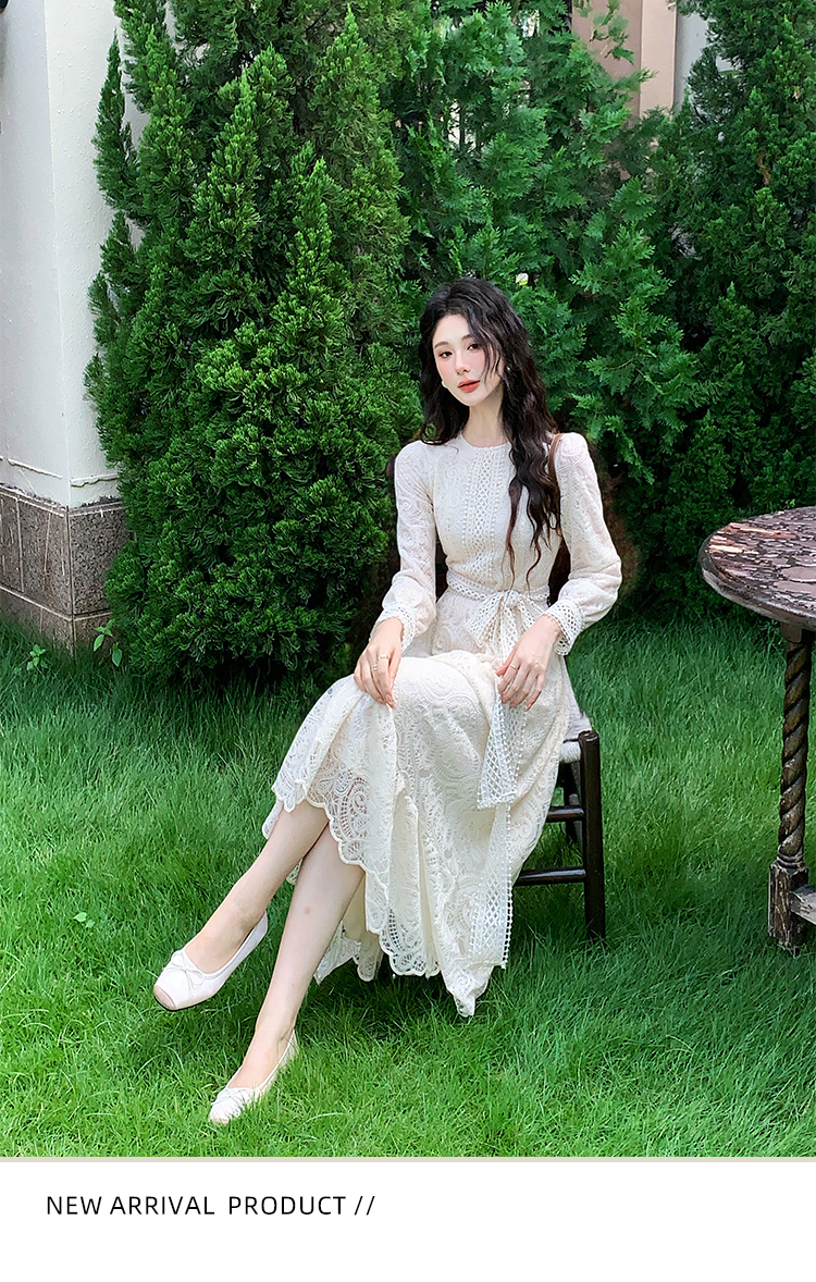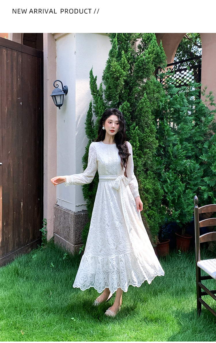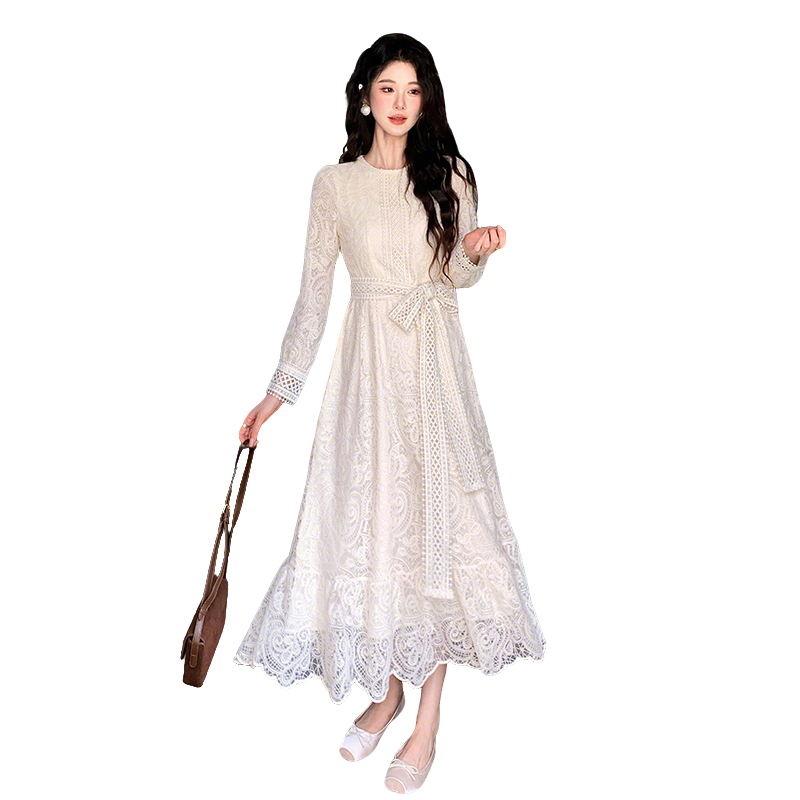 MY17290# 新款圆领长袖水溶花收腰显瘦蕾丝连衣裙长裙女裝貨源服裝批發