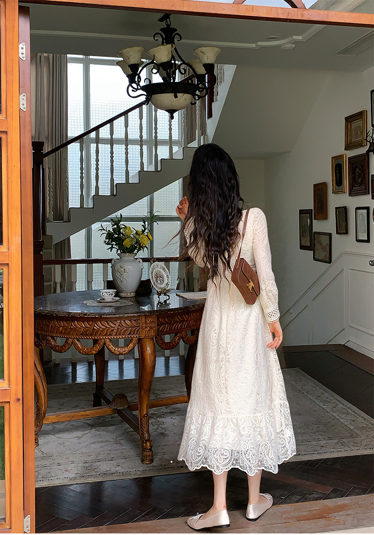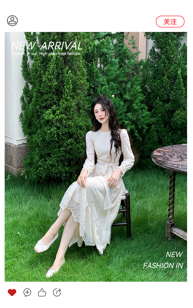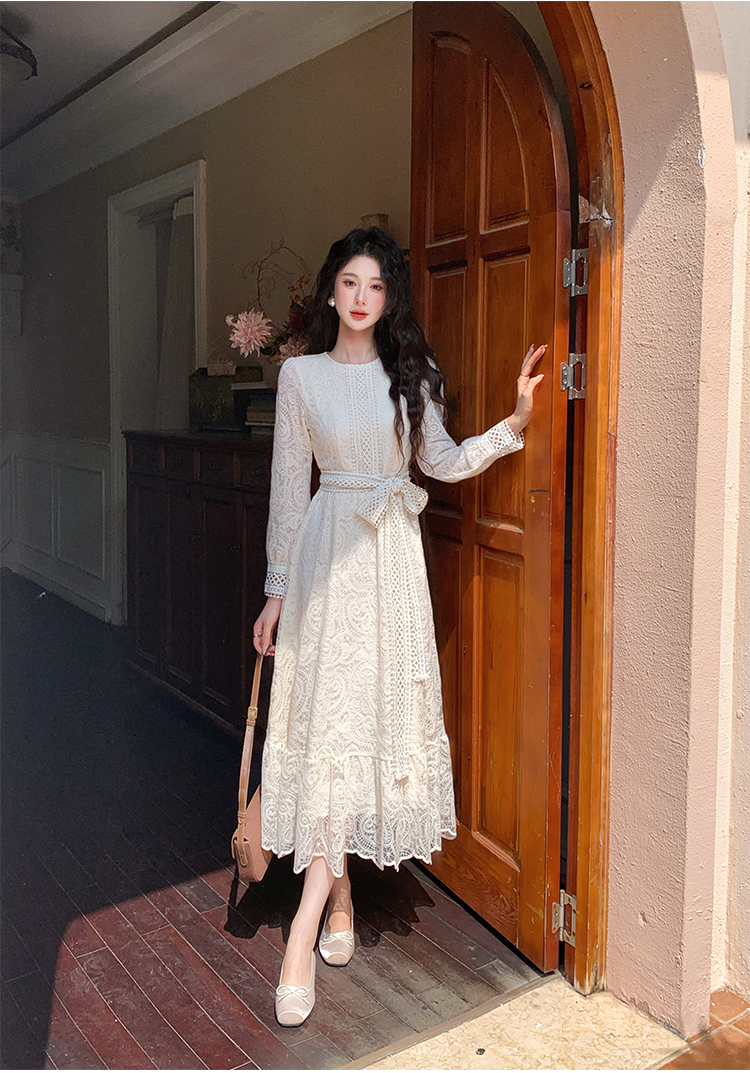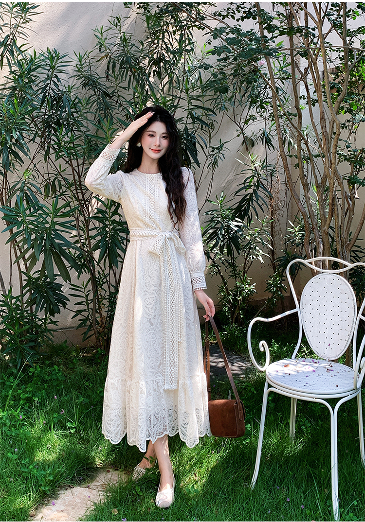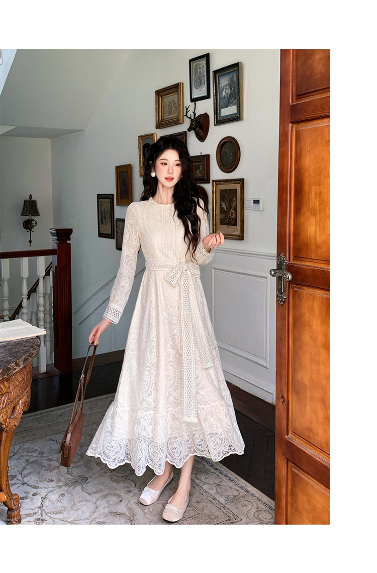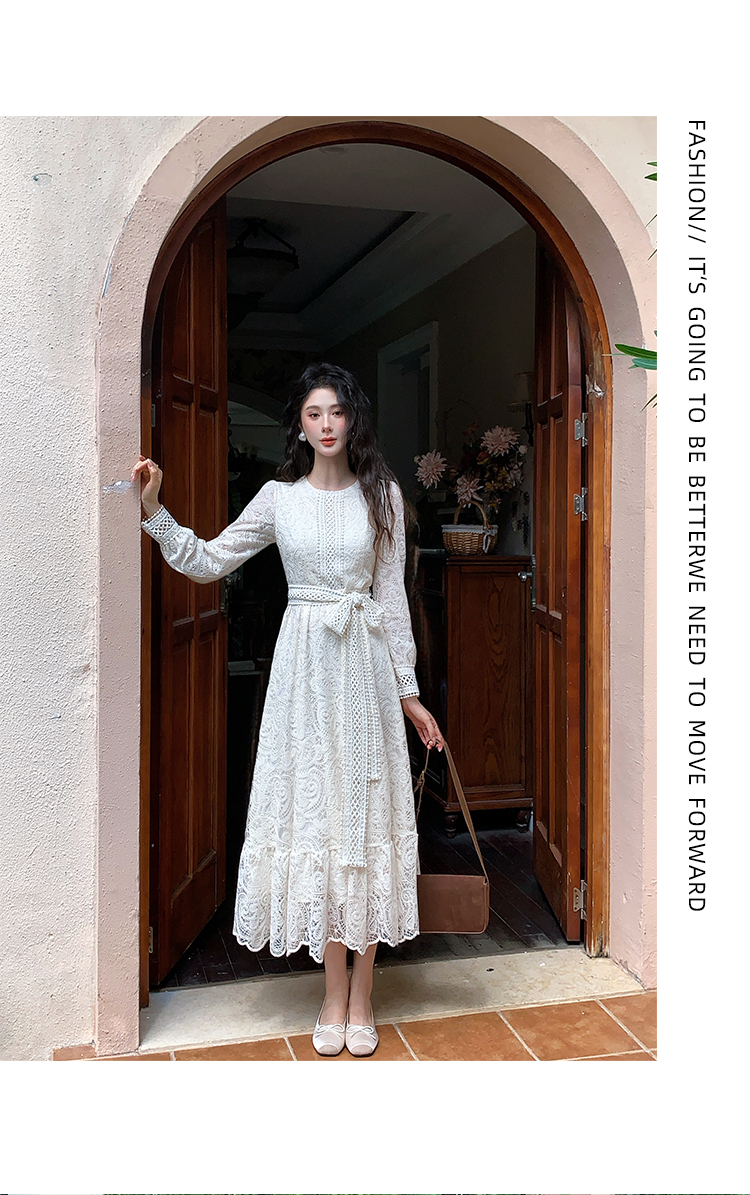 MY17290# 新款圆领长袖水溶花收腰显瘦蕾丝连衣裙长裙女裝貨源服裝批發