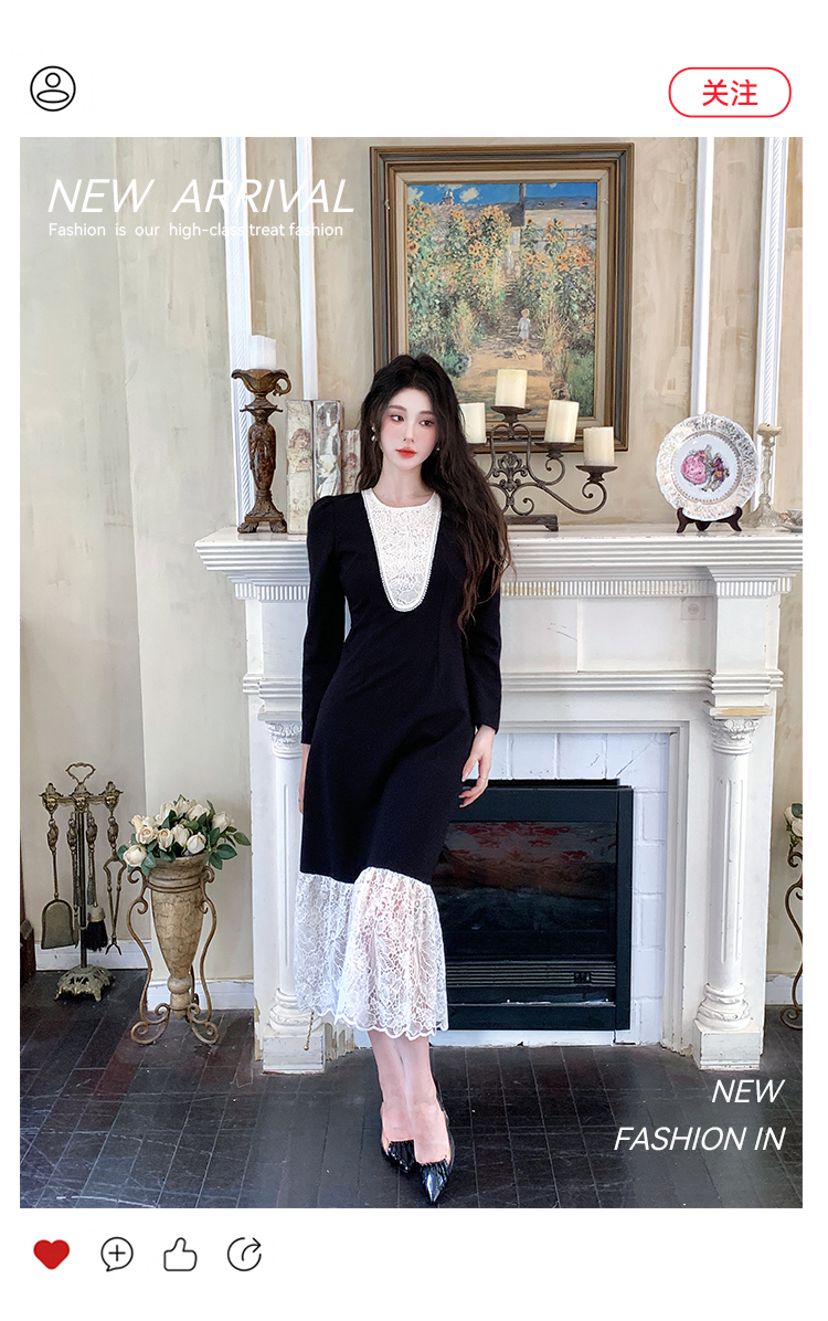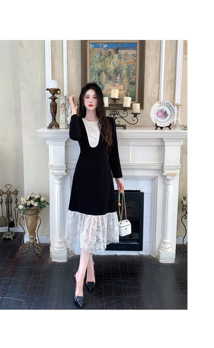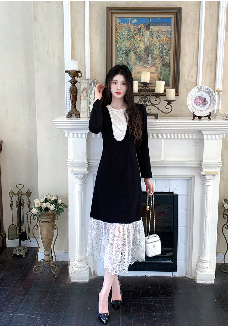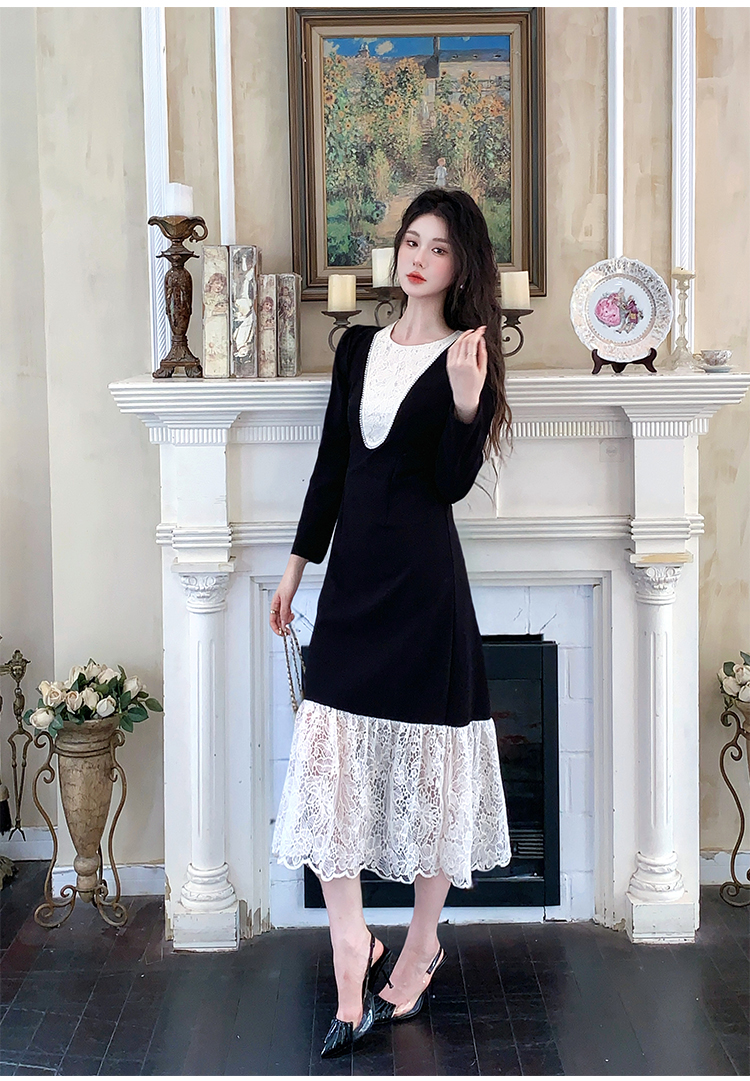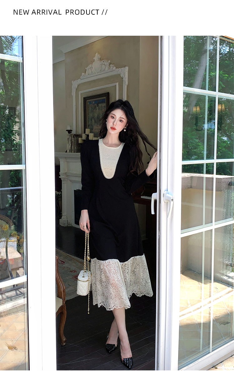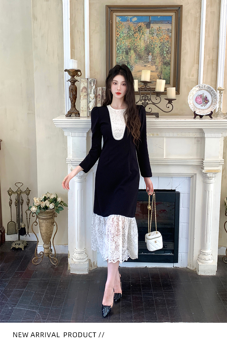 MY17297# 黑色赫本风法式蕾丝拼接高级气质显瘦连衣裙女裝貨源服裝批發