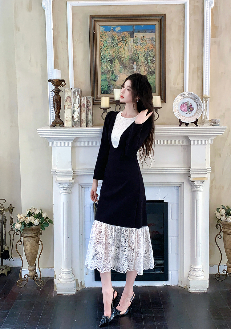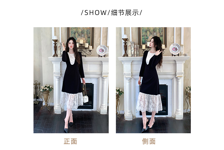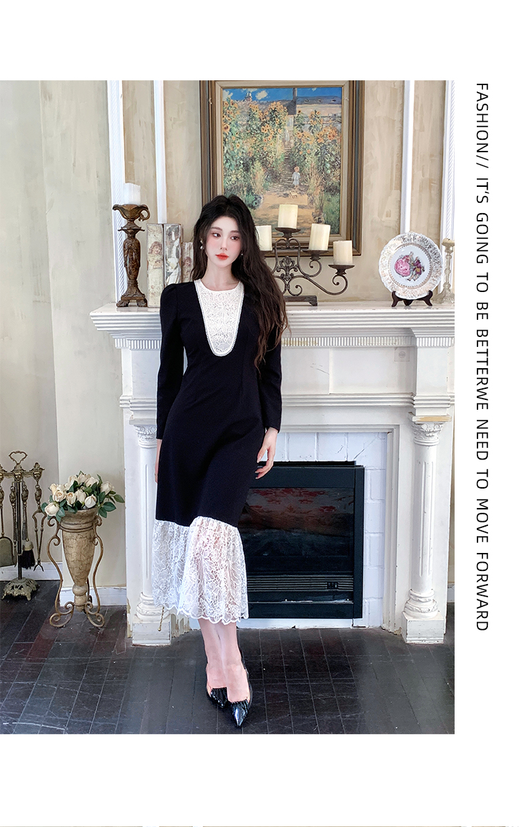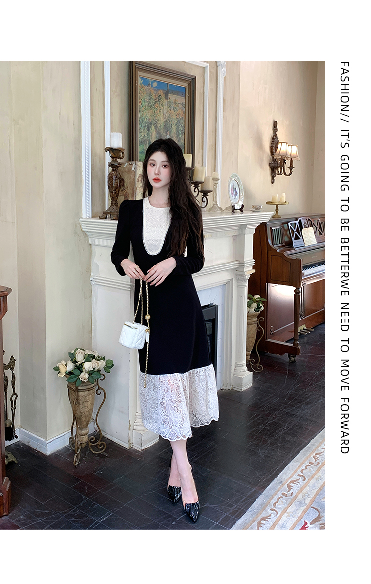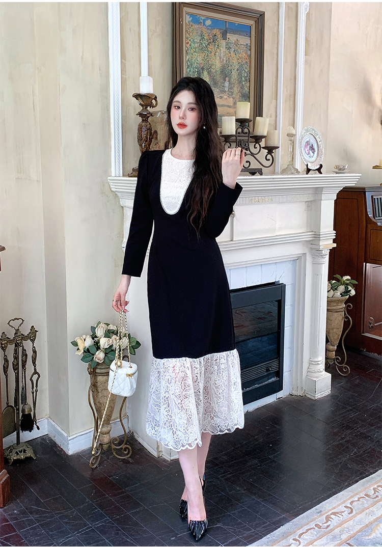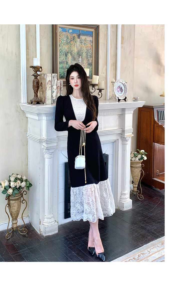 MY17297# 黑色赫本风法式蕾丝拼接高级气质显瘦连衣裙女裝貨源服裝批發