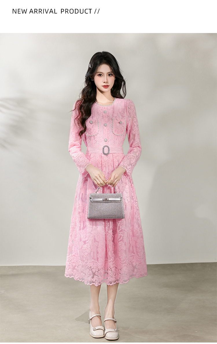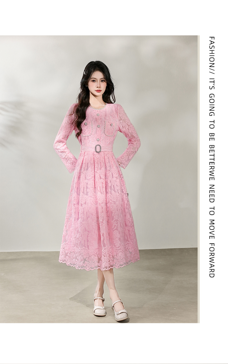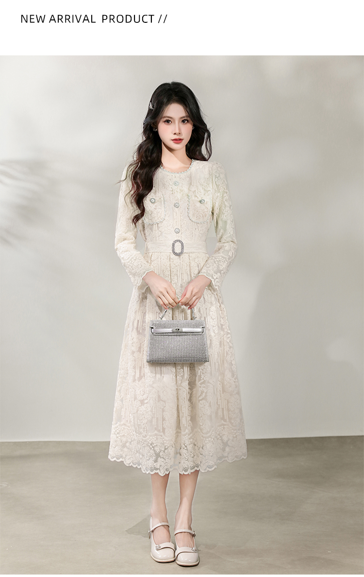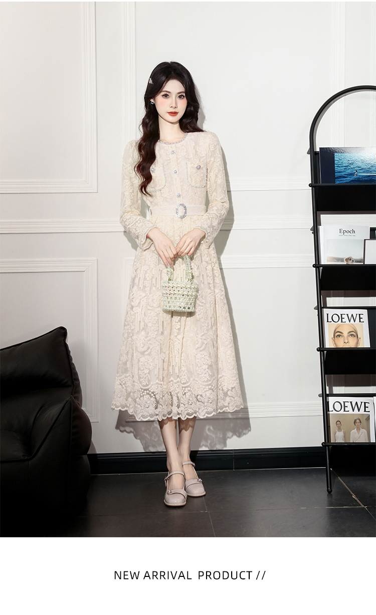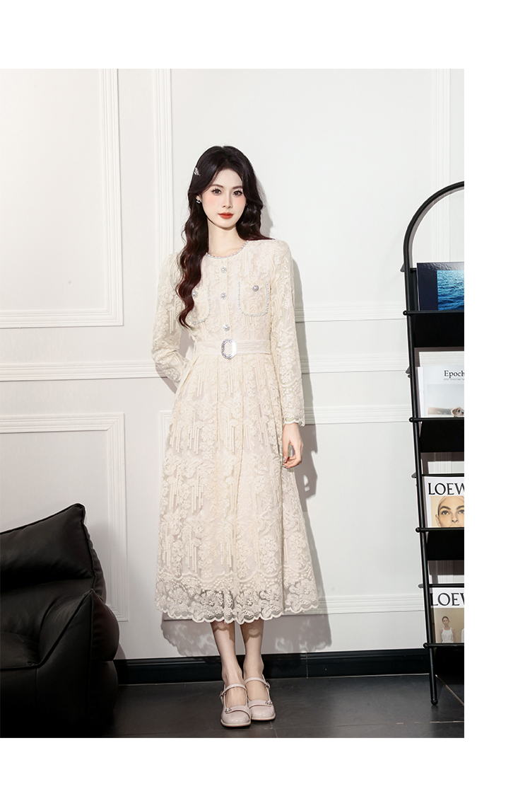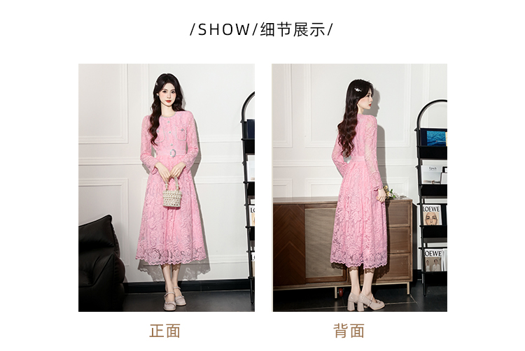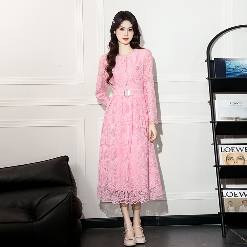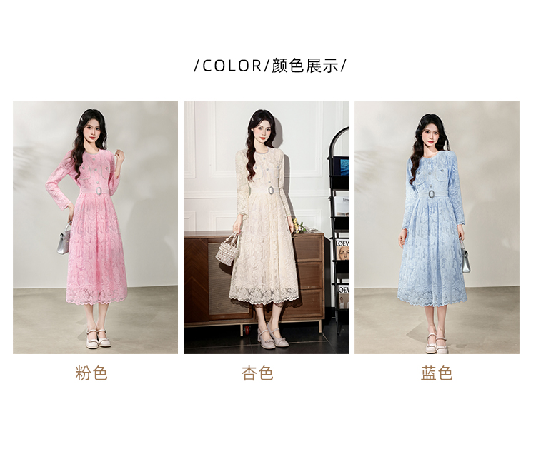 MY17299# 新款小香风收腰显瘦长袖蕾丝连衣裙配腰带女裝貨源服裝批發