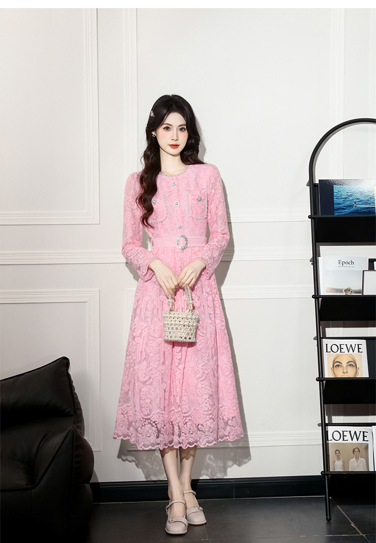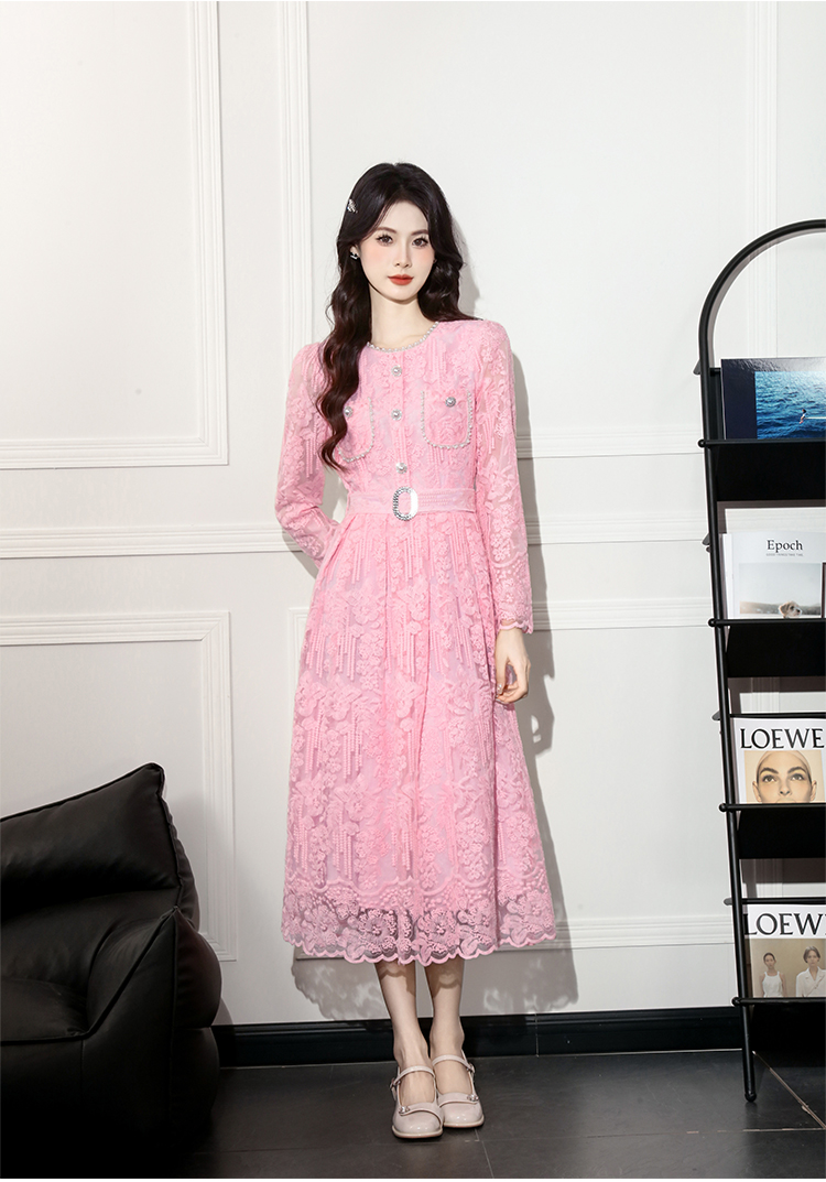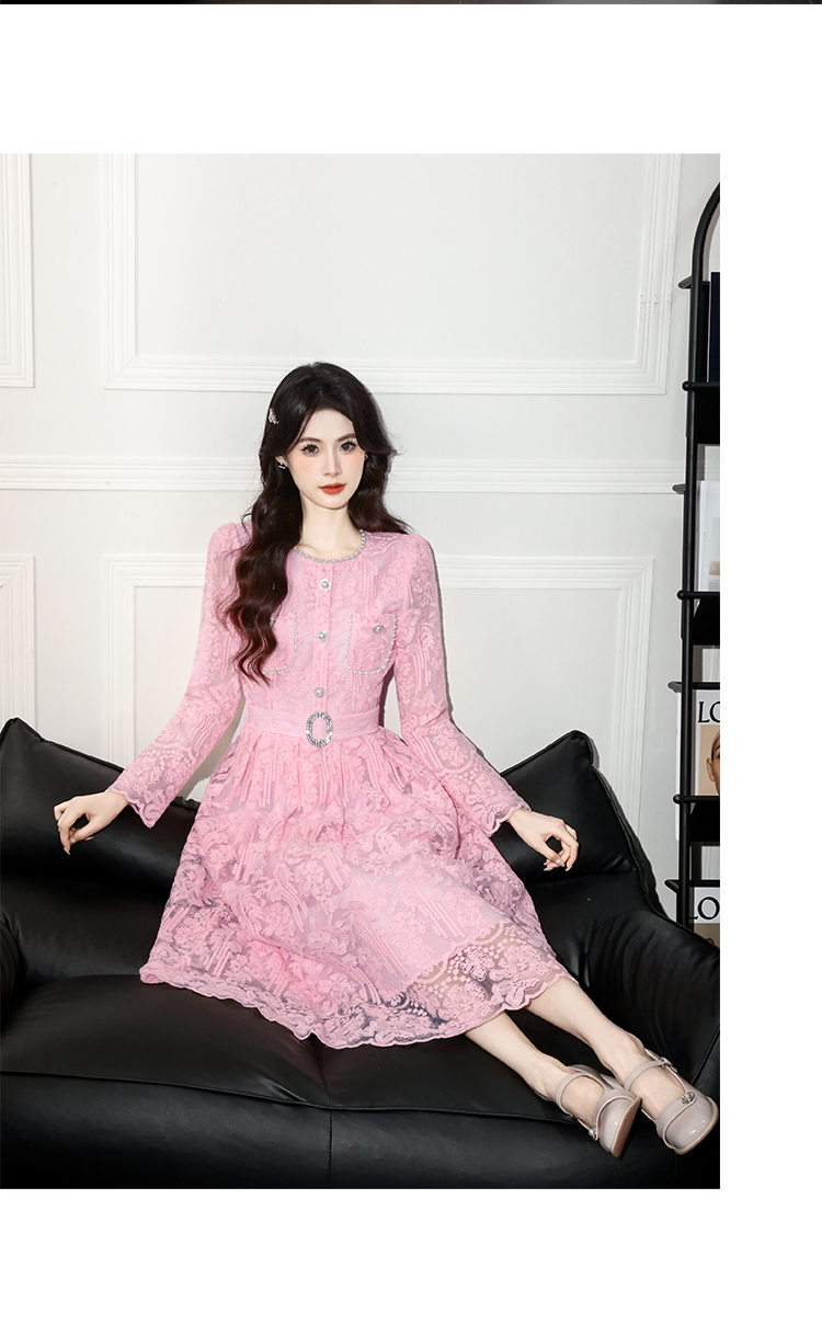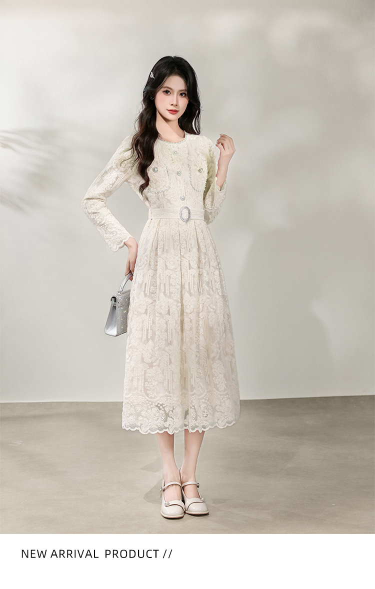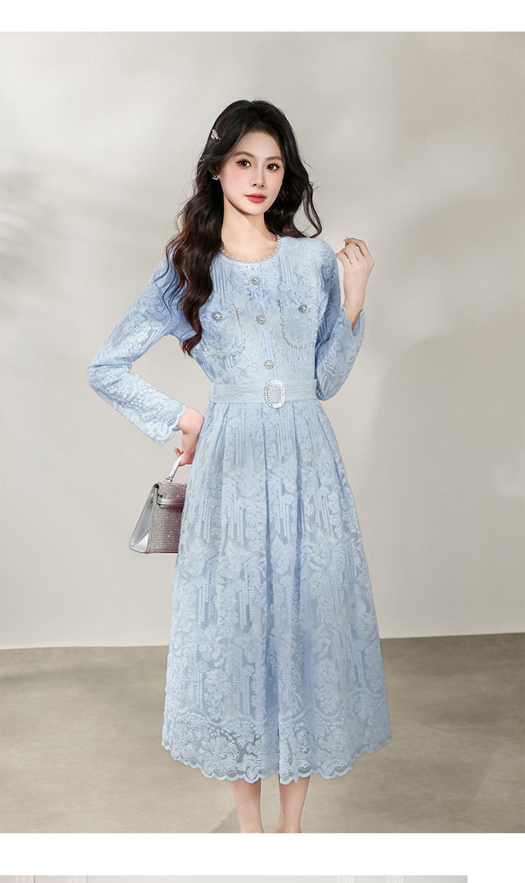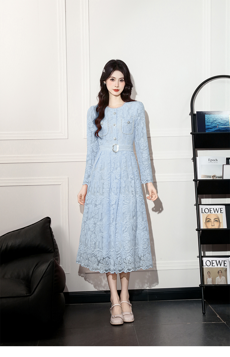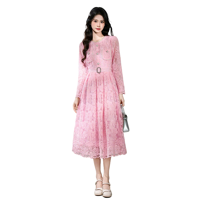 MY17299# 新款小香风收腰显瘦长袖蕾丝连衣裙配腰带女裝貨源服裝批發