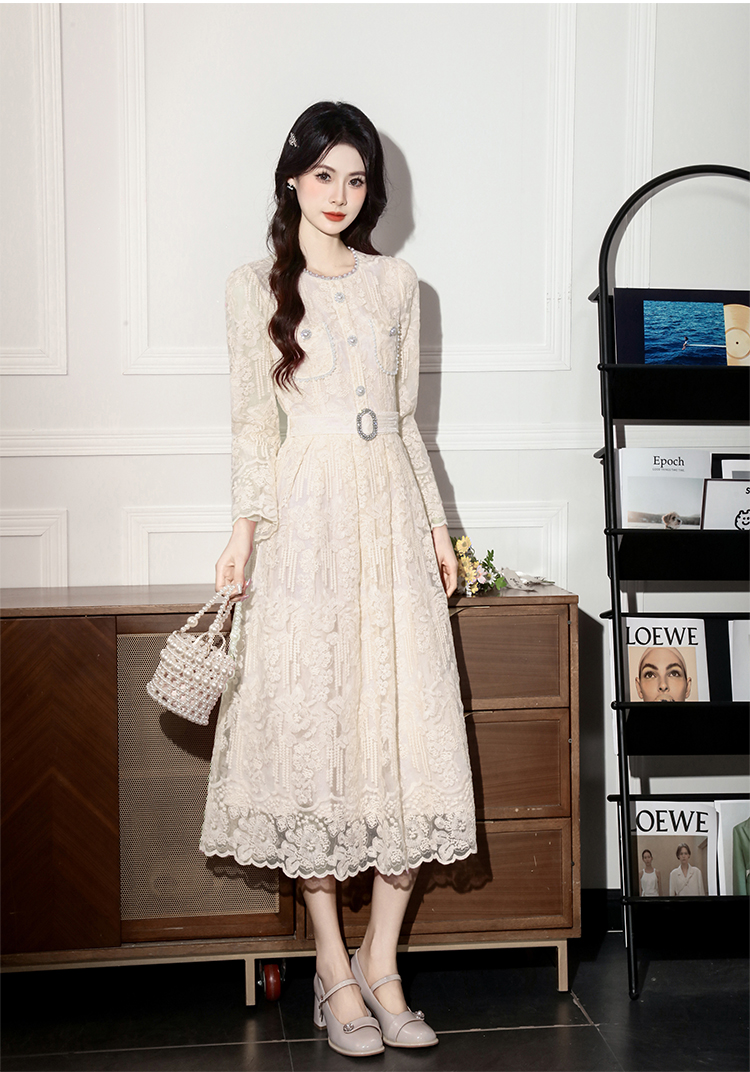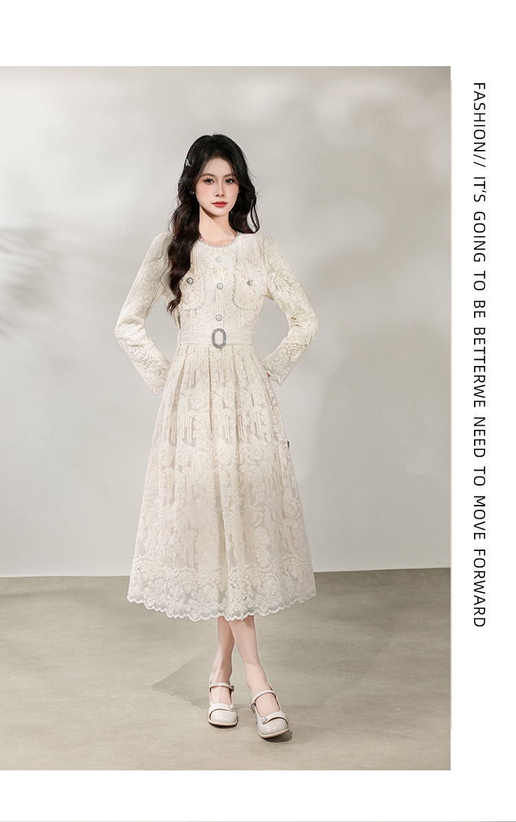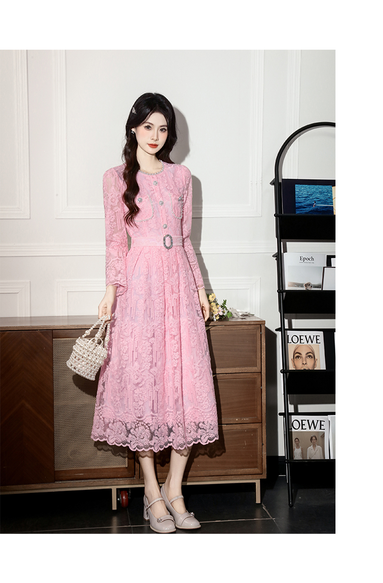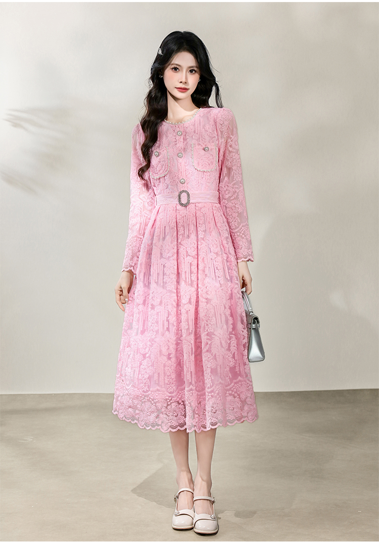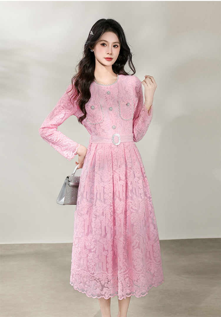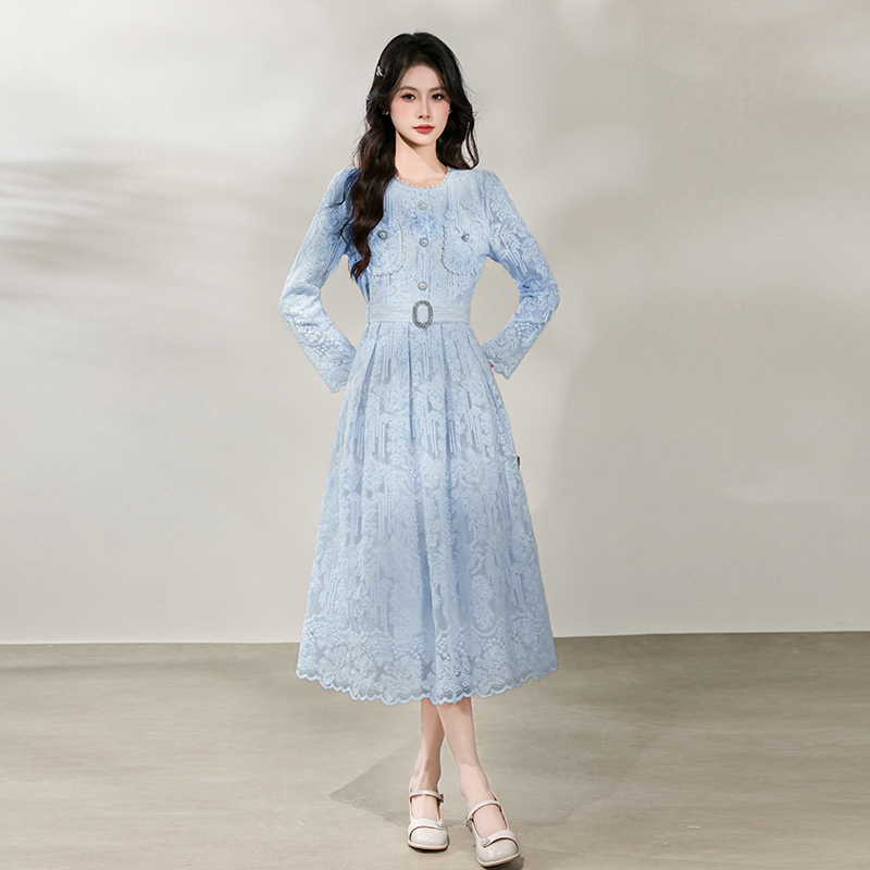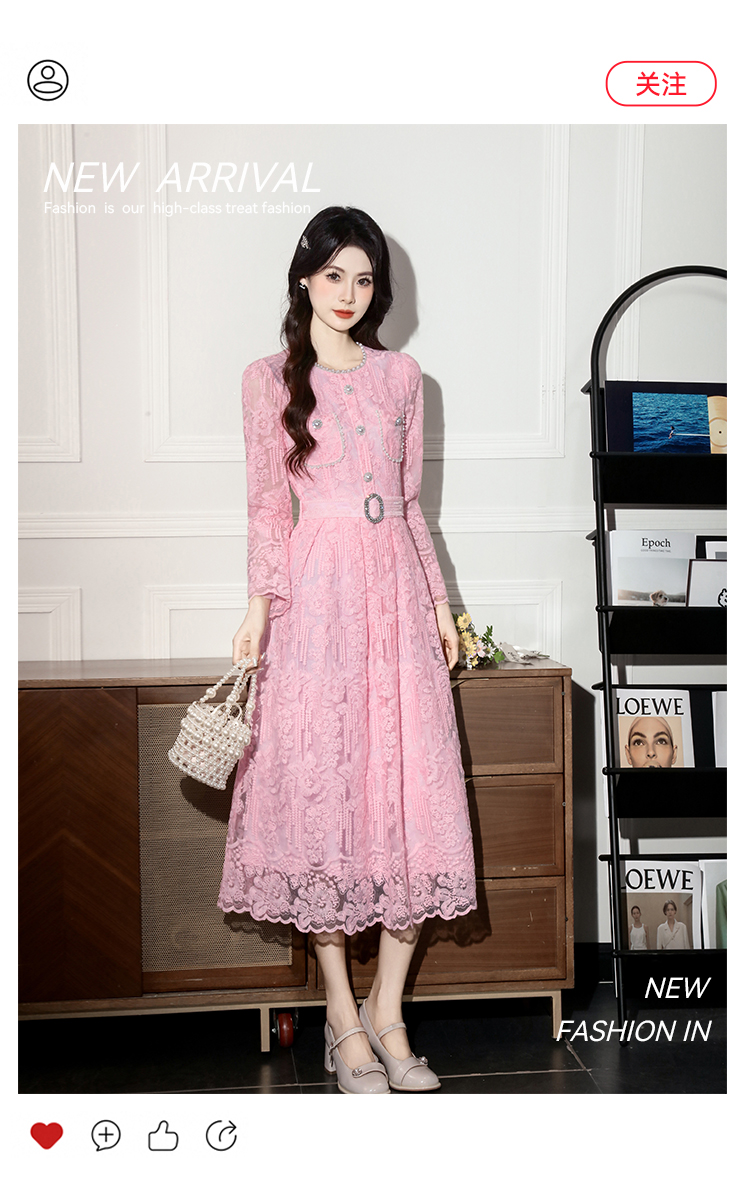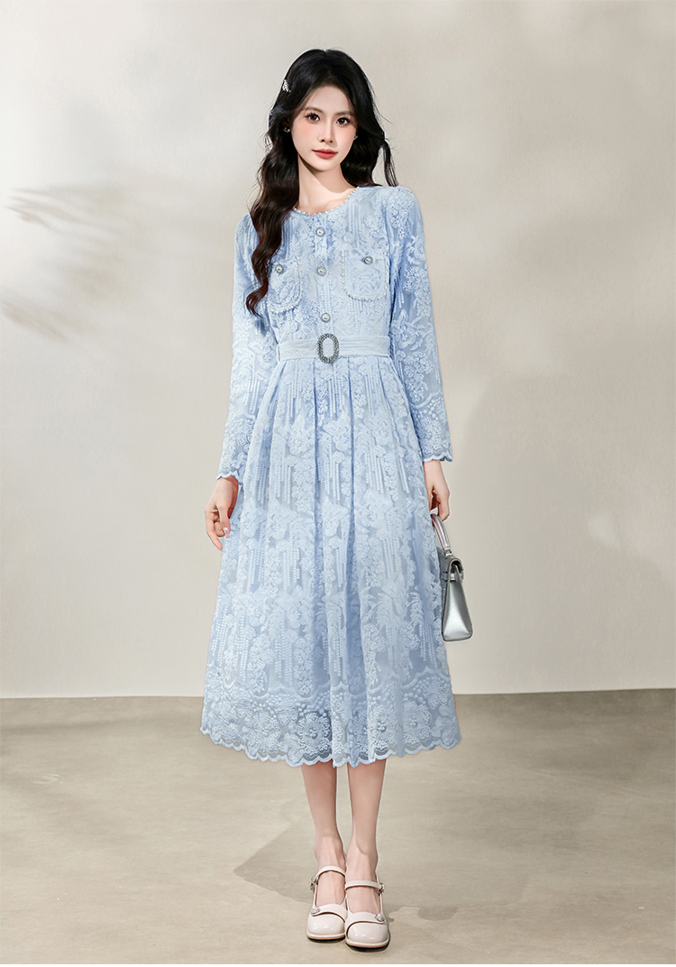 MY17299# 新款小香风收腰显瘦长袖蕾丝连衣裙配腰带女裝貨源服裝批發