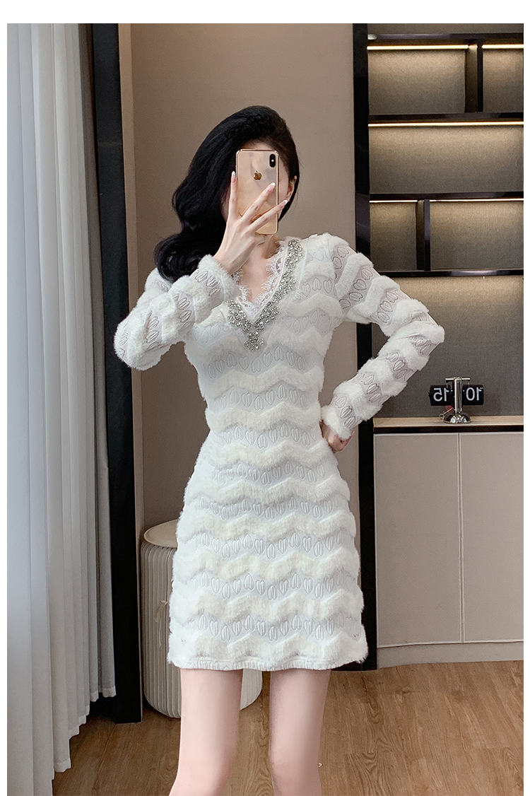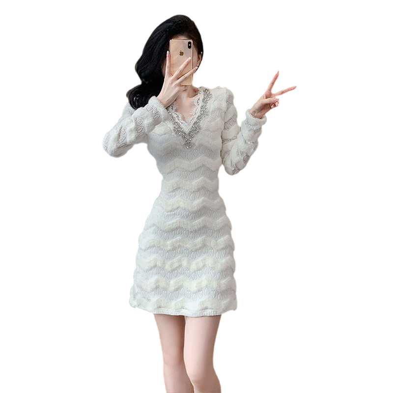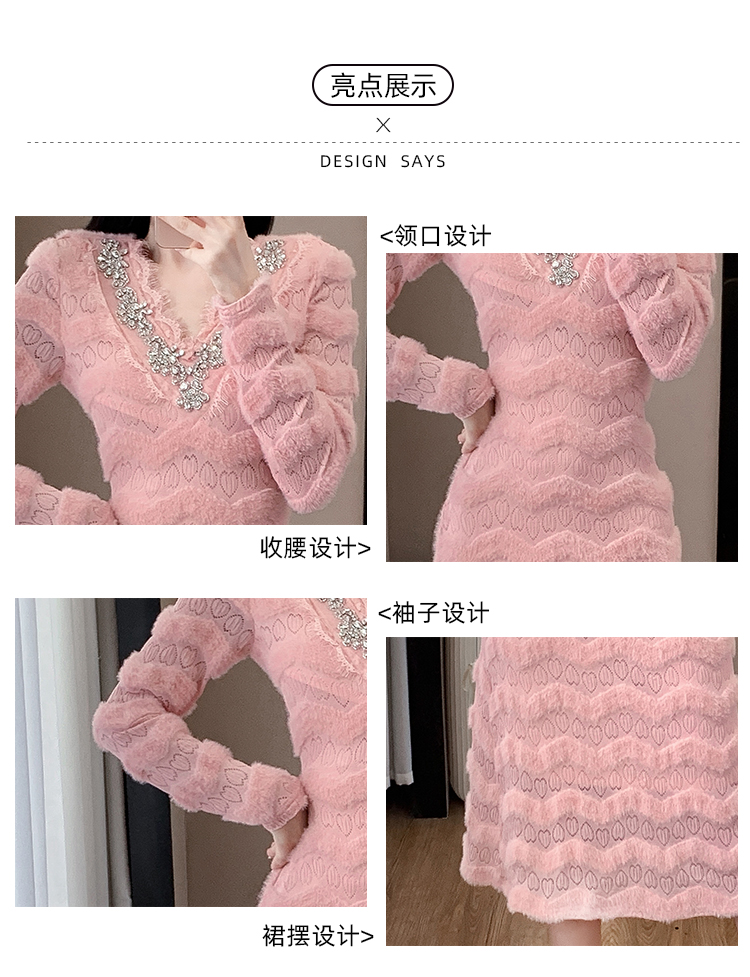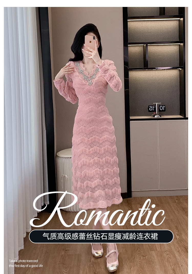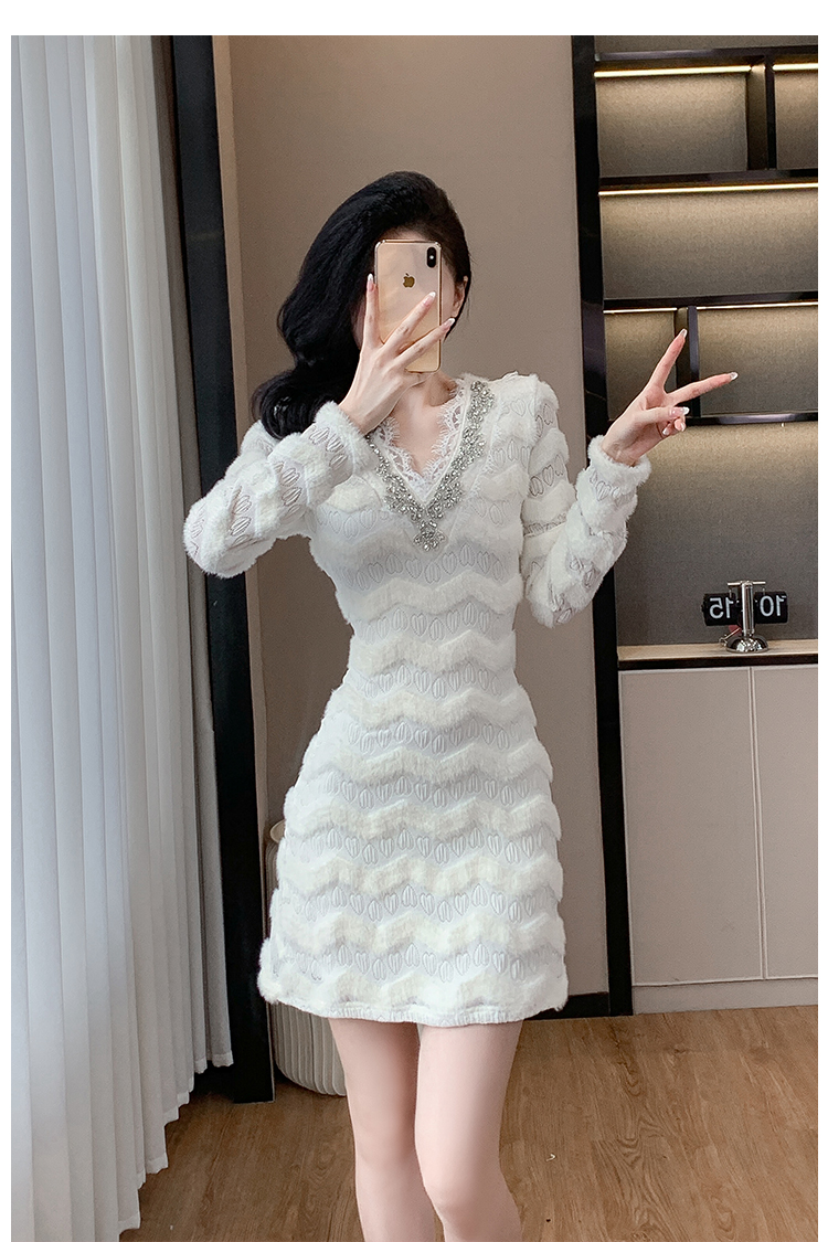 MY17303# 小众设计感收腰显瘦裙子水貂绒拼水钻蕾丝连衣裙女裝貨源服裝批發