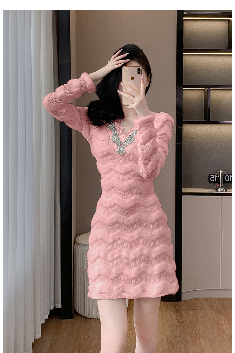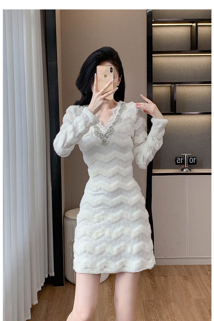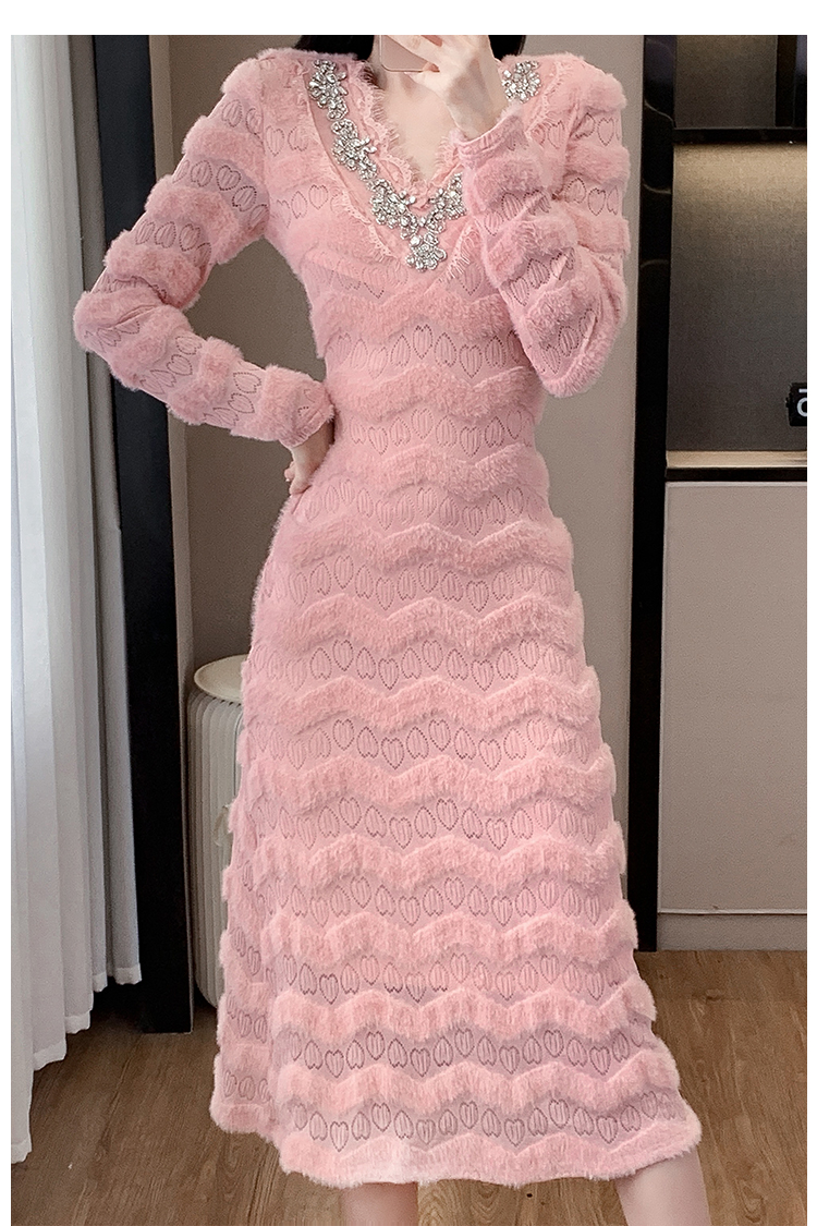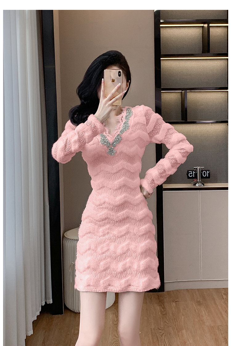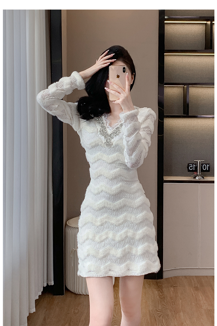MY17303# 小众设计感收腰显瘦裙子水貂绒拼水钻蕾丝连衣裙女裝貨源服裝批發
