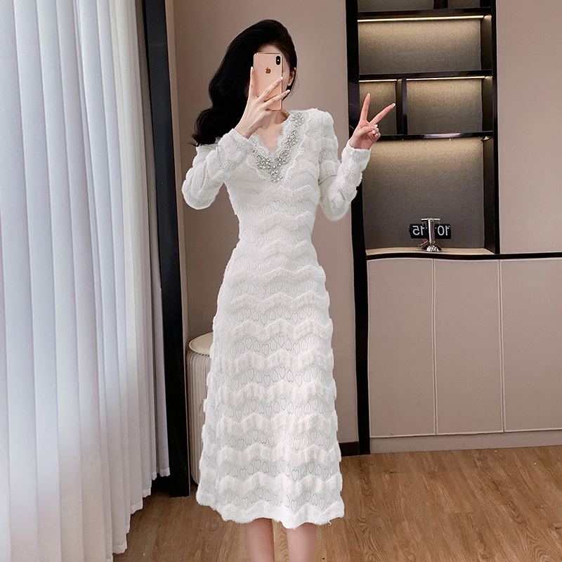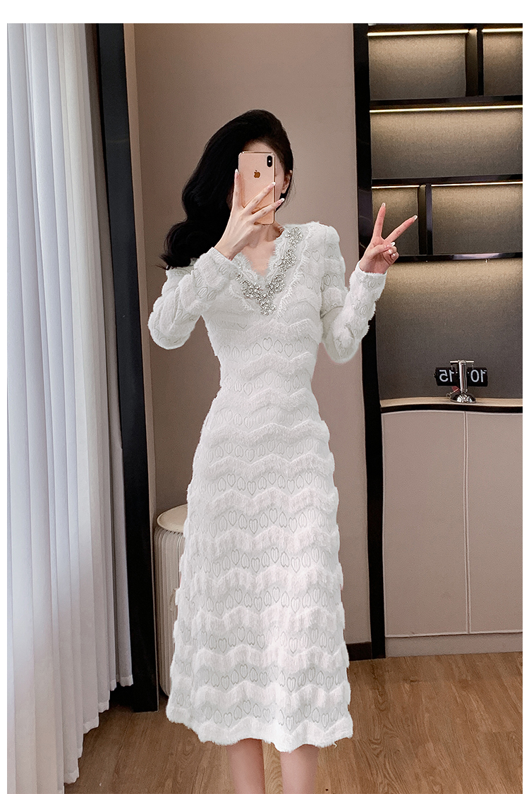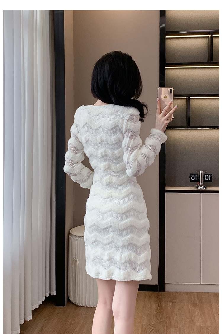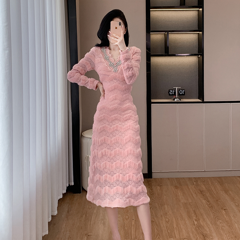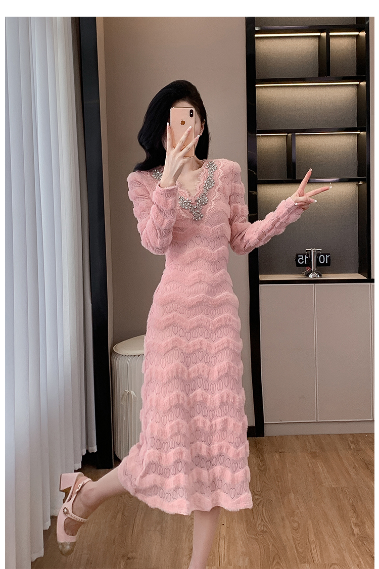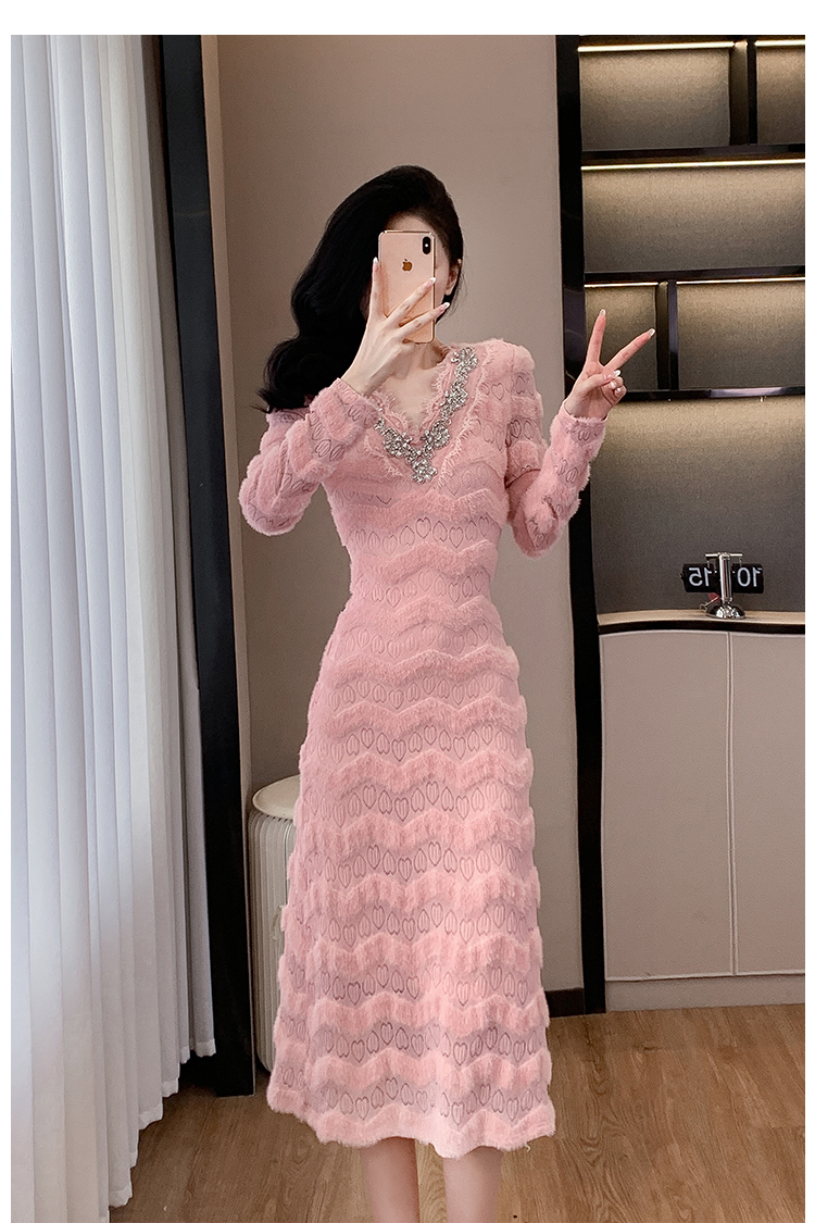 MY17303# 小众设计感收腰显瘦裙子水貂绒拼水钻蕾丝连衣裙女裝貨源服裝批發