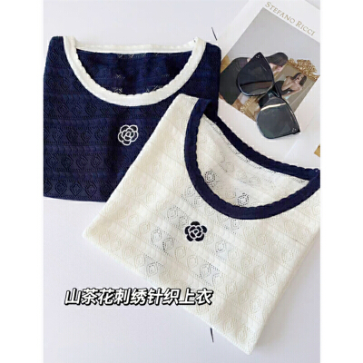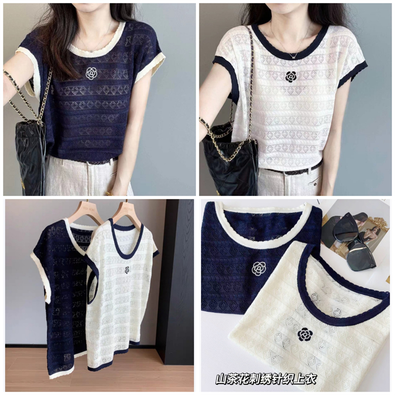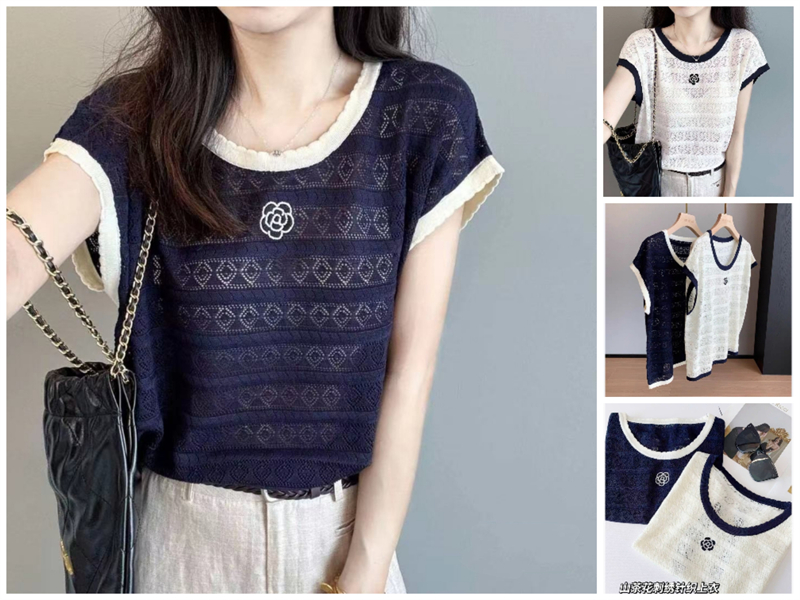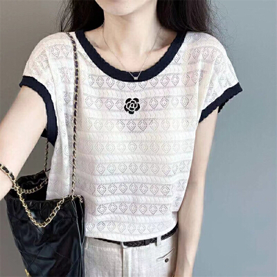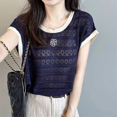 MY17315# 新款撞色镂空花边小飞袖上衣针织衫薄款短袖女夏女裝貨源服裝批發