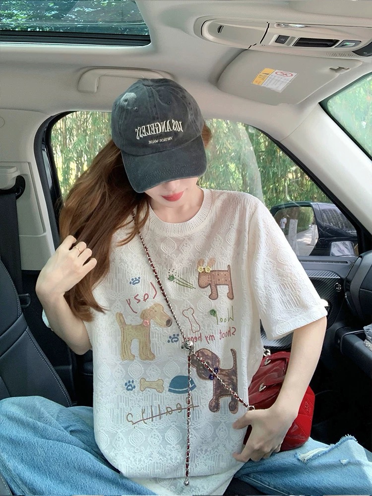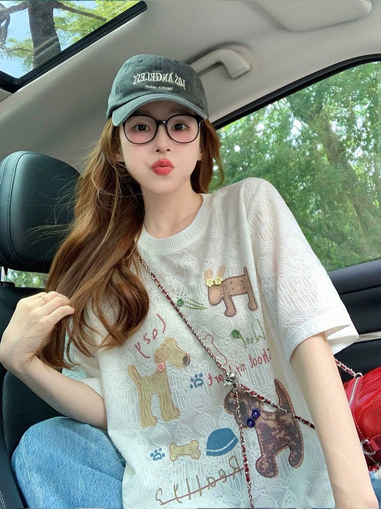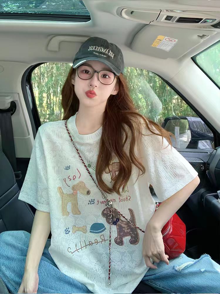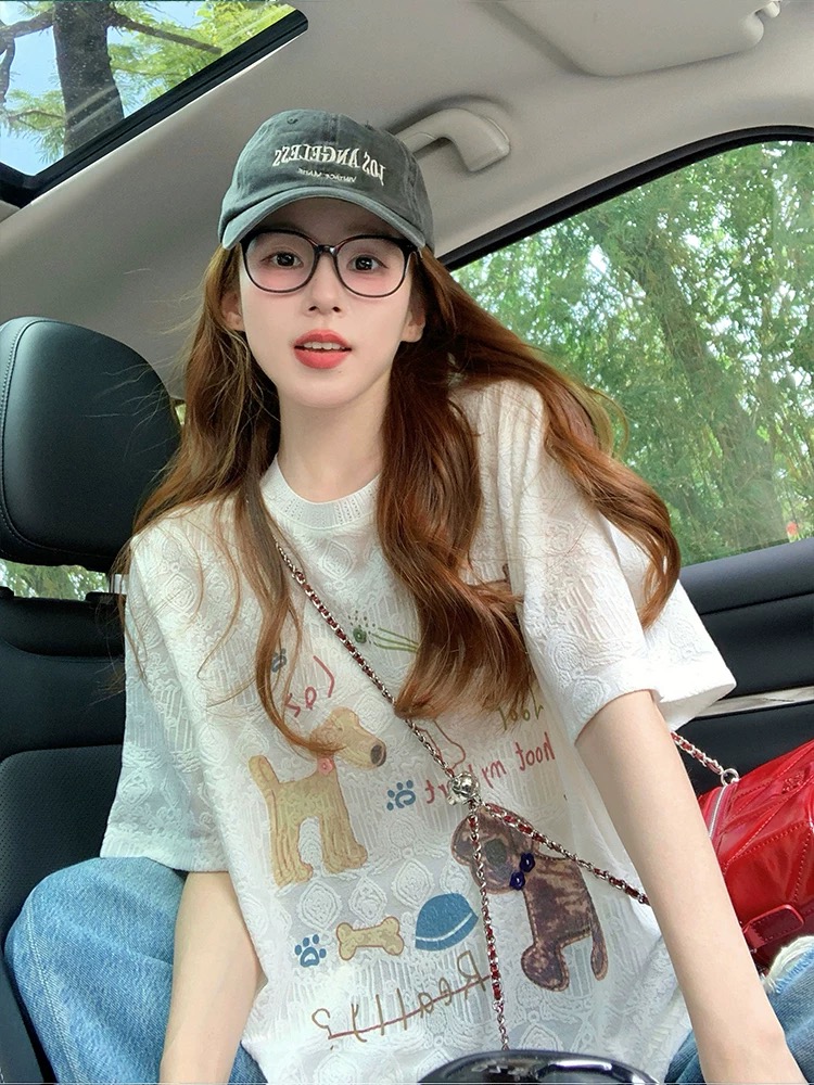 MY17316# 趣味卡通印花蕾丝短袖t恤新款夏季薄款设计感减龄宽松上衣女裝貨源服裝批發