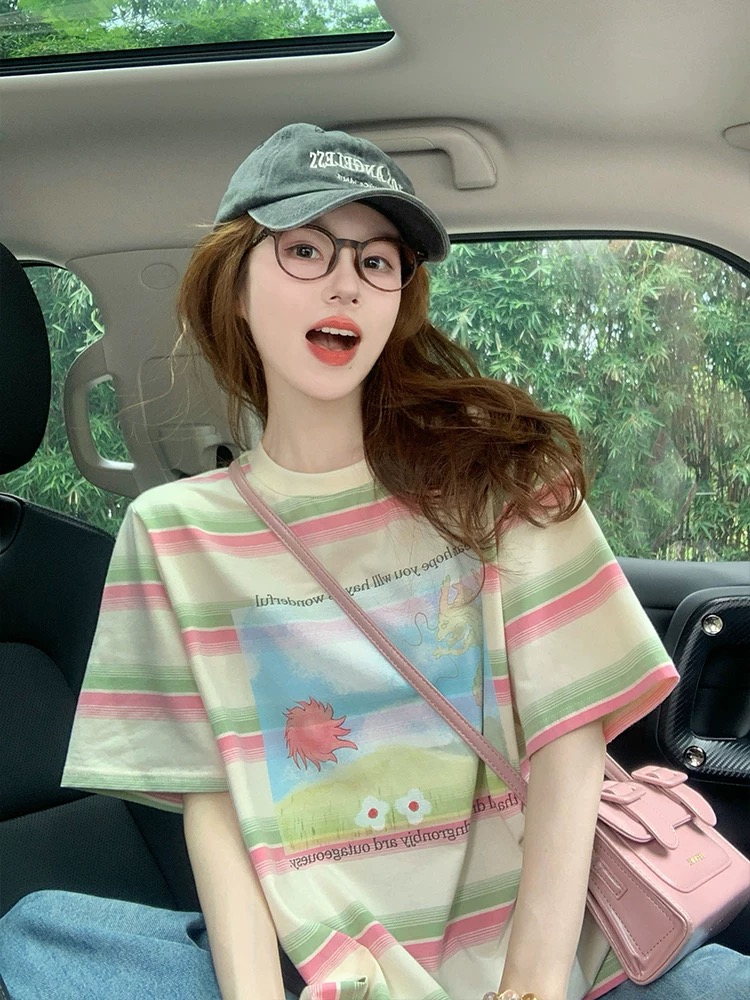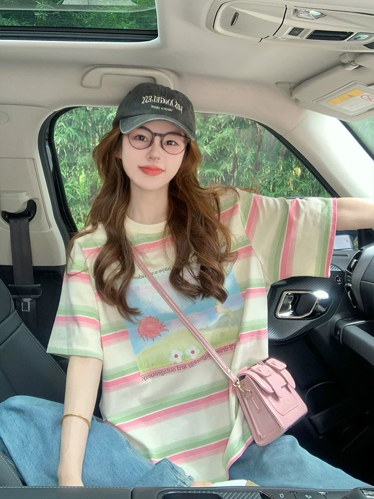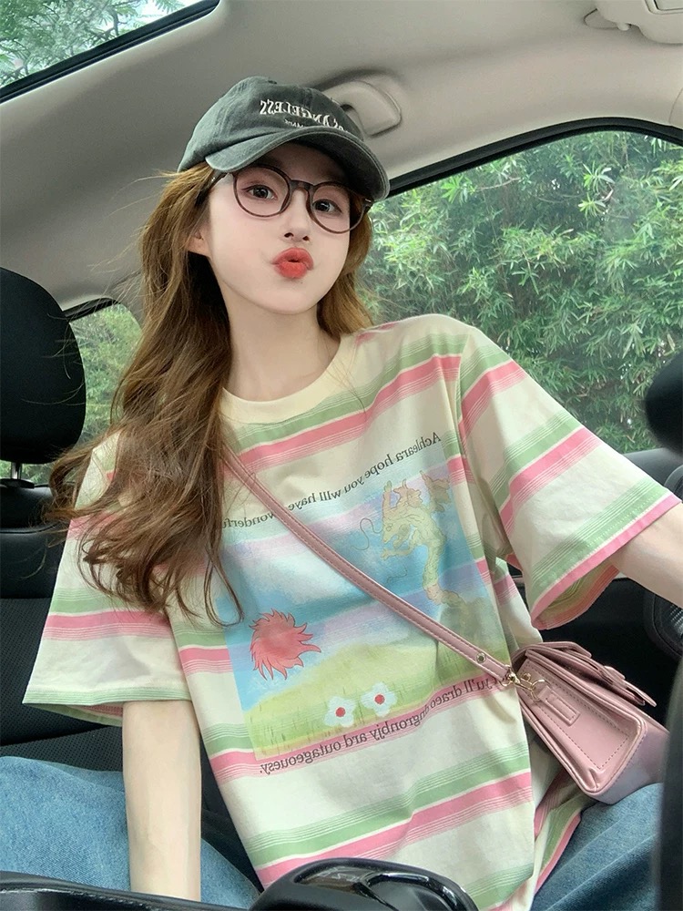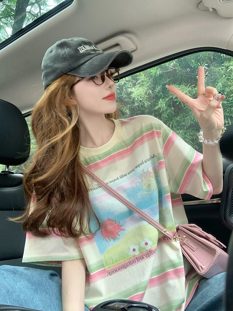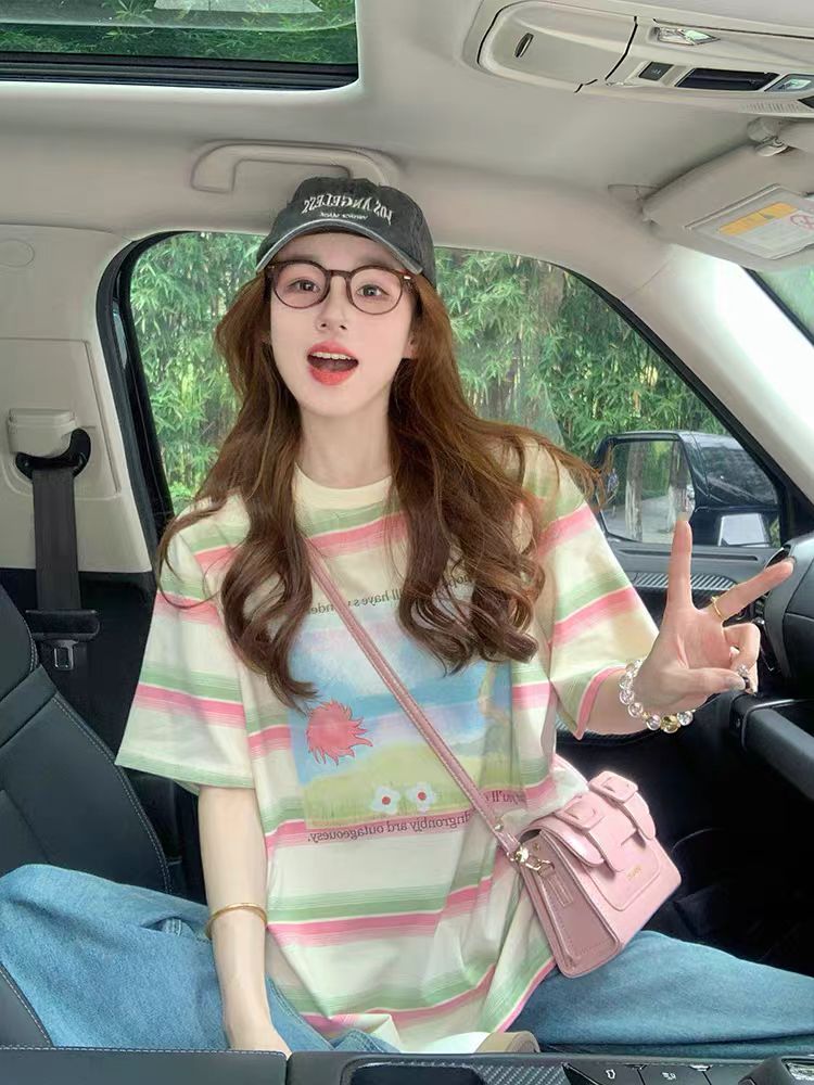 MY17328# 设计感彩色条纹短袖t恤新款夏季美式宽松减龄小众印花上衣女裝貨源服裝批發