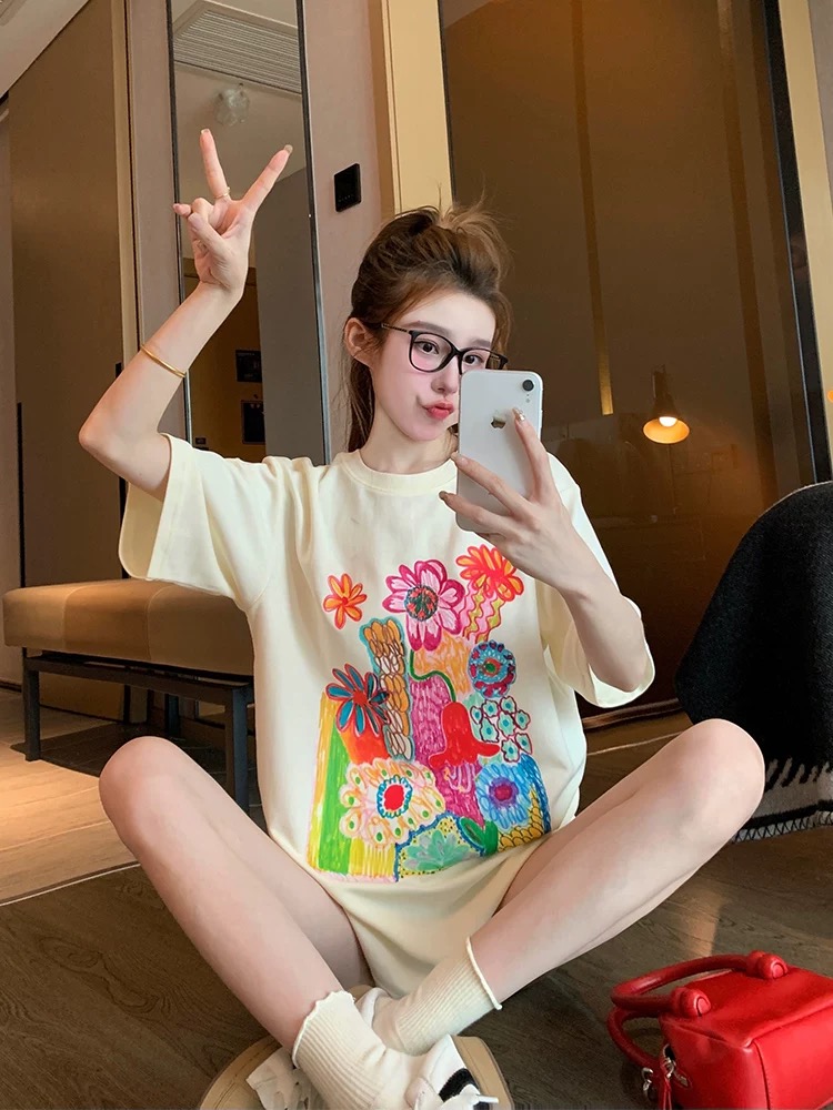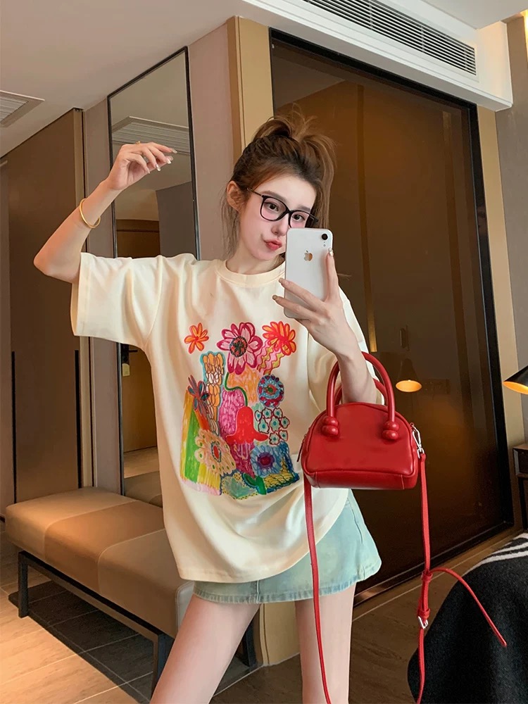 MY17333# 美式复古短袖t恤女夏季欧货大版宽松休闲小个子体恤上衣超好看ins女裝貨源服裝批發
