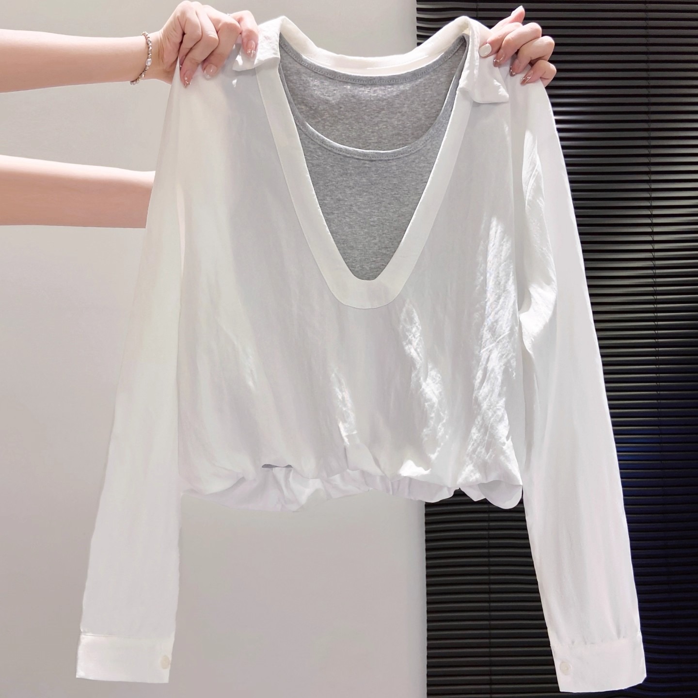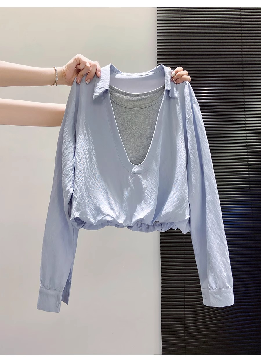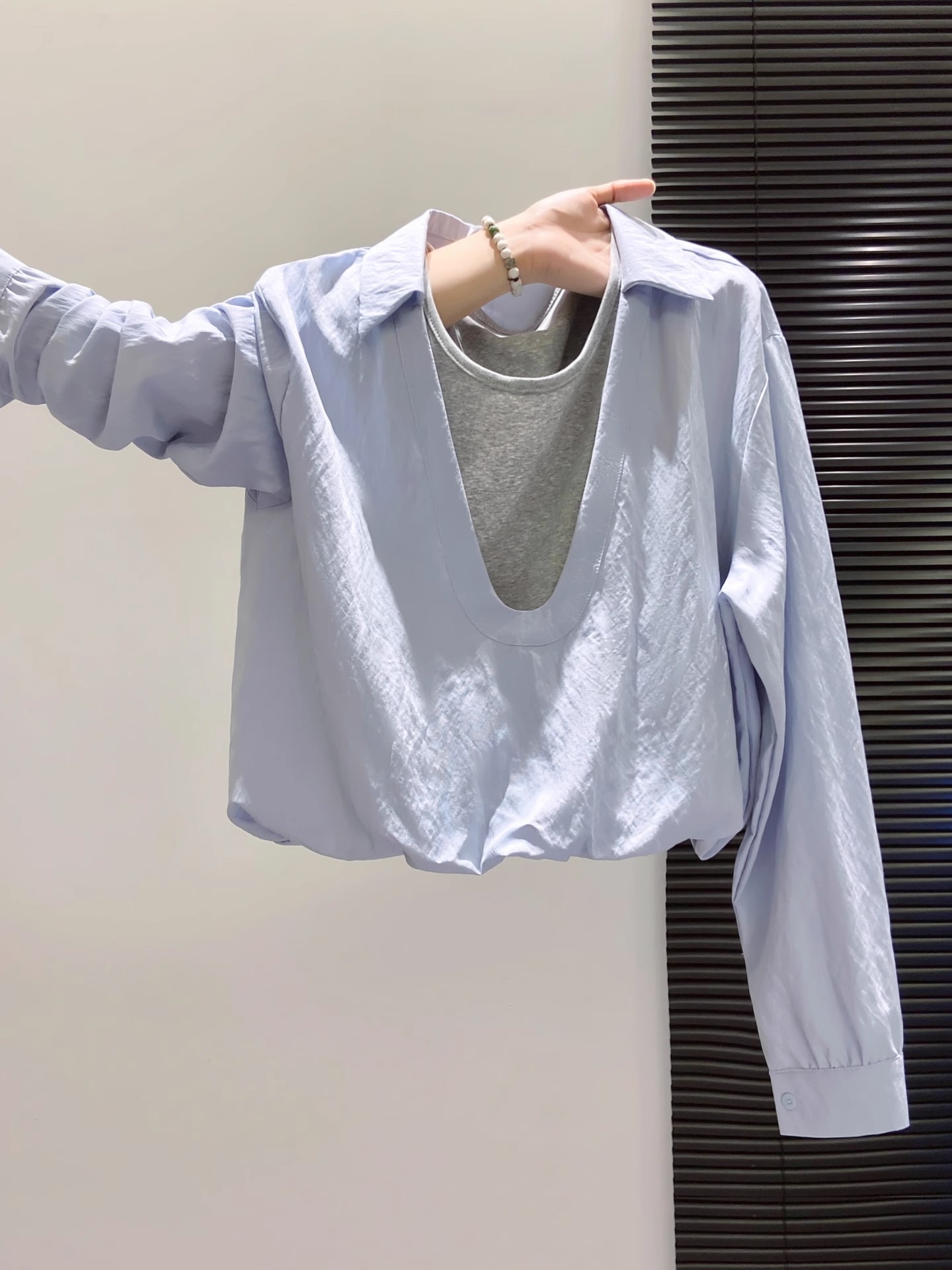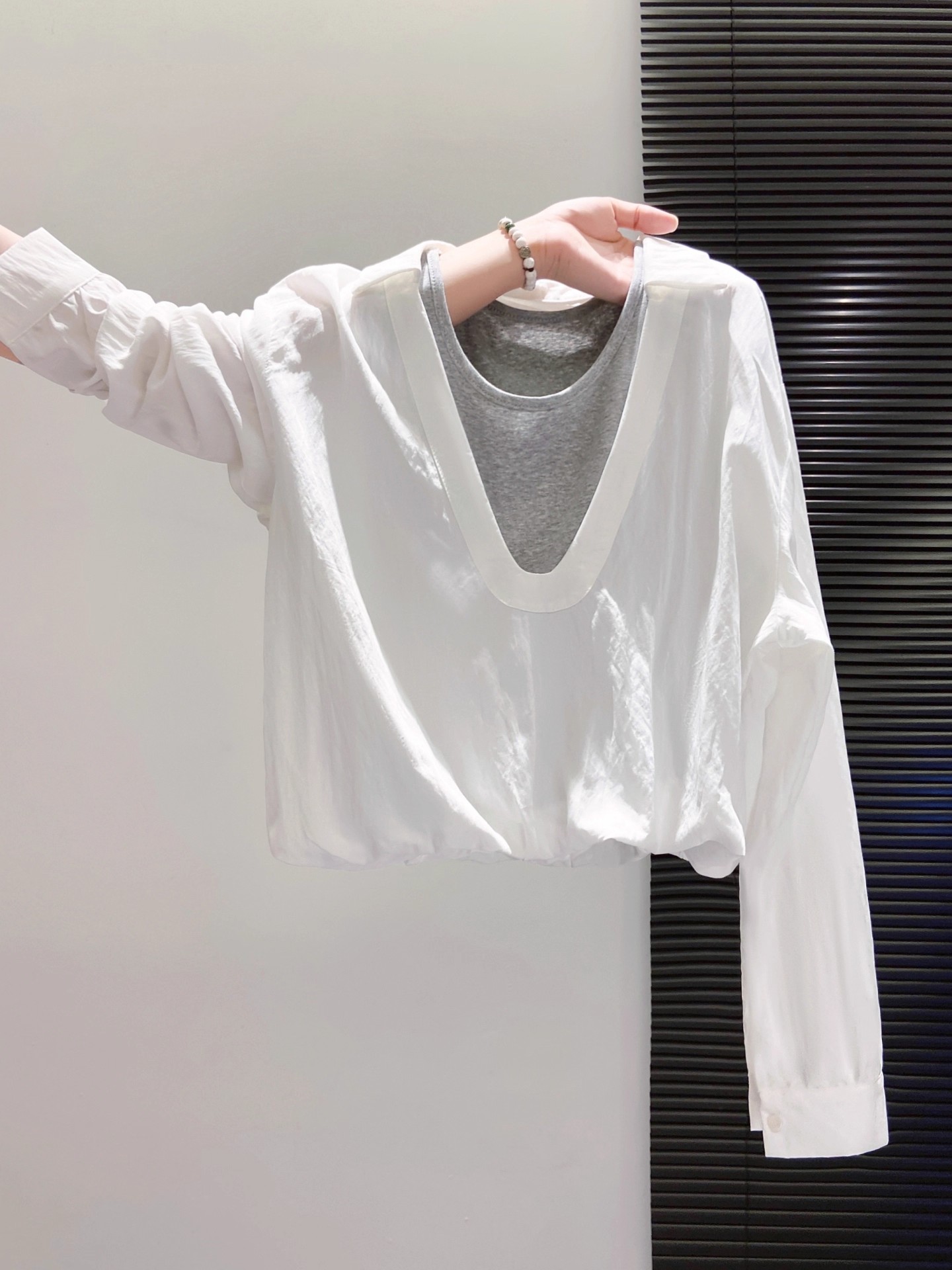 MY17343# 设计感拼接假两件长袖衬衫新款V领宽松显瘦气质小上衣女裝貨源服裝批發