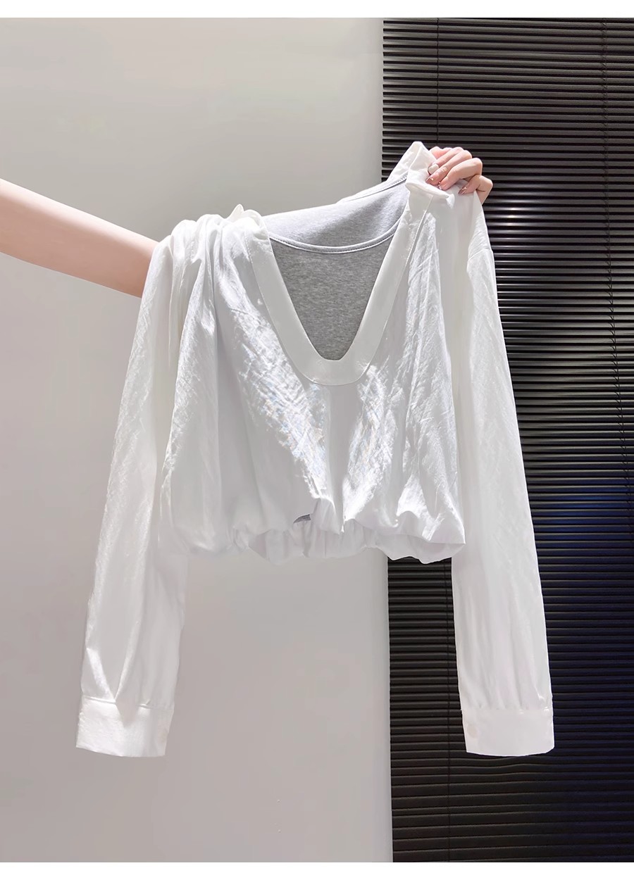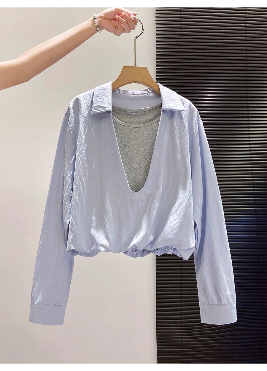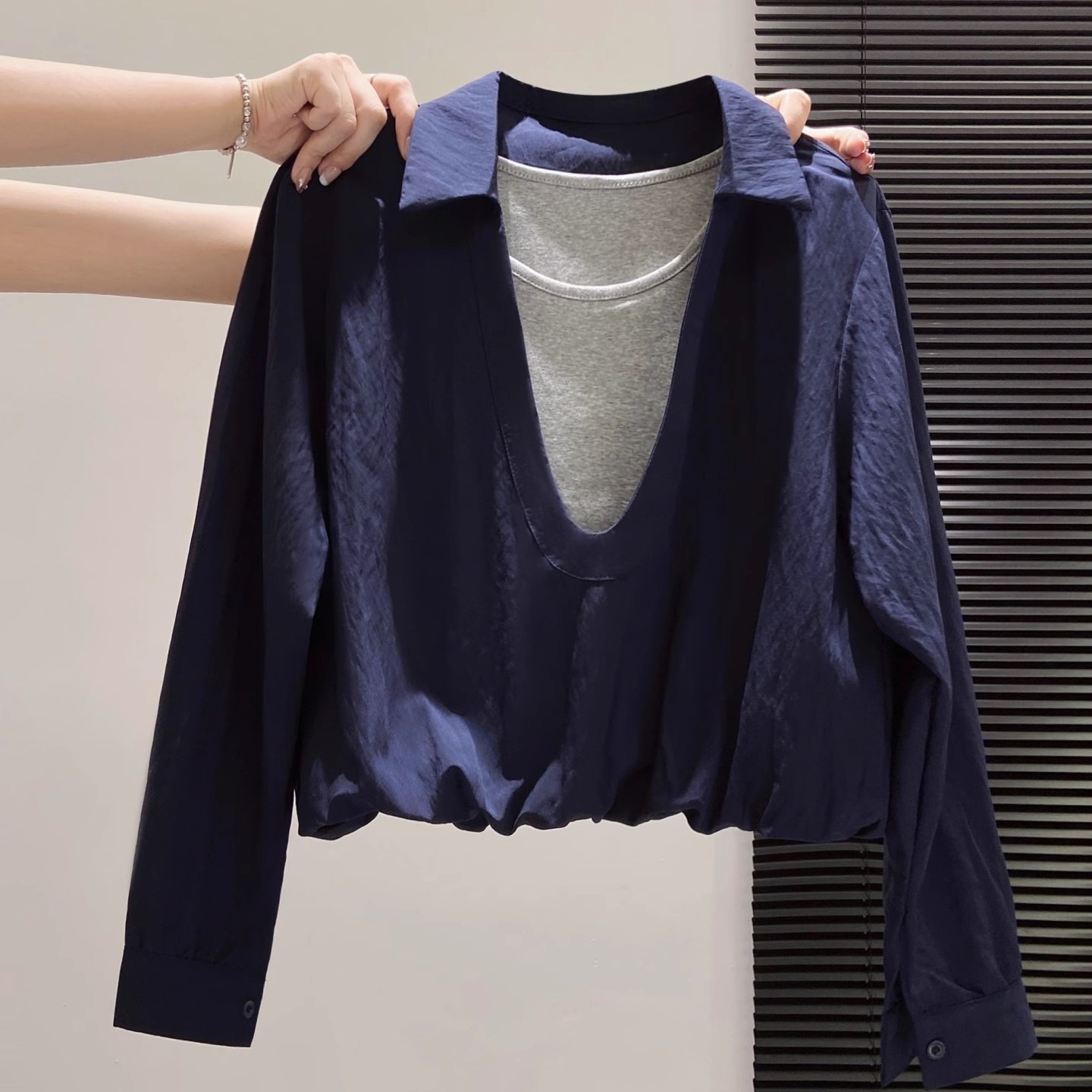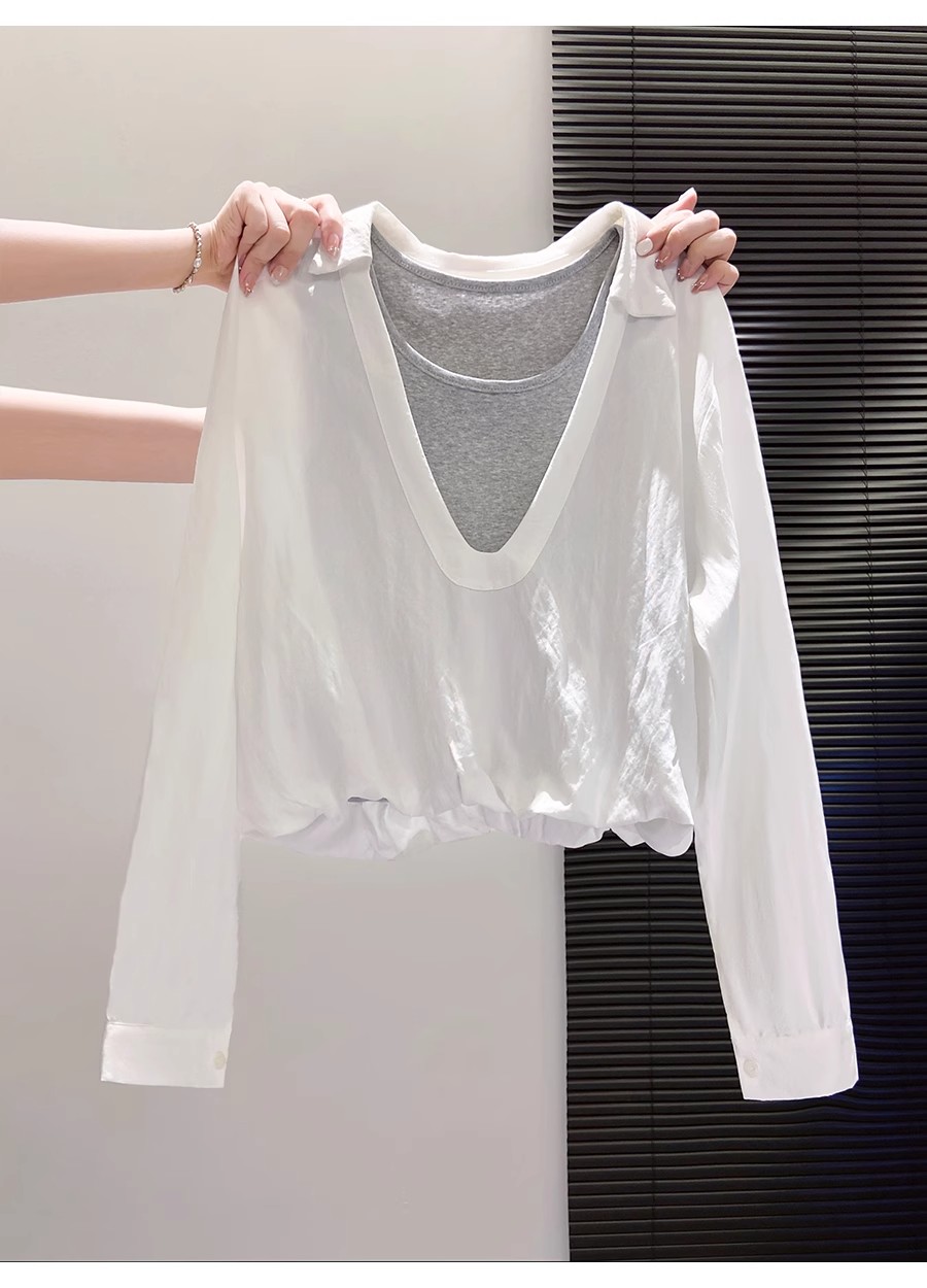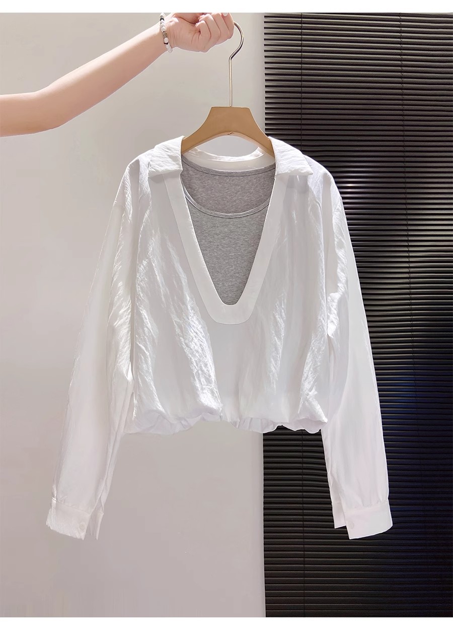 MY17343# 设计感拼接假两件长袖衬衫新款V领宽松显瘦气质小上衣女裝貨源服裝批發