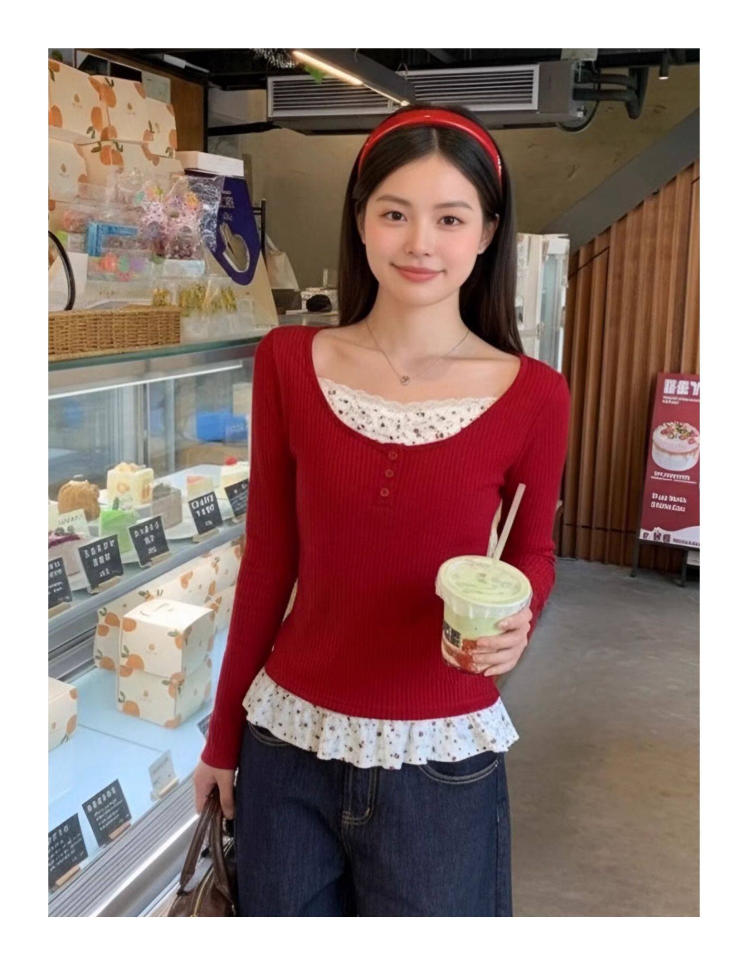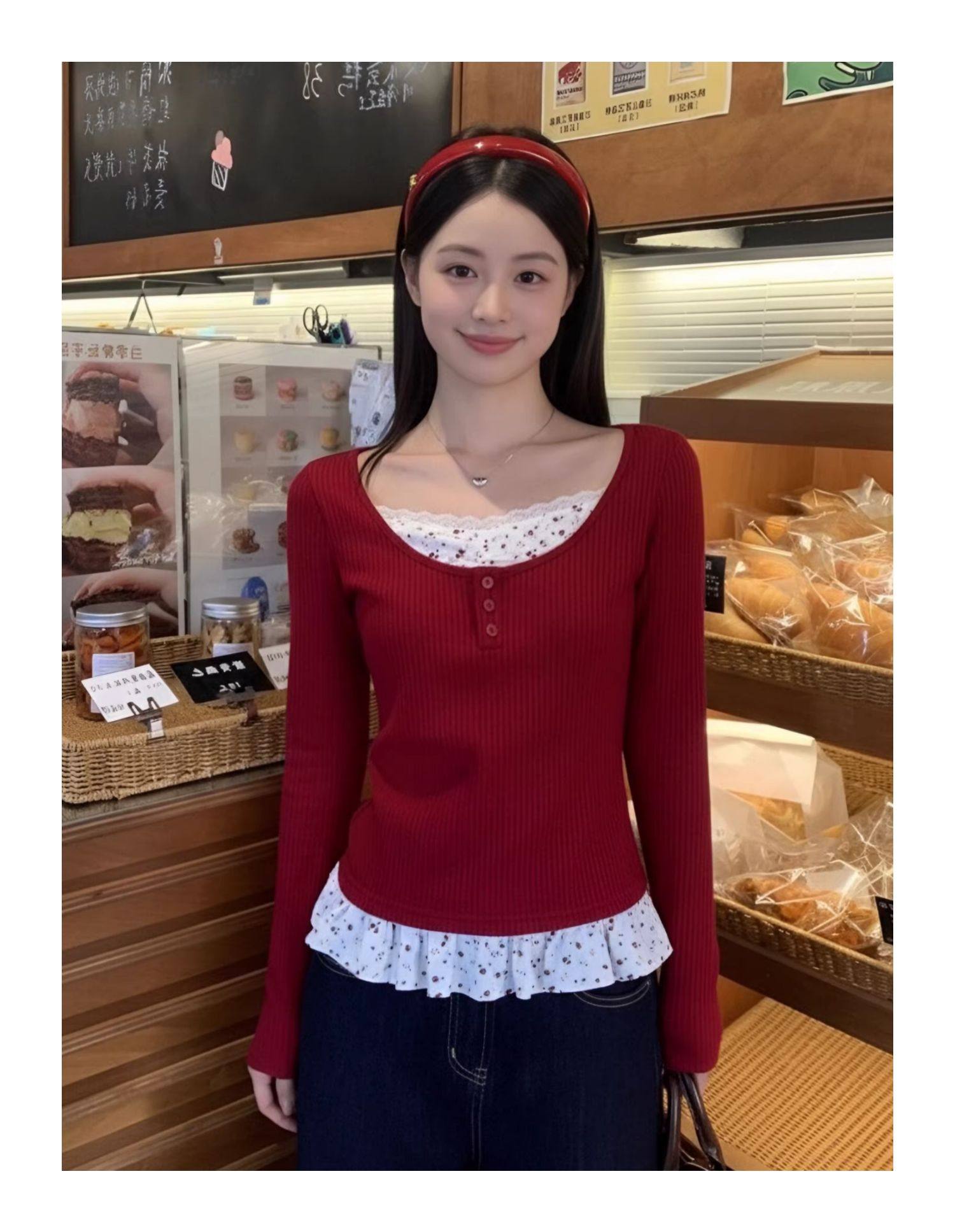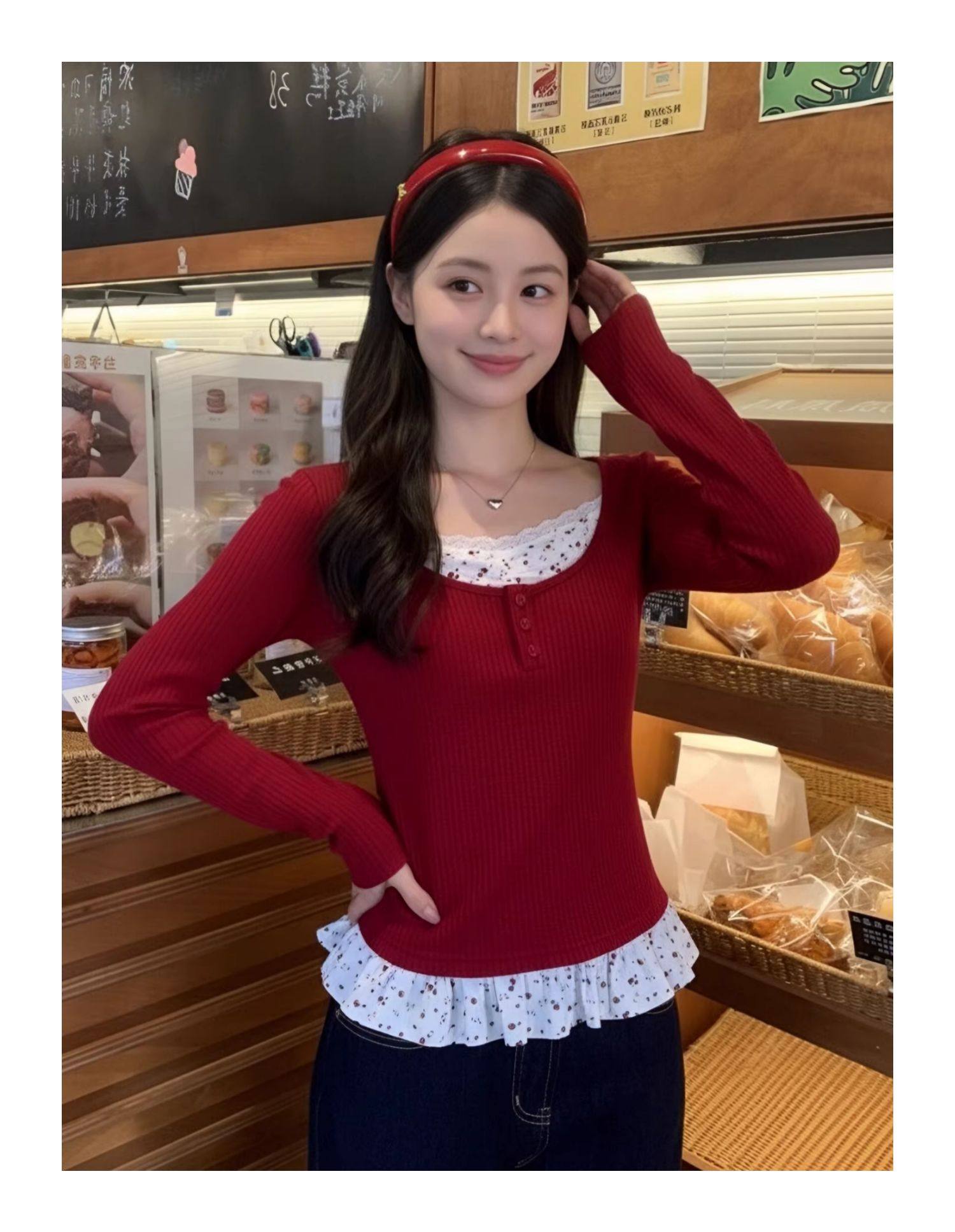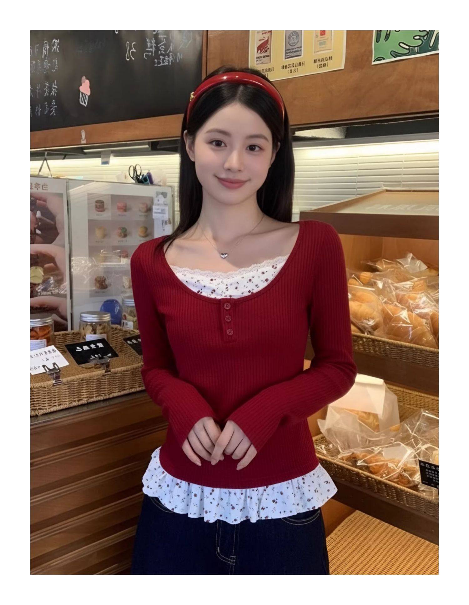 MY17345# 羊绒韩系复古碎花长袖t恤穿搭假两件内搭修身显瘦上衣女裝貨源服裝批發