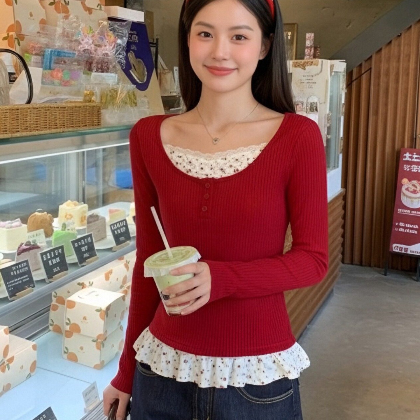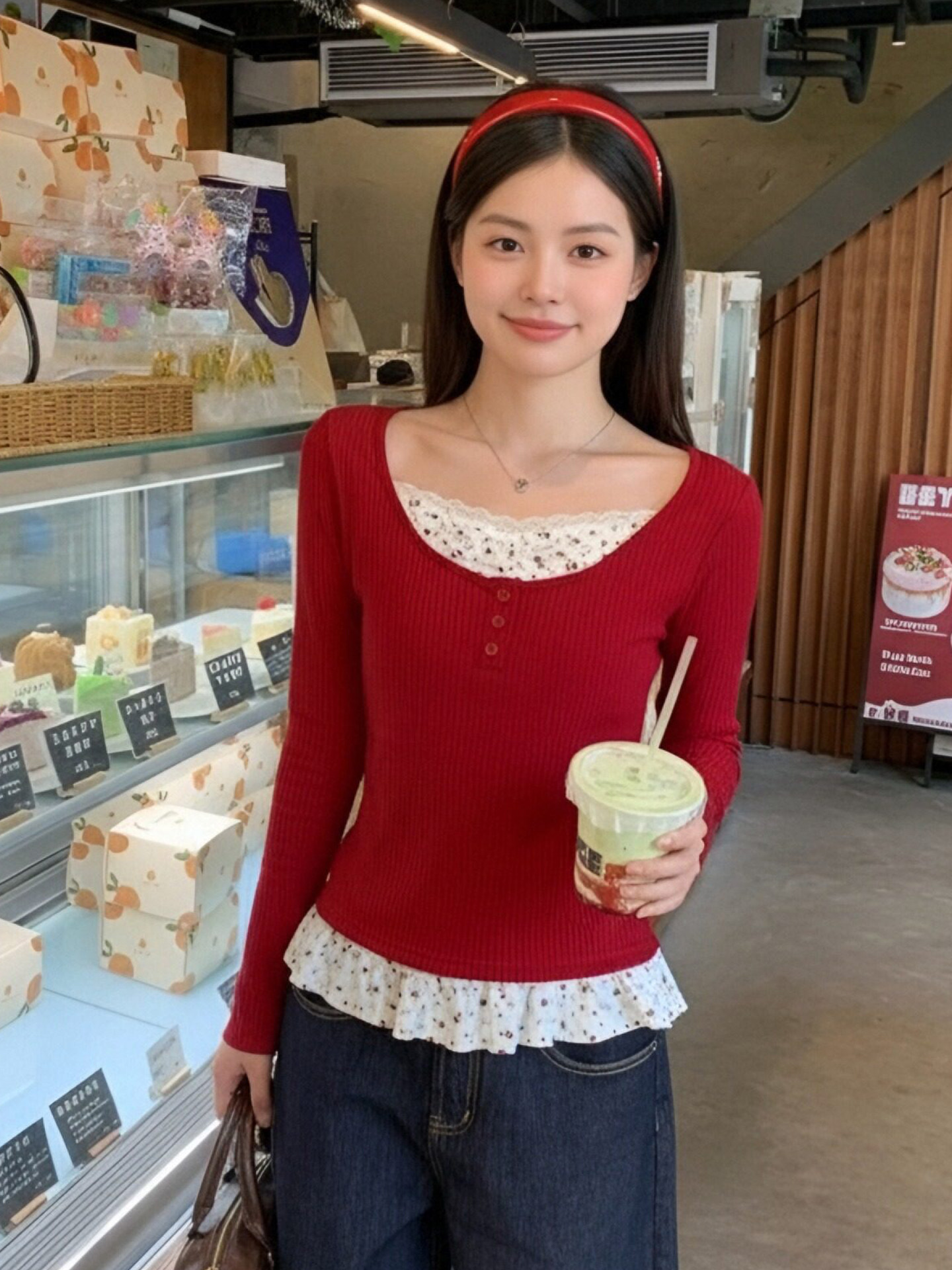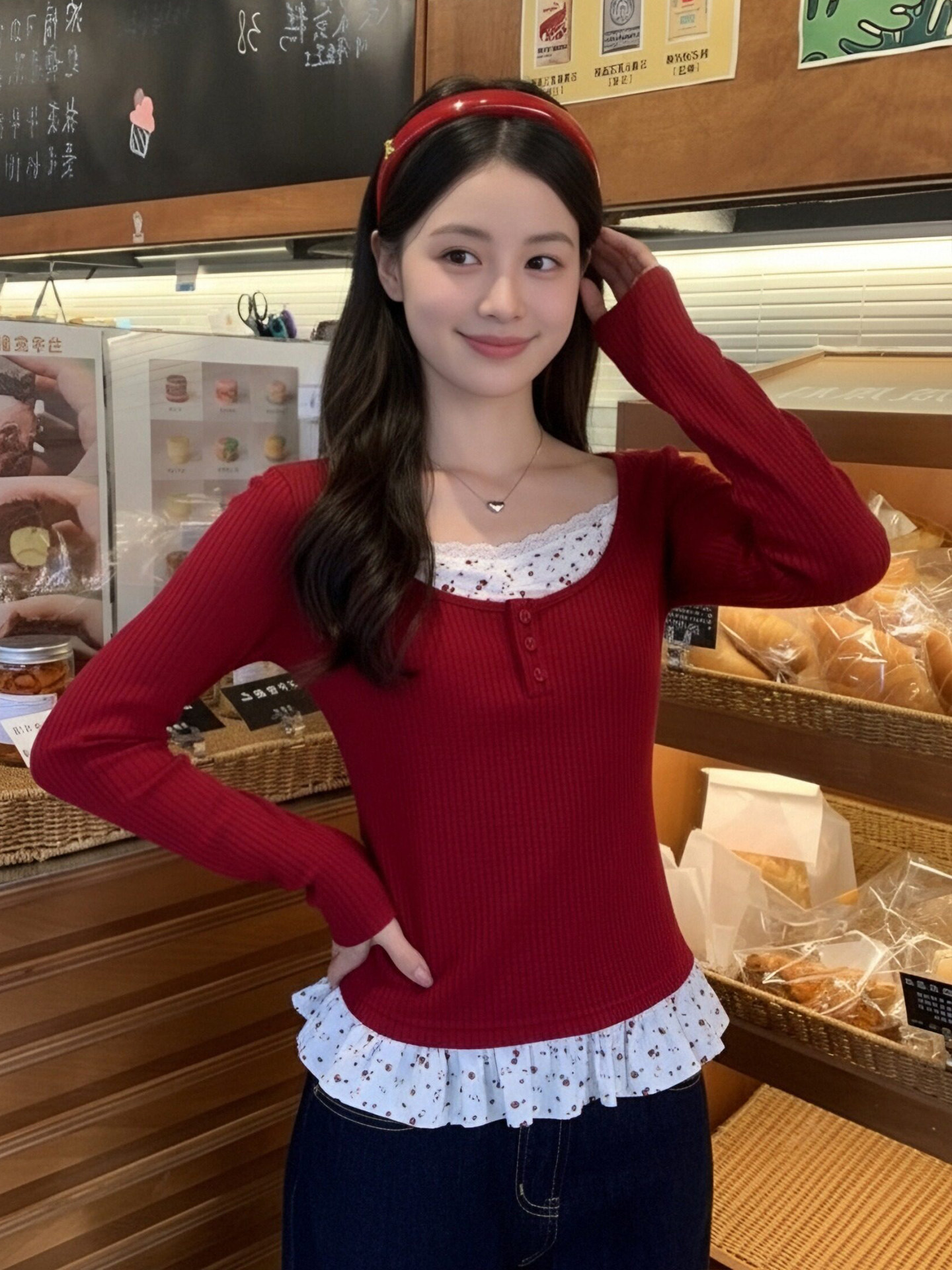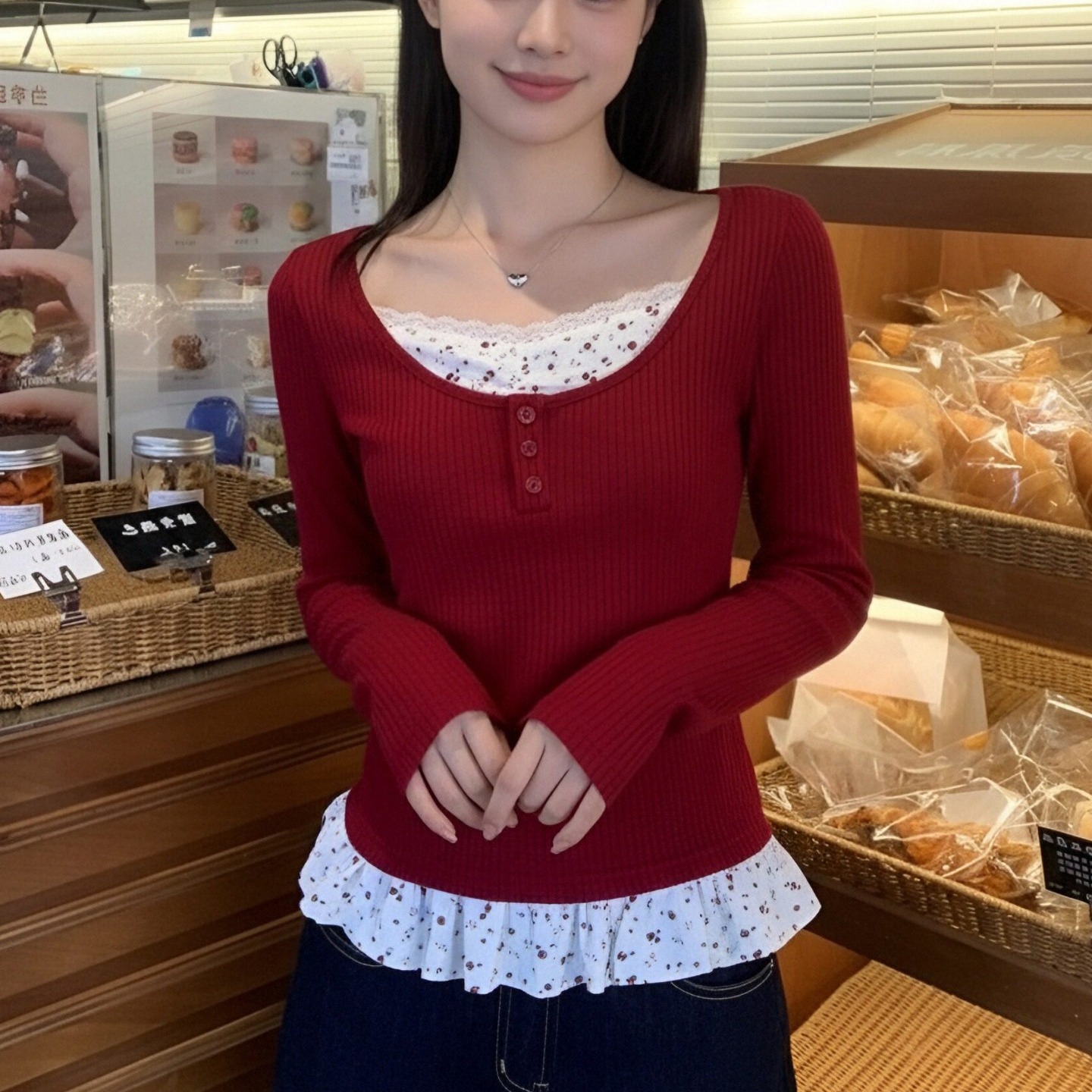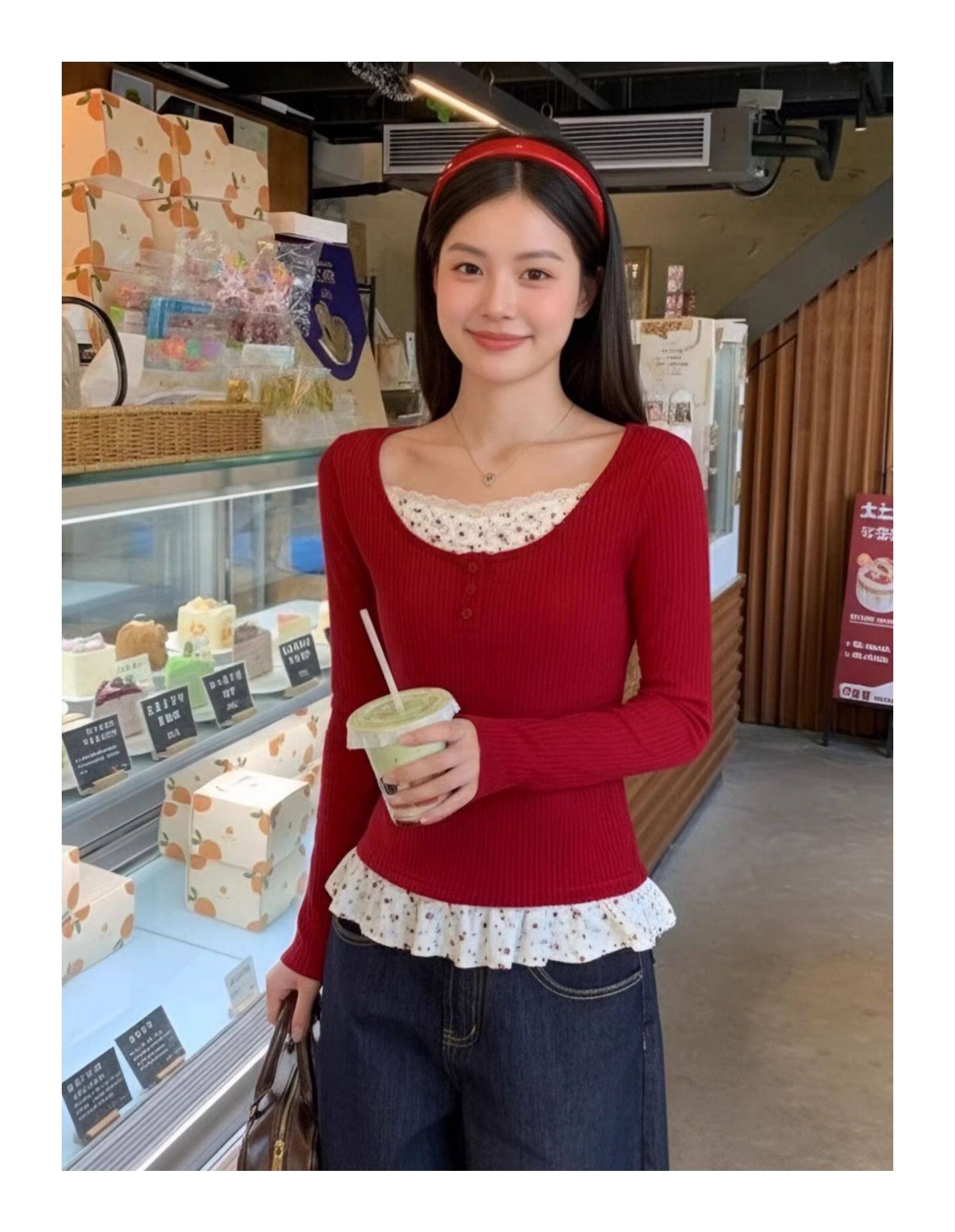 MY17345# 羊绒韩系复古碎花长袖t恤穿搭假两件内搭修身显瘦上衣女裝貨源服裝批發