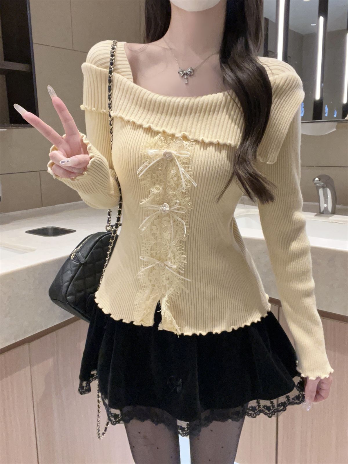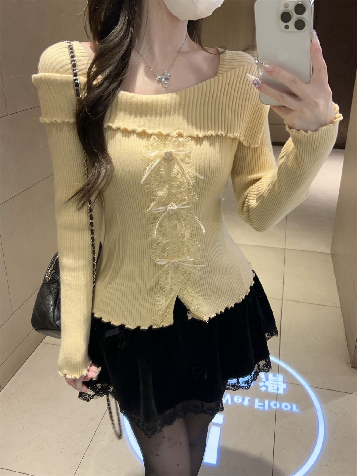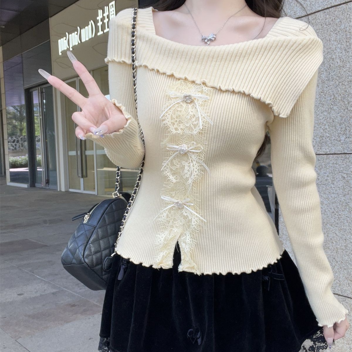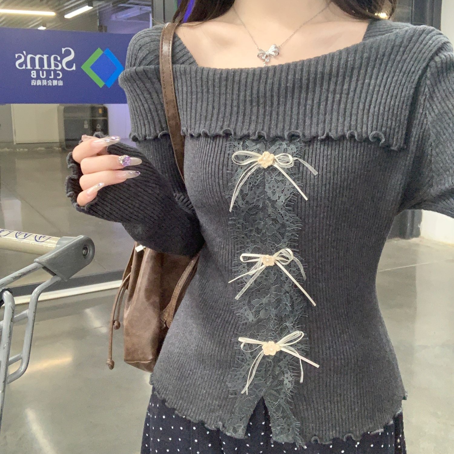 MY17347# 安迪绒纯欲木耳边针织衫新款蕾丝拼接蝴蝶结打底衫毛衣女裝貨源服裝批發