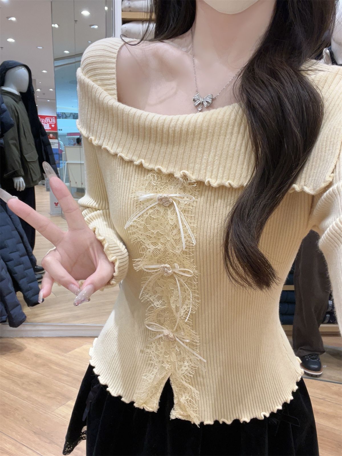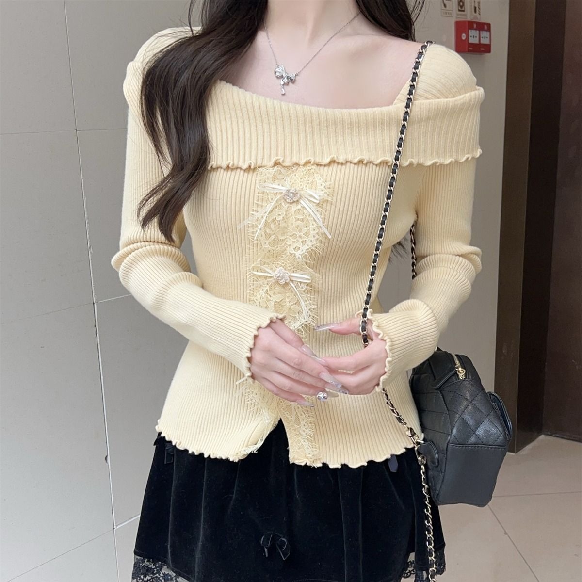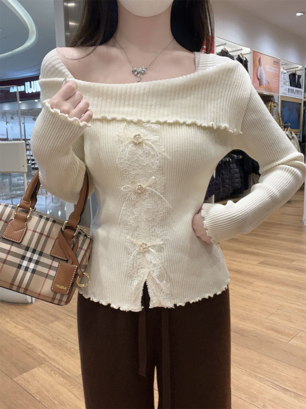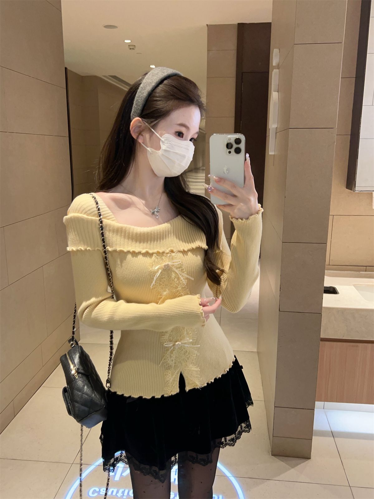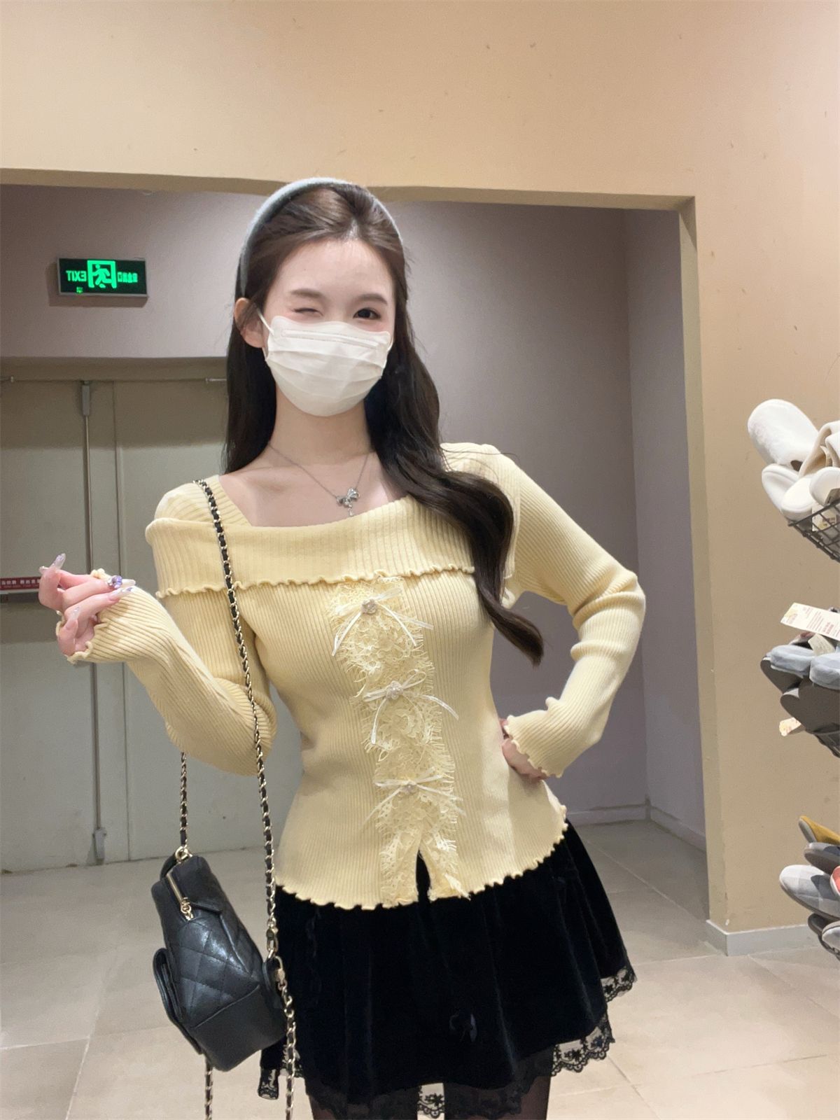 MY17347# 安迪绒纯欲木耳边针织衫新款蕾丝拼接蝴蝶结打底衫毛衣女裝貨源服裝批發