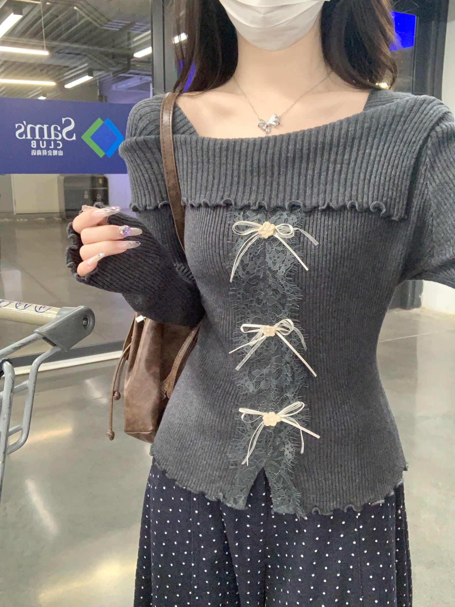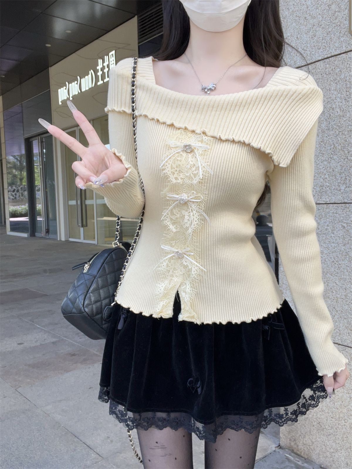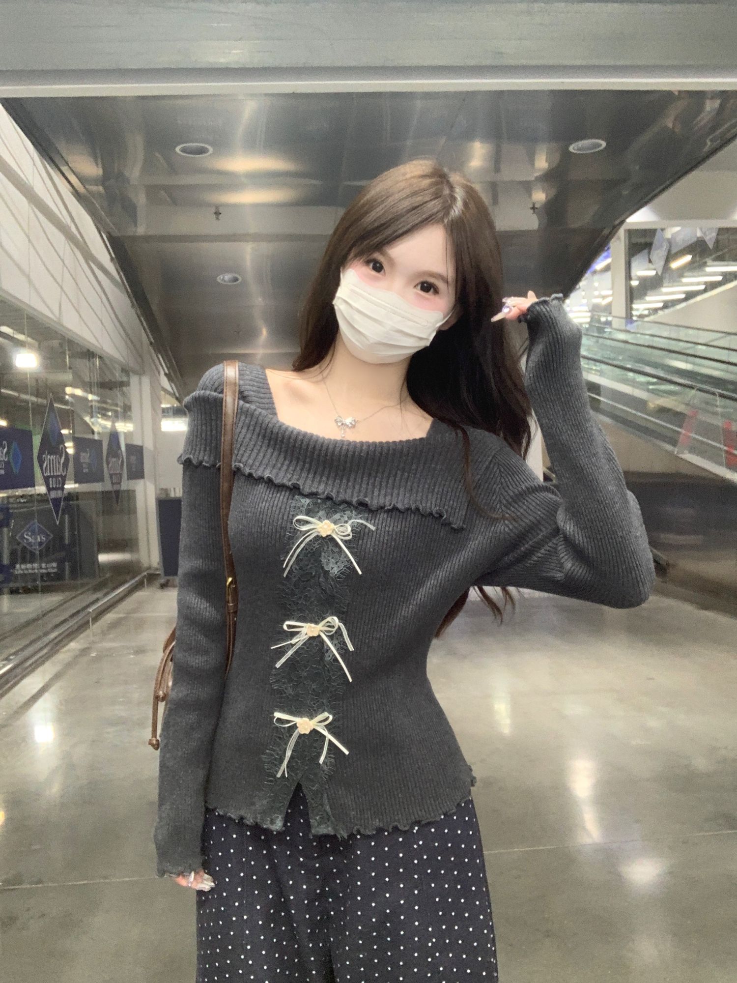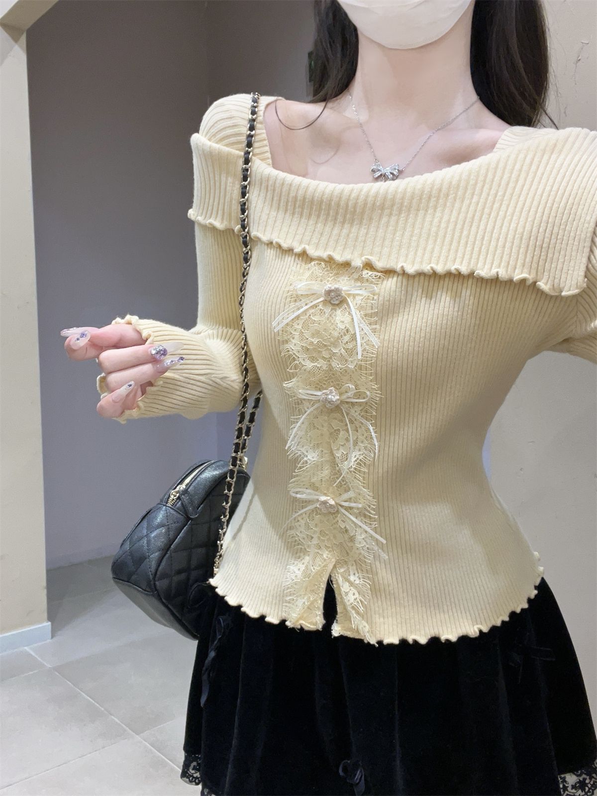 MY17347# 安迪绒纯欲木耳边针织衫新款蕾丝拼接蝴蝶结打底衫毛衣女裝貨源服裝批發