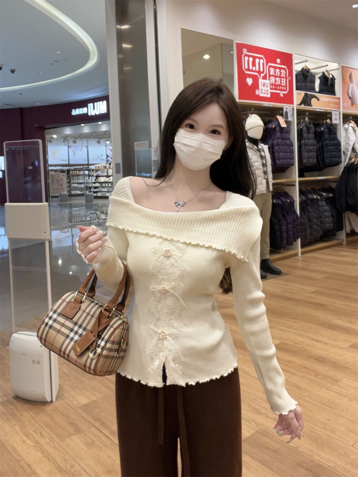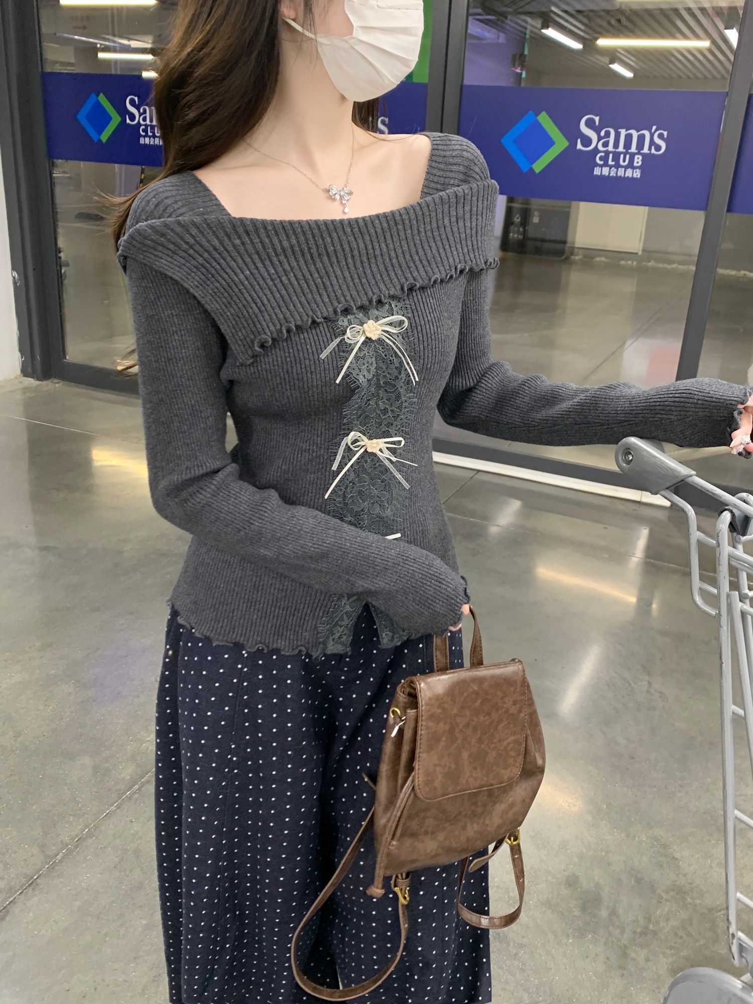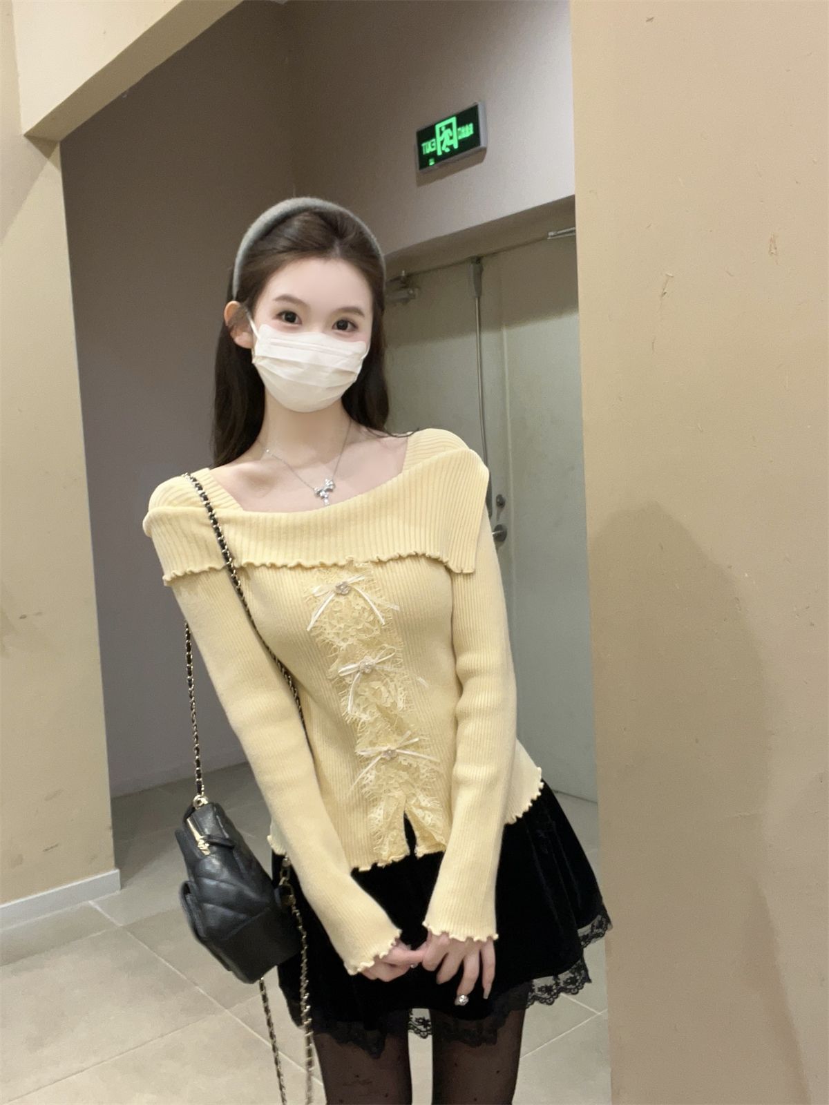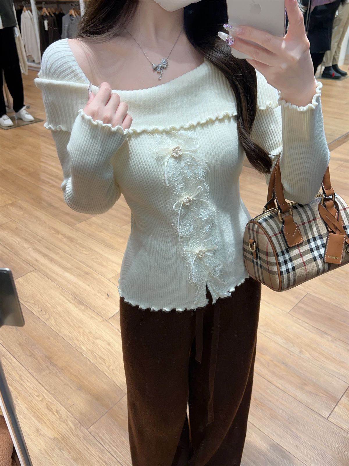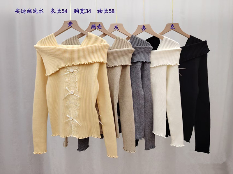 MY17347# 安迪绒纯欲木耳边针织衫新款蕾丝拼接蝴蝶结打底衫毛衣女裝貨源服裝批發