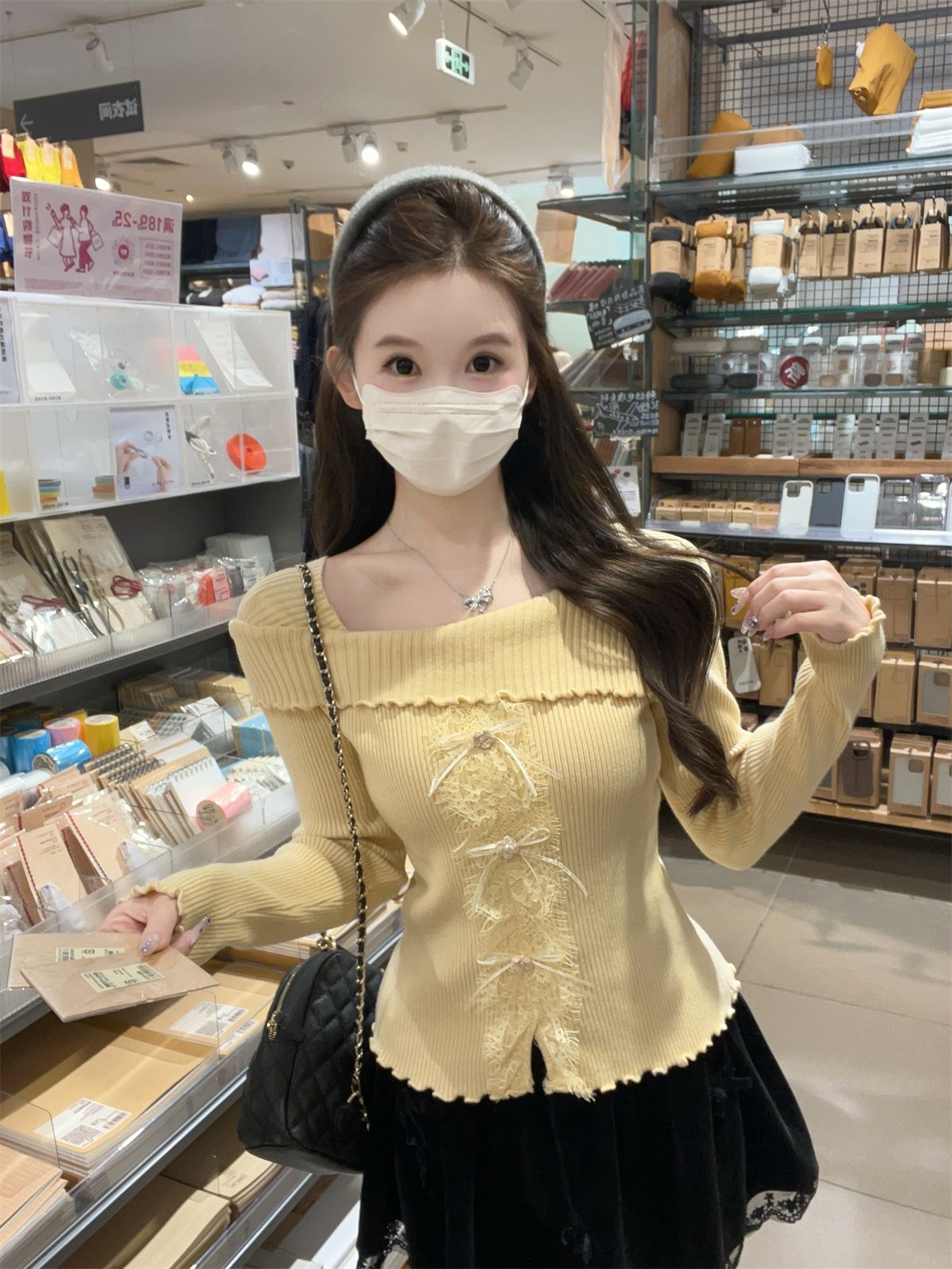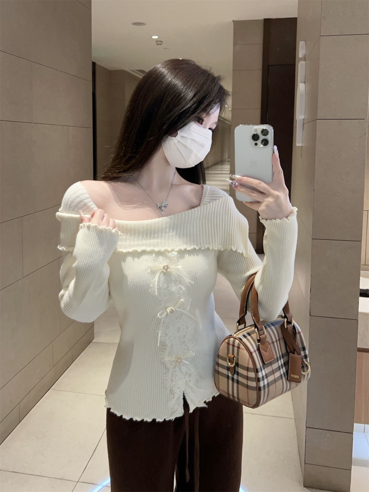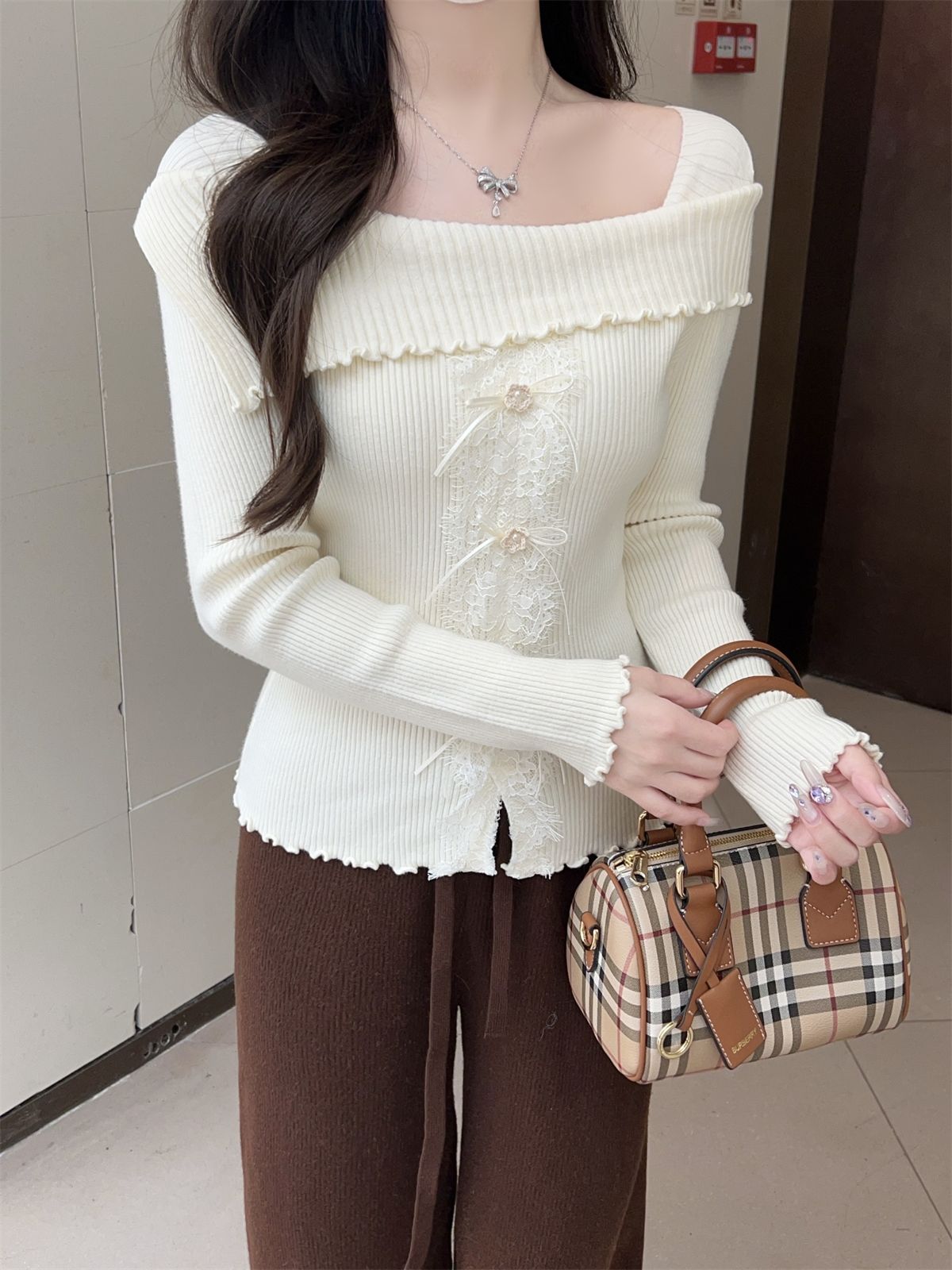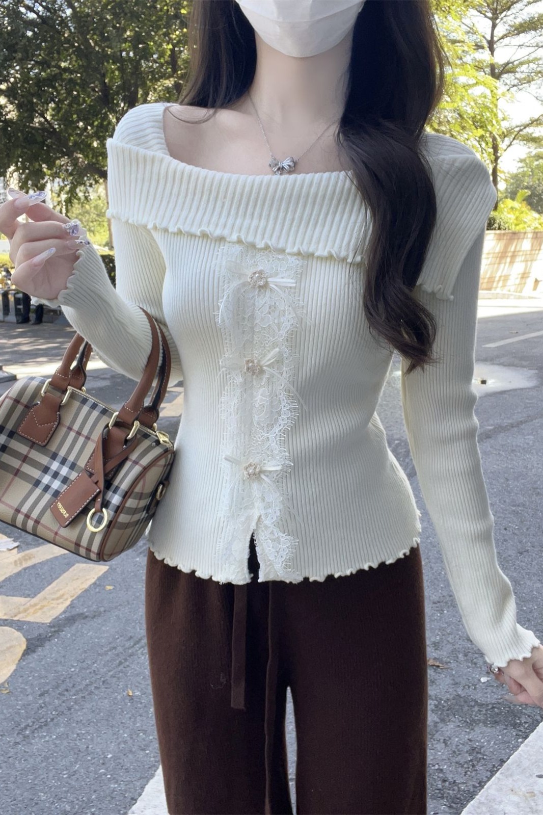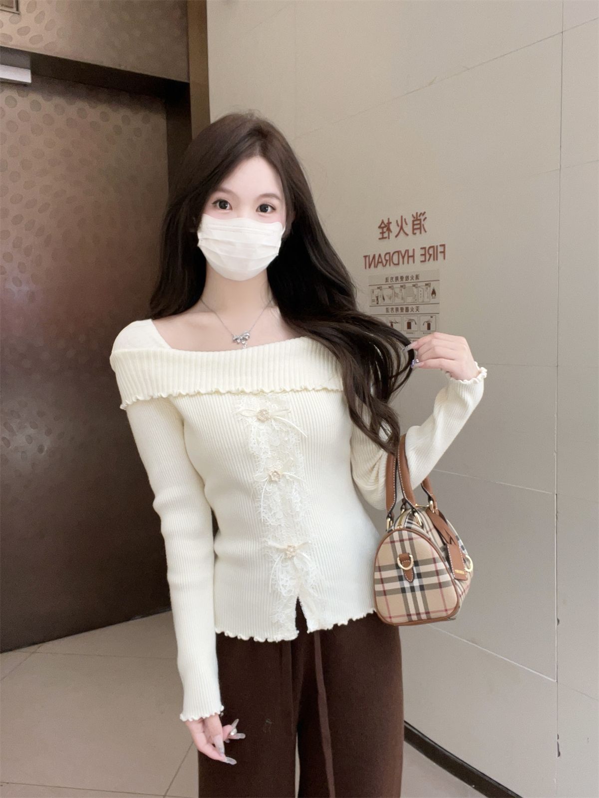MY17347# 安迪绒纯欲木耳边针织衫新款蕾丝拼接蝴蝶结打底衫毛衣女裝貨源服裝批發