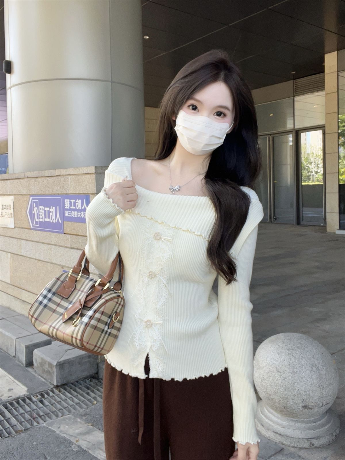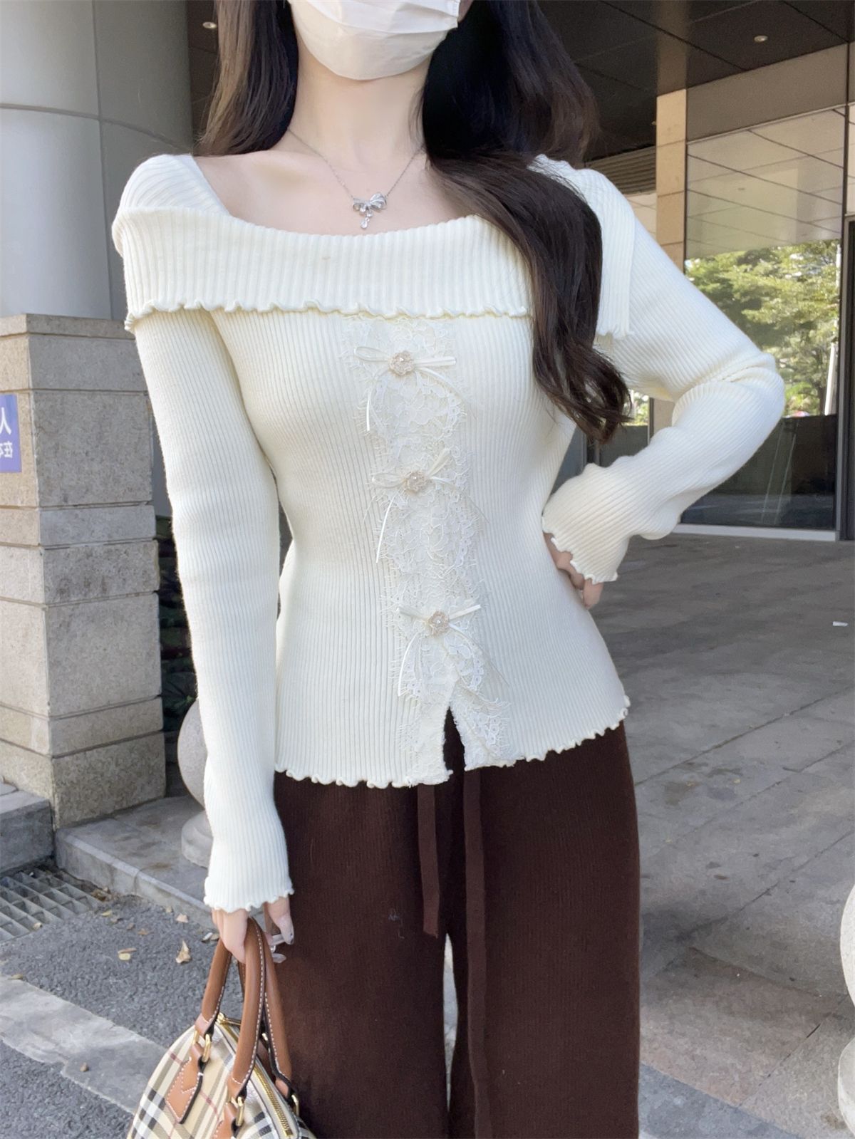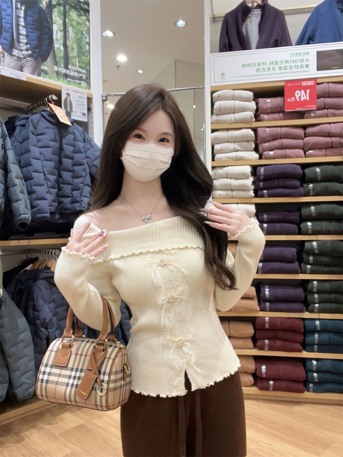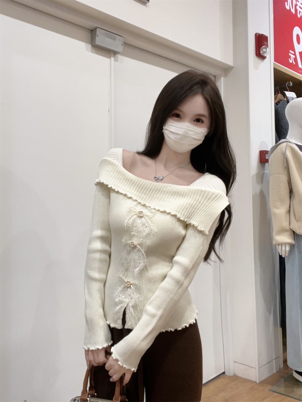 MY17347# 安迪绒纯欲木耳边针织衫新款蕾丝拼接蝴蝶结打底衫毛衣女裝貨源服裝批發