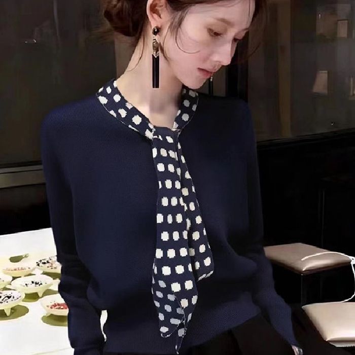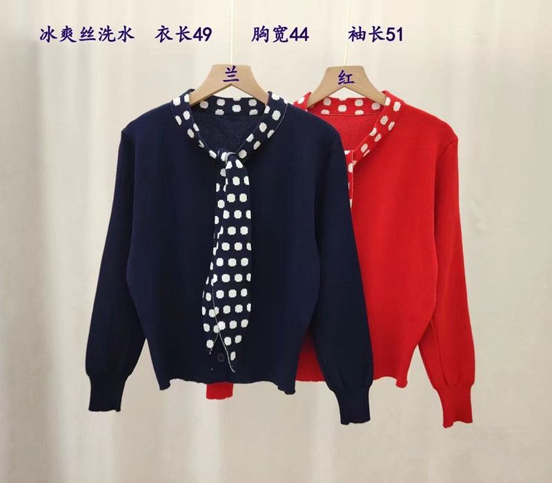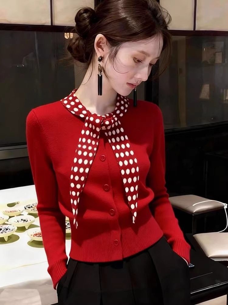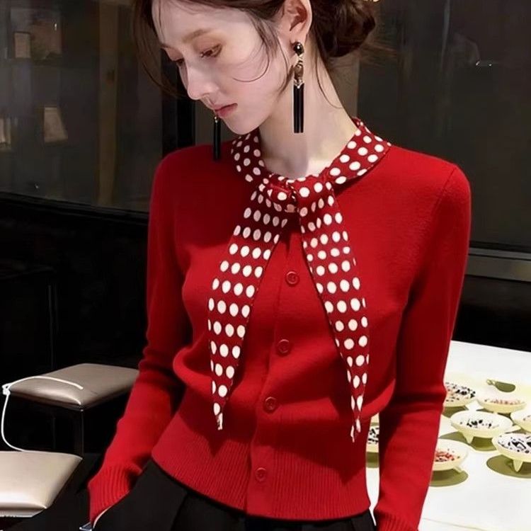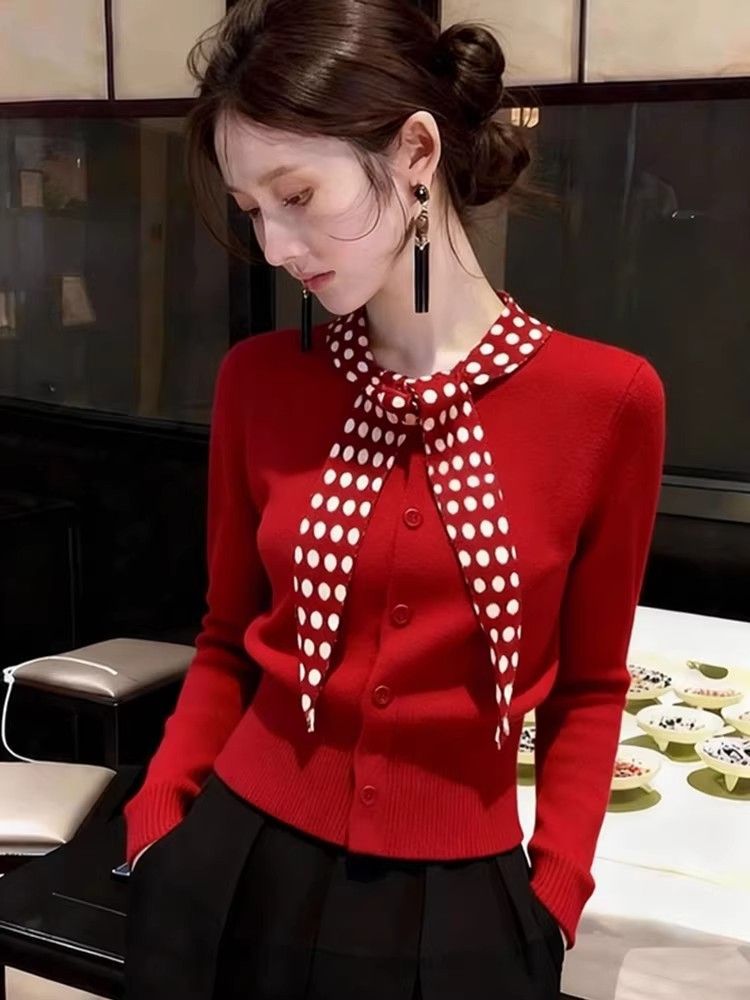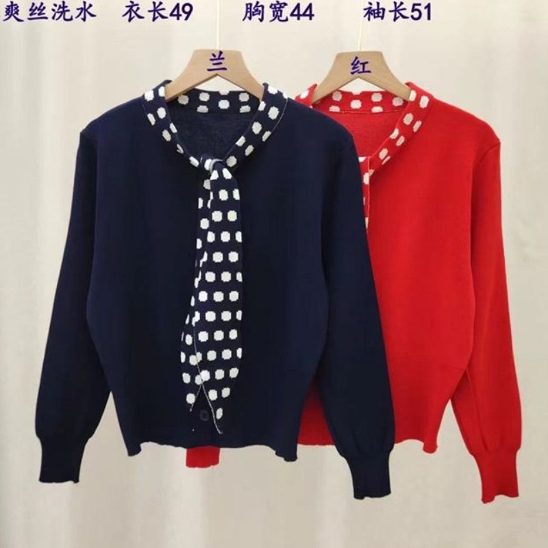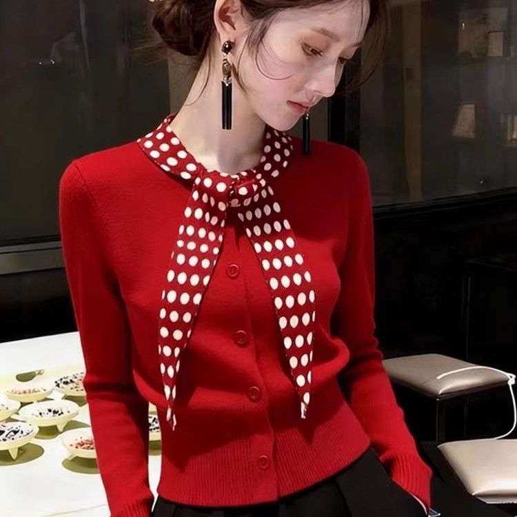 MY17355# 安迪绒小香风红色波点丝巾领毛衣女新年内搭可外穿开衫针织上衣女裝貨源服裝批發