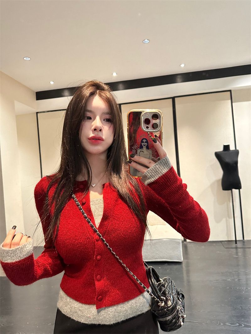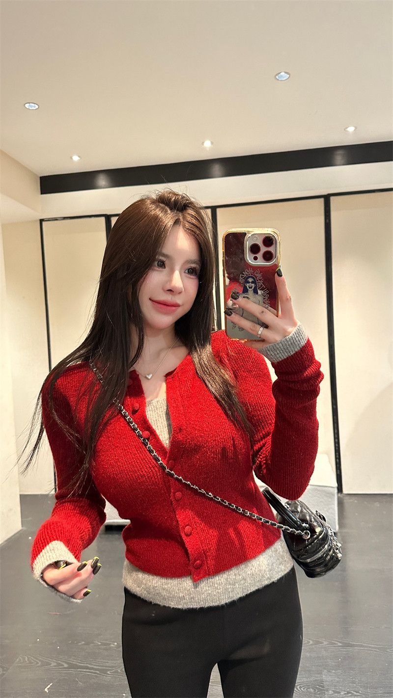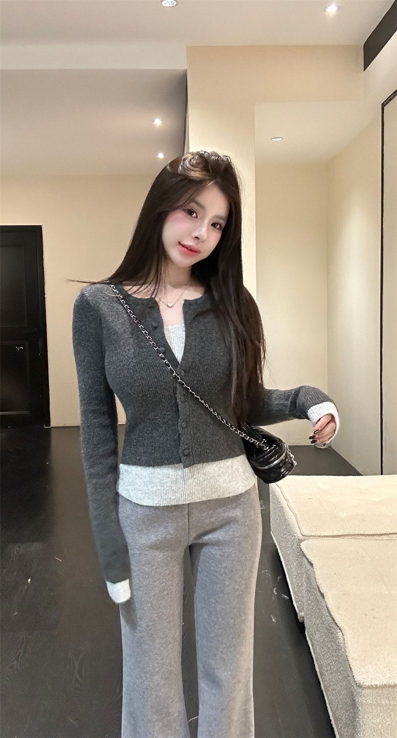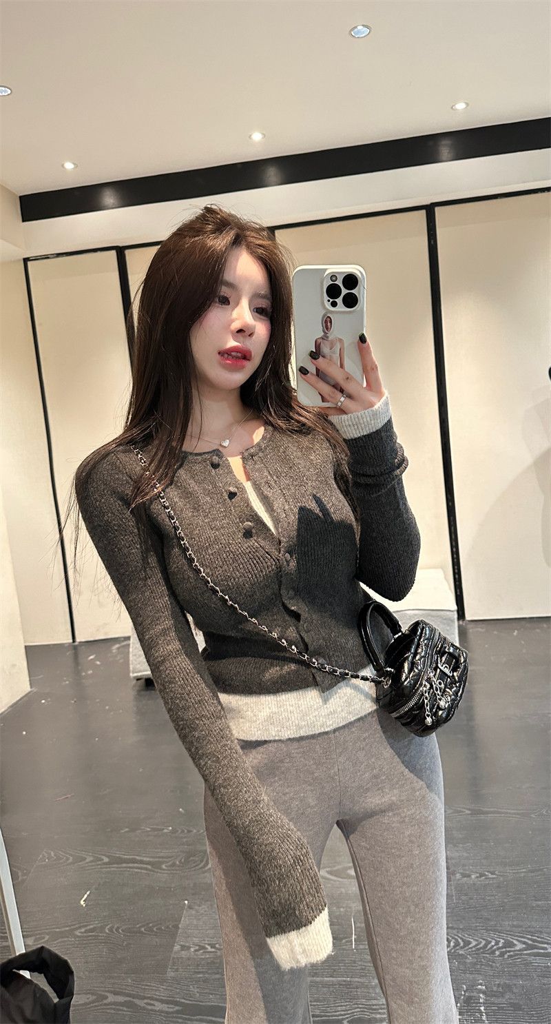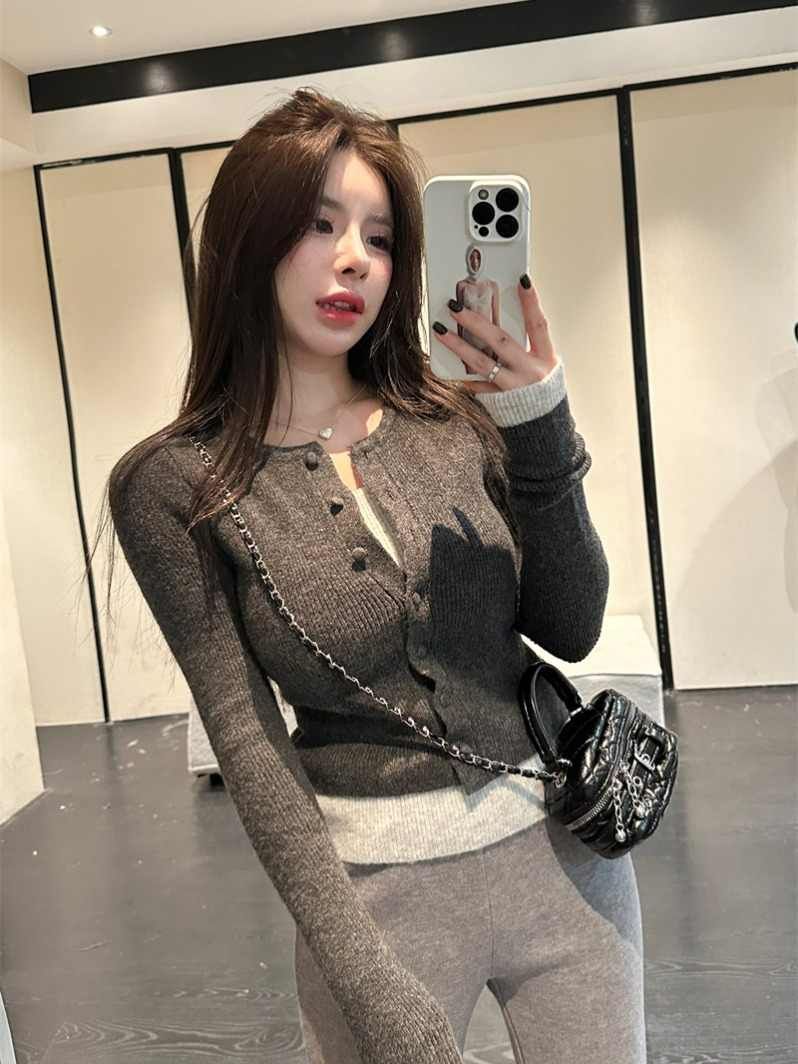 MY17356# 撞色拼接假两件长袖针织衫修身韩系chic毛衣设计感百搭上衣女裝貨源服裝批發