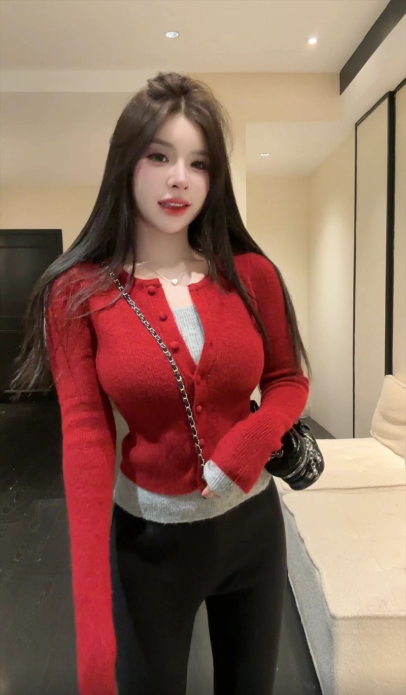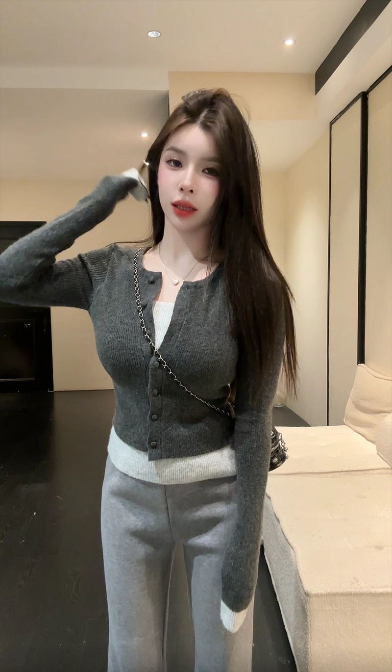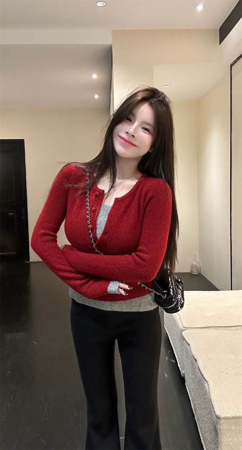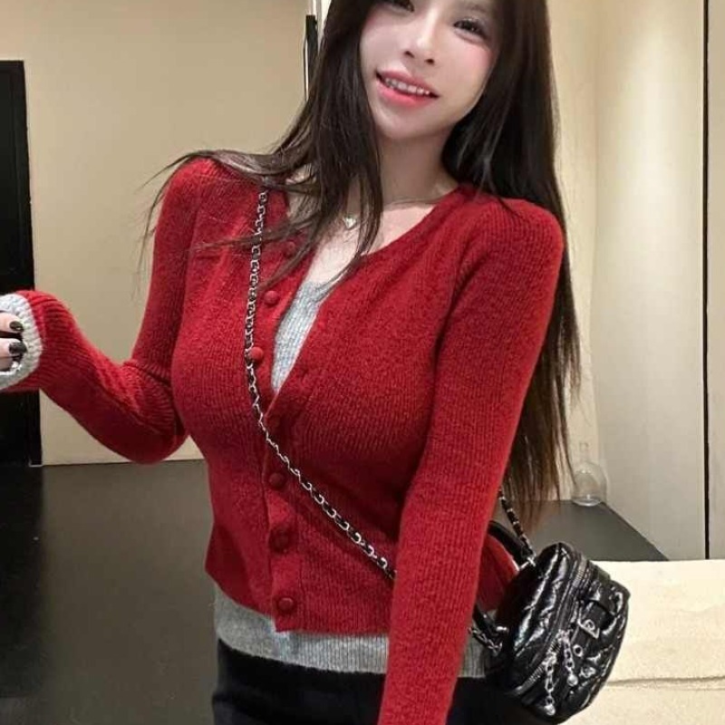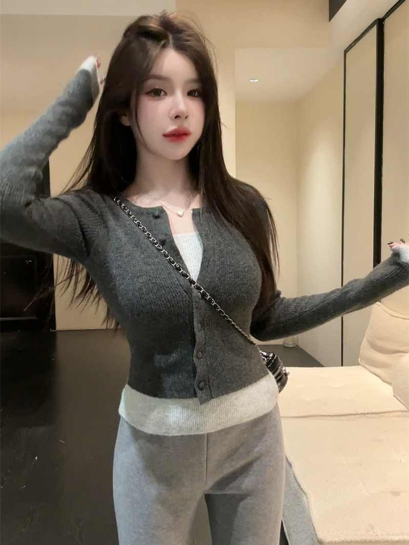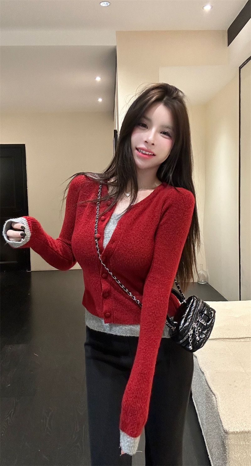 MY17356# 撞色拼接假两件长袖针织衫修身韩系chic毛衣设计感百搭上衣女裝貨源服裝批發