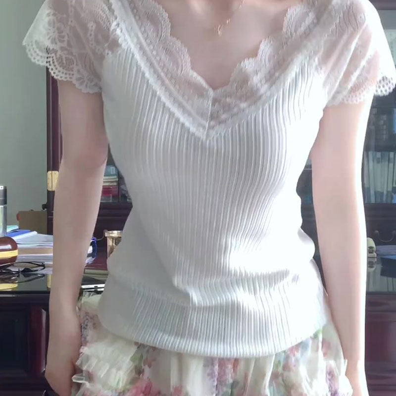 MY17360# 白色蕾丝花边v领短袖t恤冰丝针织衫女修身显瘦独特绝美上衣薄女裝貨源服裝批發