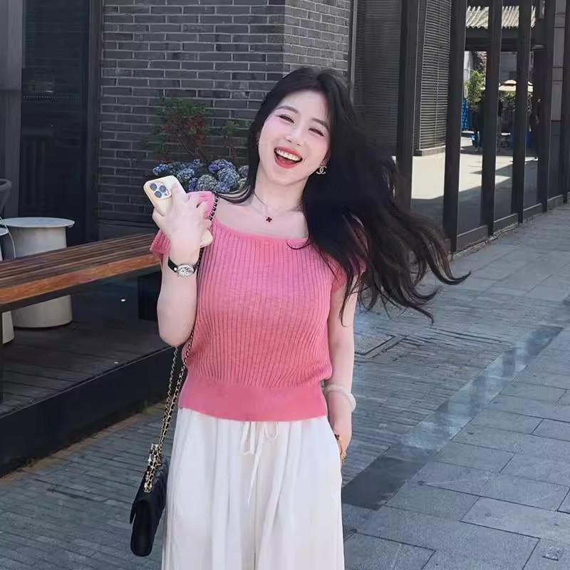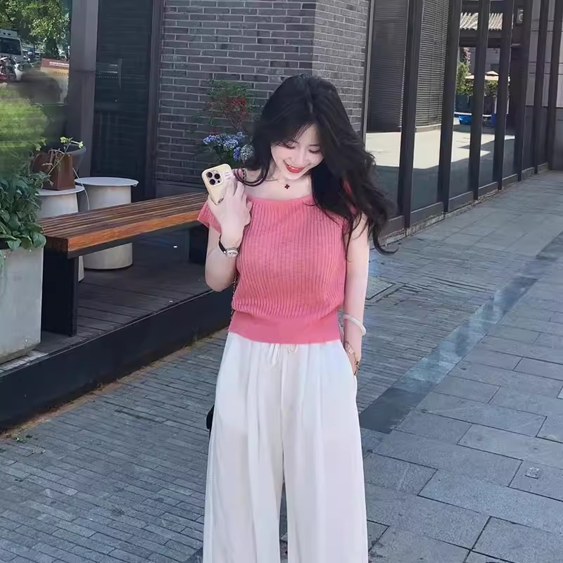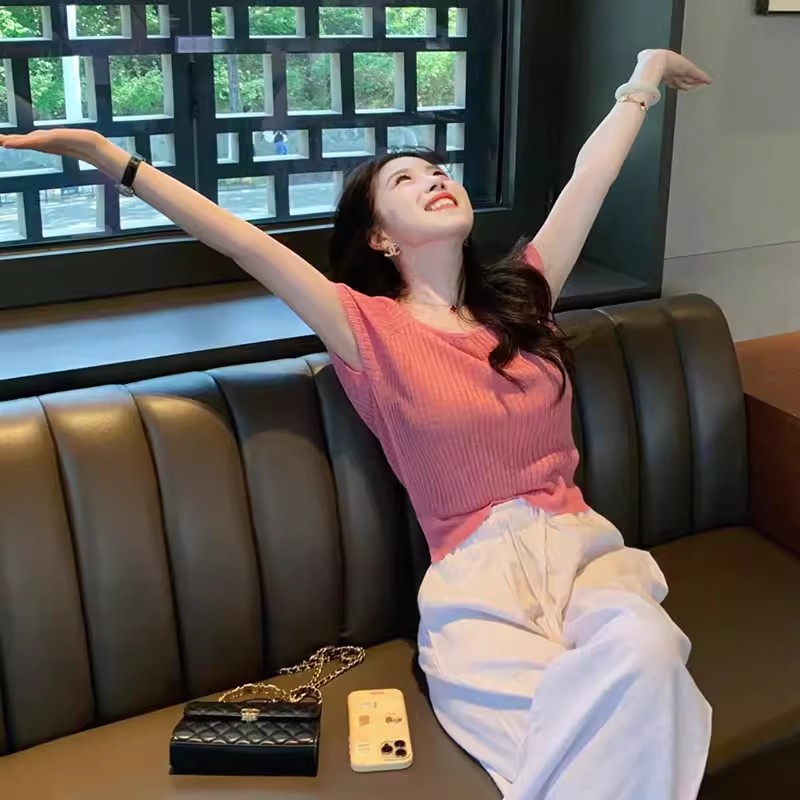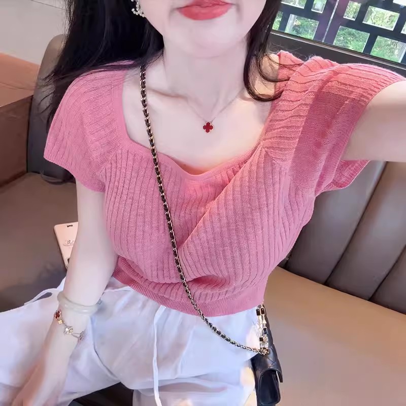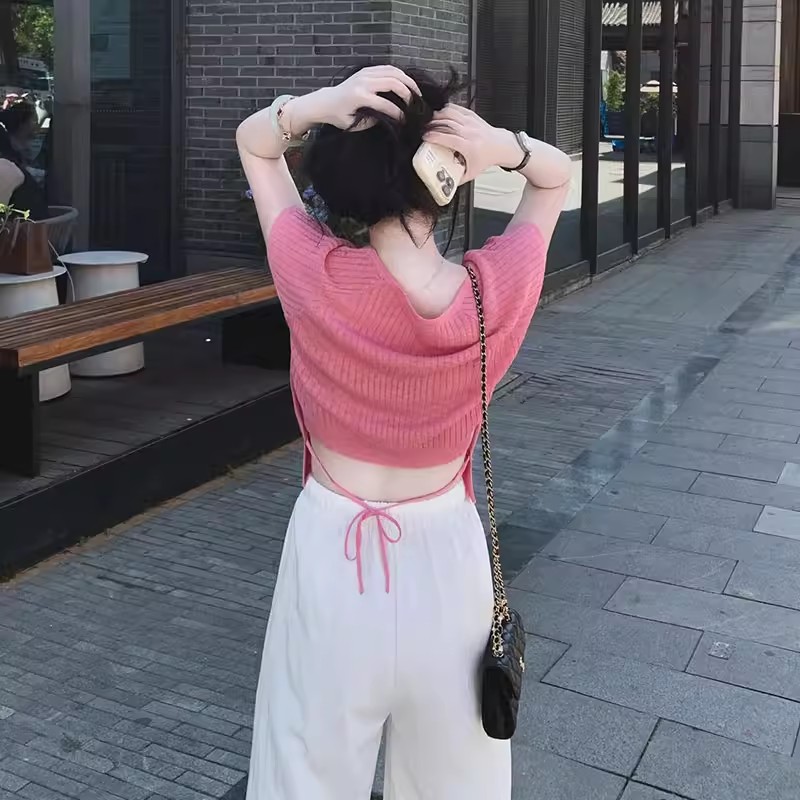 MY17362# 粉色方领短袖t恤冰丝针织衫设计感露背系带独特超好看上衣女裝貨源服裝批發
