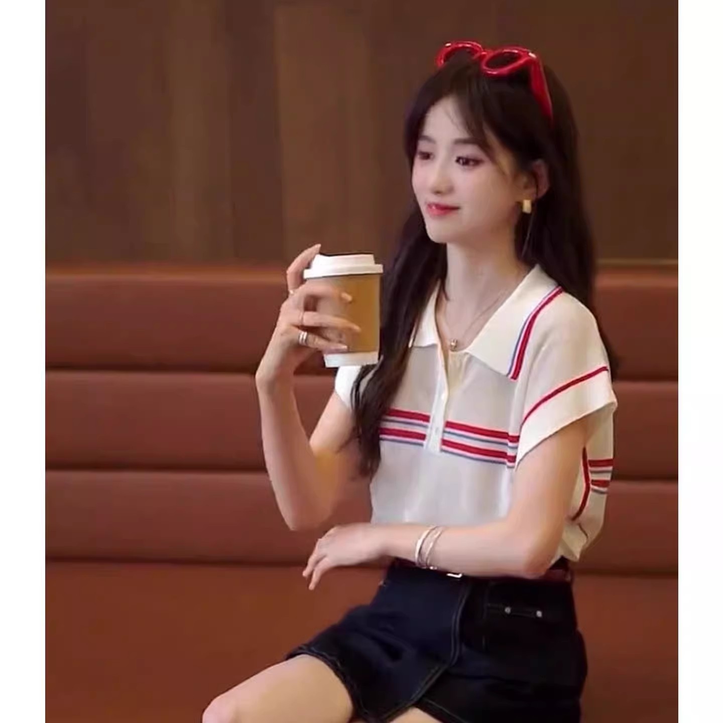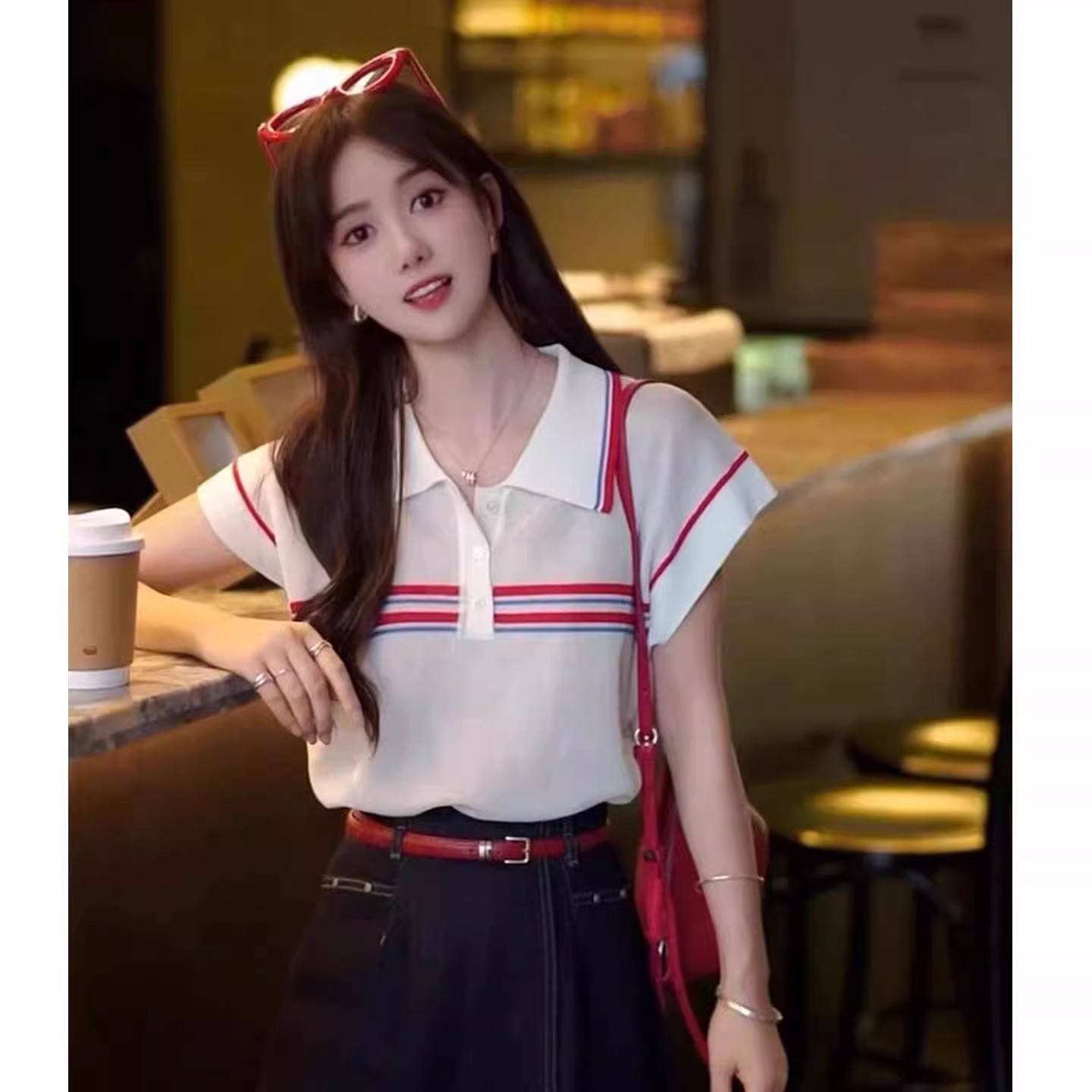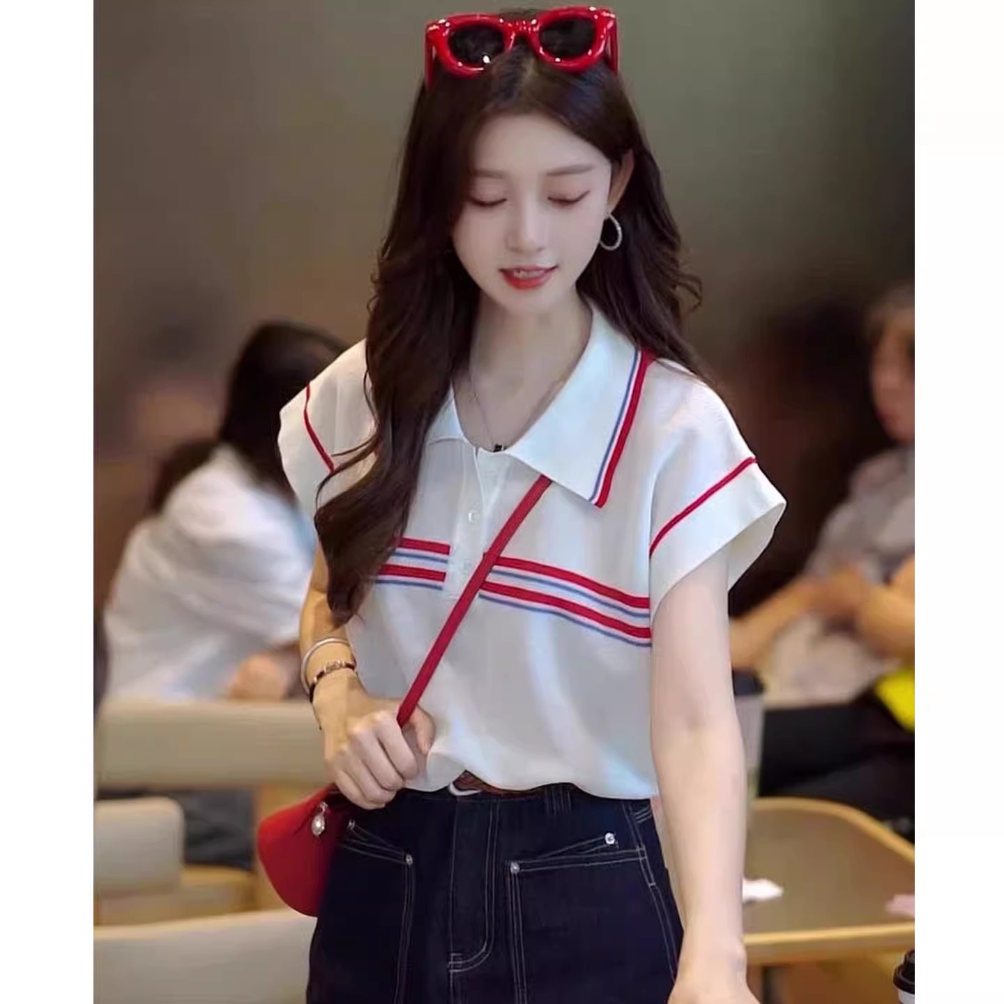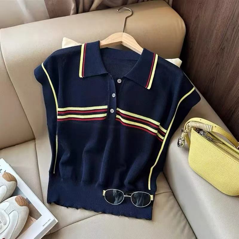 MY17364# 白色条纹冰丝针织短袖上衣韩系宽松高级感配丝巾polo衫t恤女裝貨源服裝批發