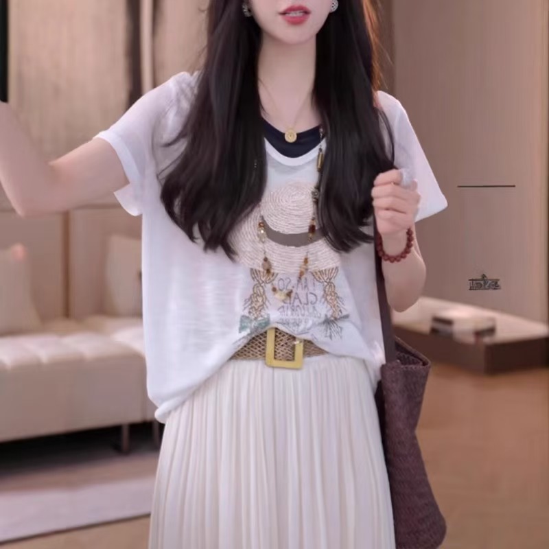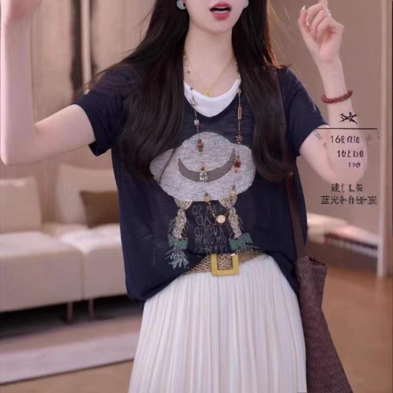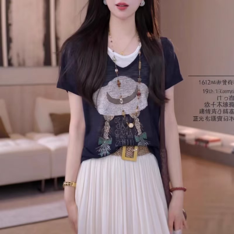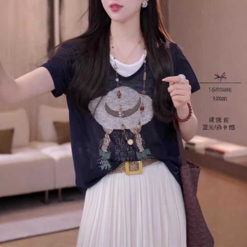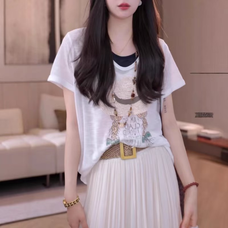 MY17367# 大码女装假两件短袖小衫新款胖mm宽松显瘦减龄上衣女裝貨源服裝批發