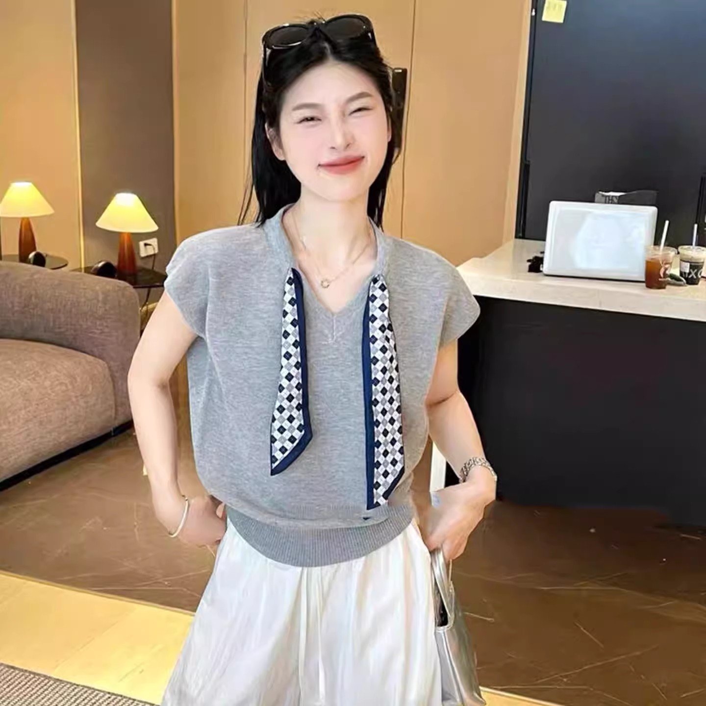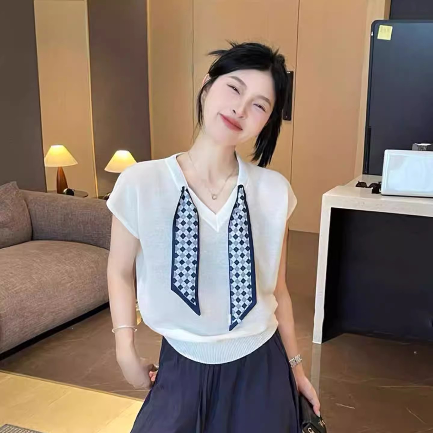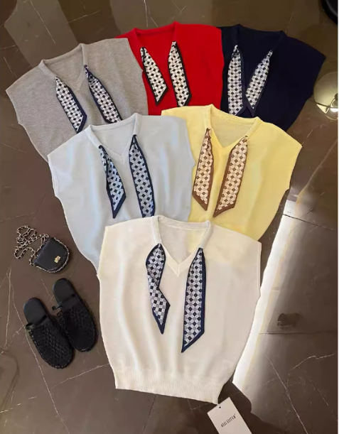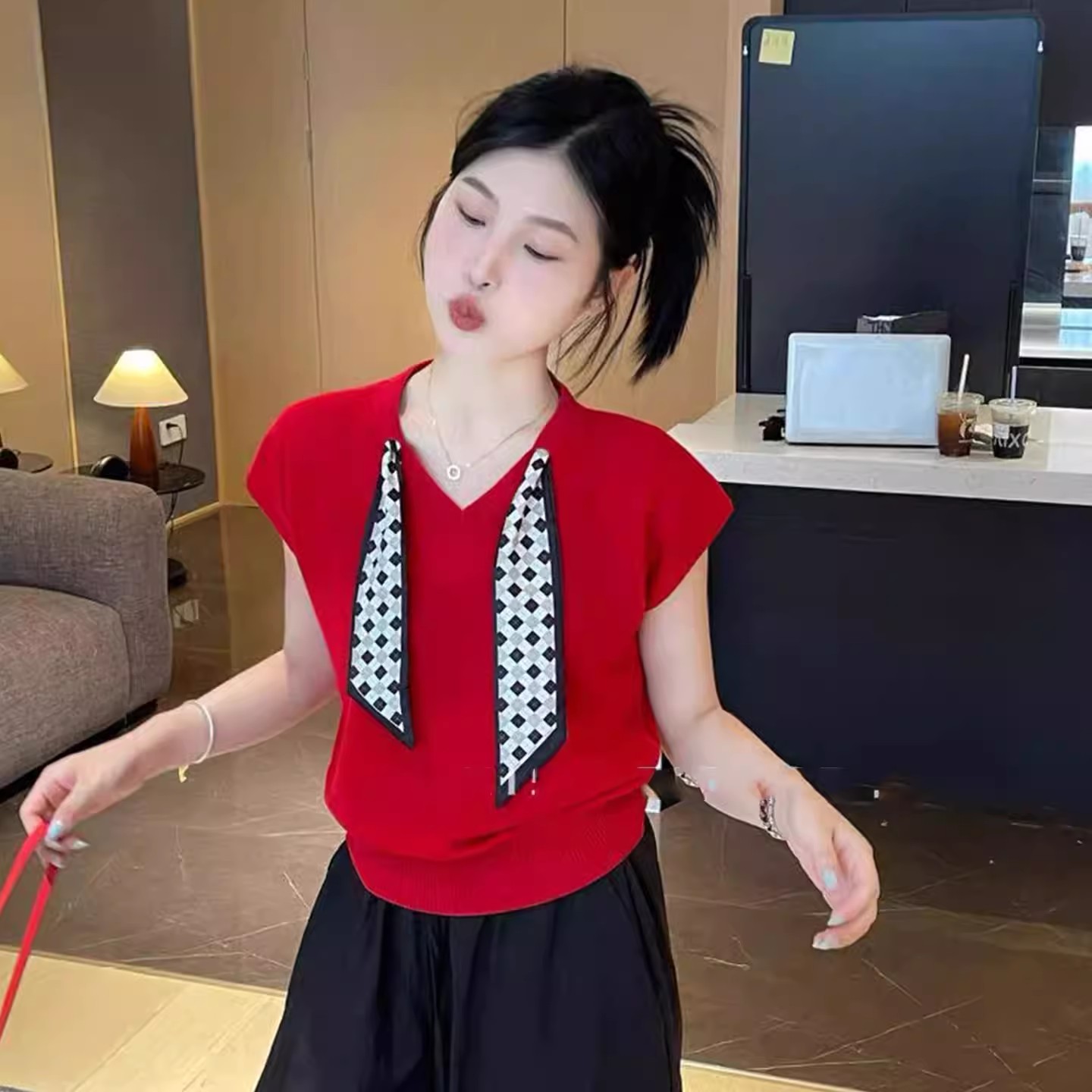 MY17368# 红色v领丝巾冰丝针织短袖t恤新款夏季宽松显瘦别致独特上衣女裝貨源服裝批發