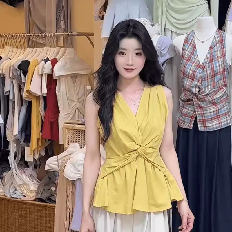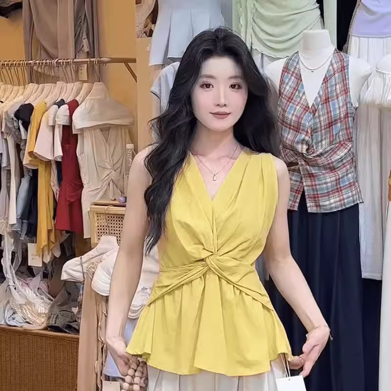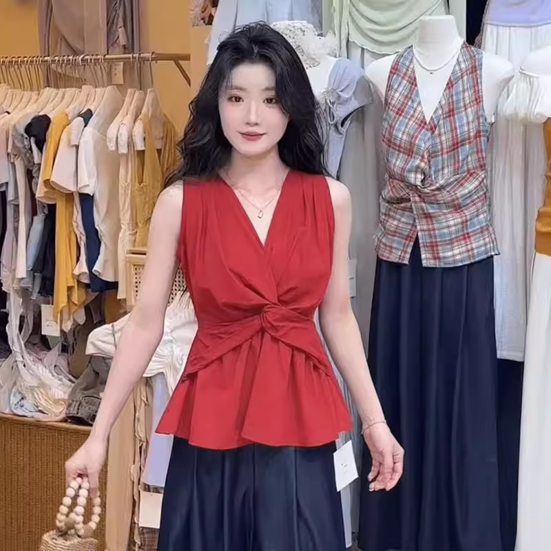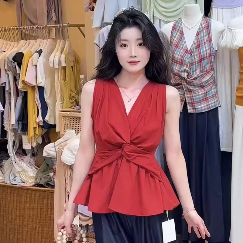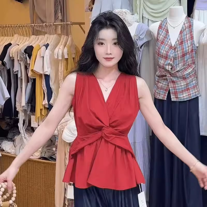 MY17371# 红色扭结v领无袖吊带背心衬衫外穿修身显瘦别致独特漂亮上衣女裝貨源服裝批發