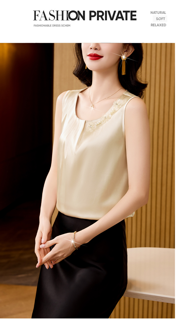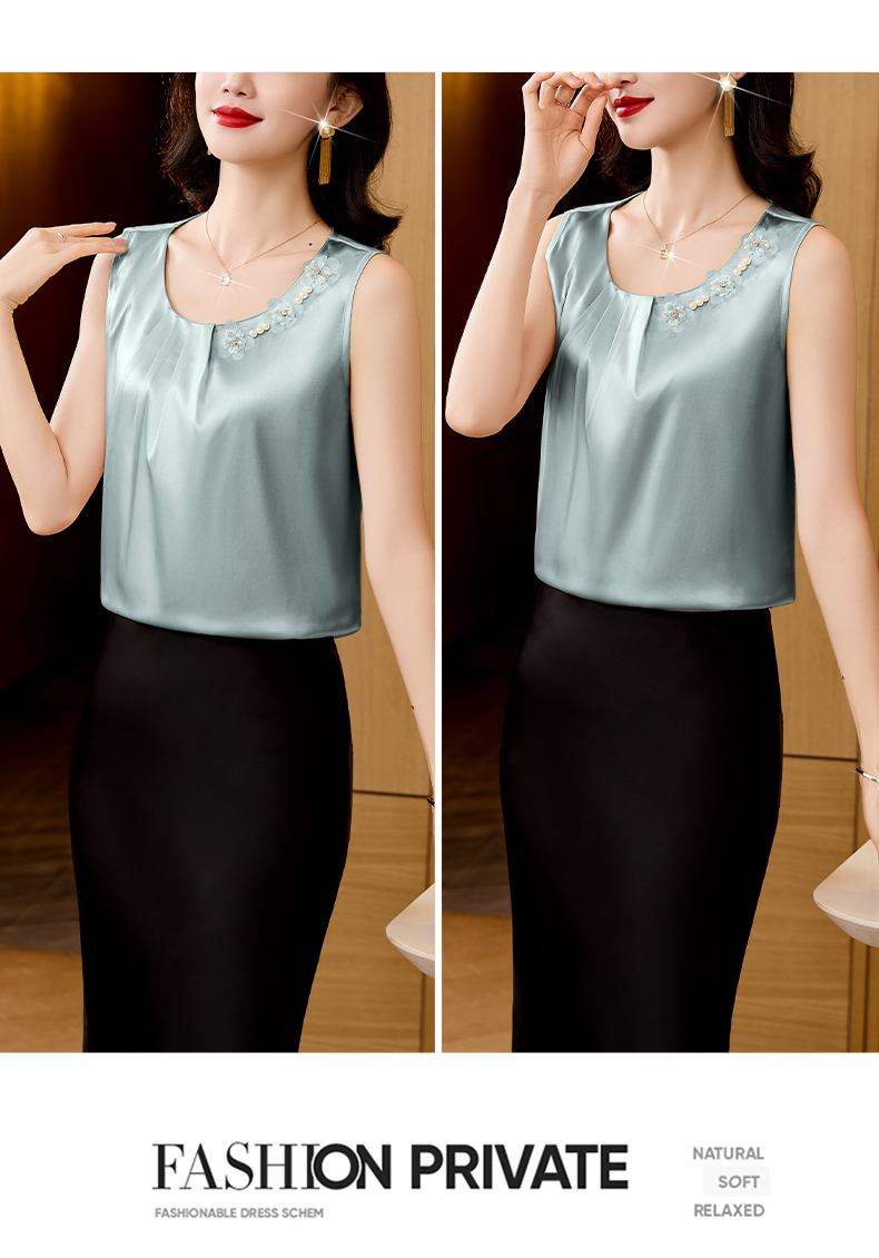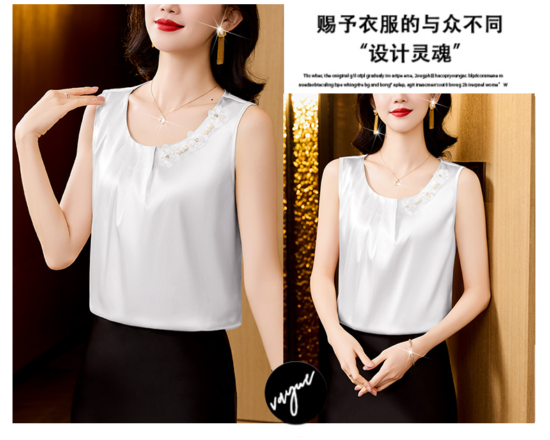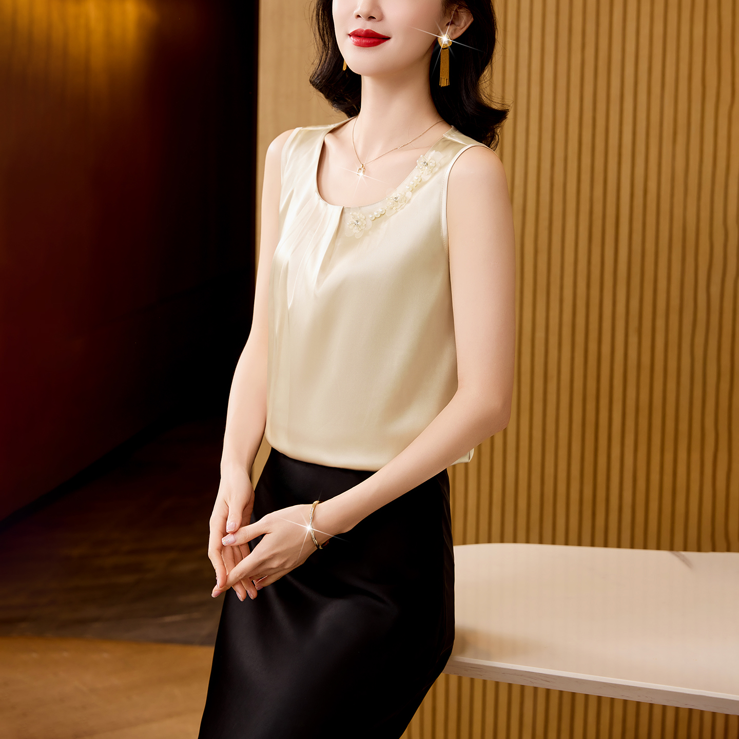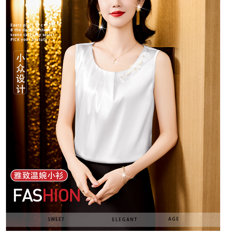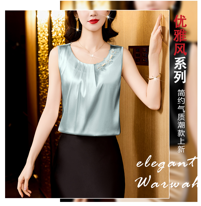 MY17391# 圆领钉珠花朵春秋新款时尚洋气内搭缎面背心女裝貨源服裝批發