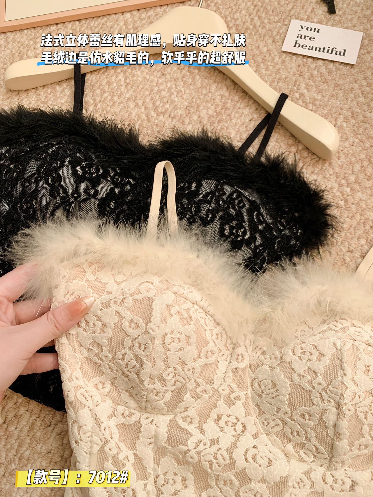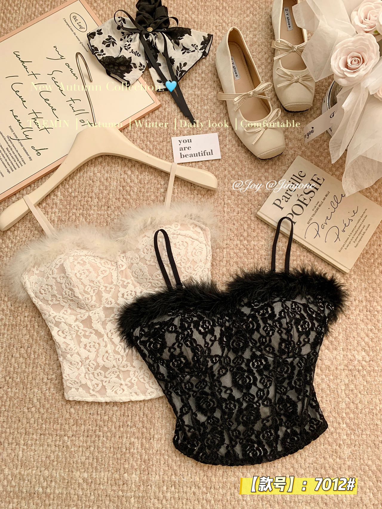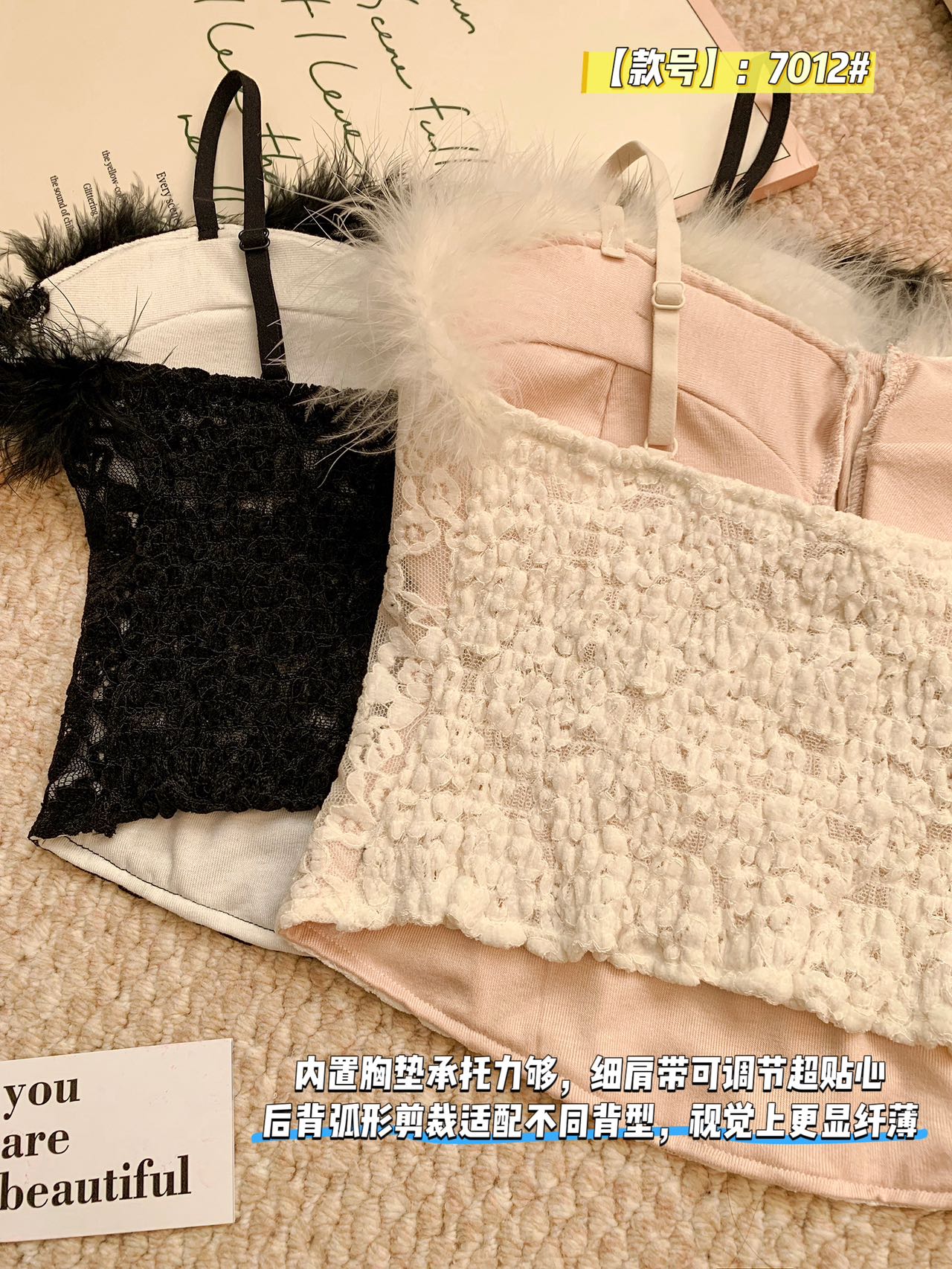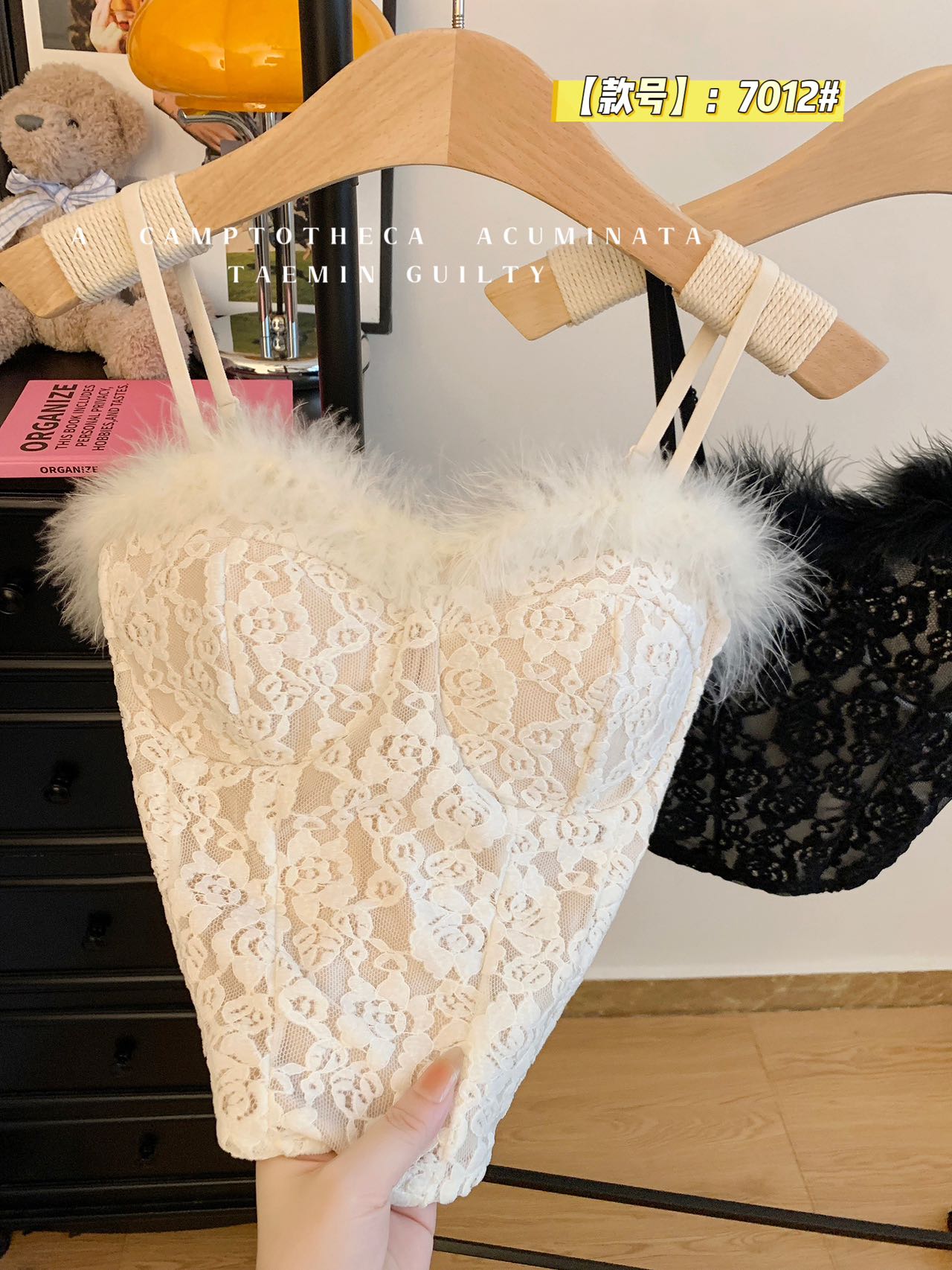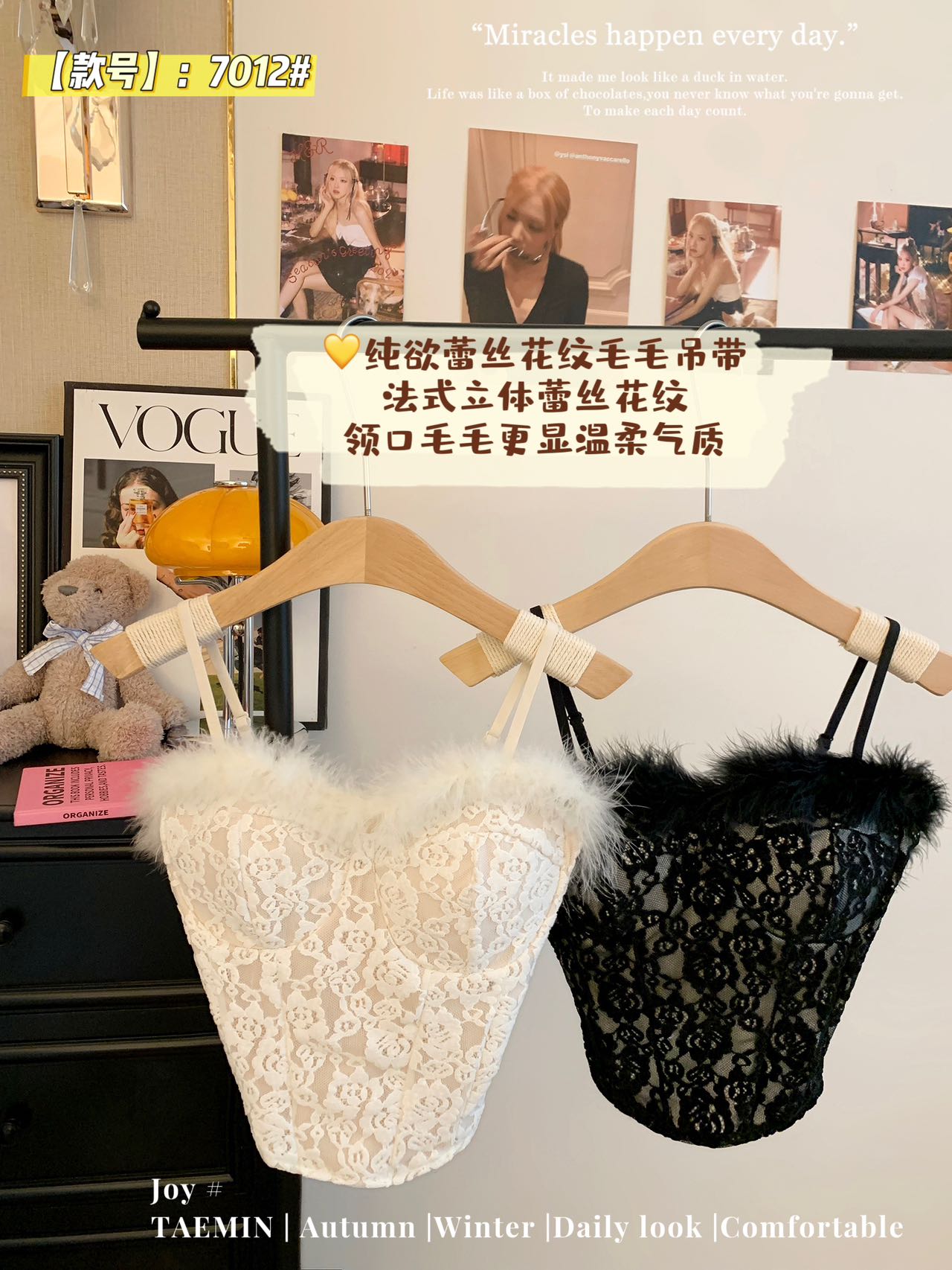 MY17428# 新款纯欲法式立体蕾丝花纹毛毛领口吊带自带罩杯女女裝貨源服裝批發