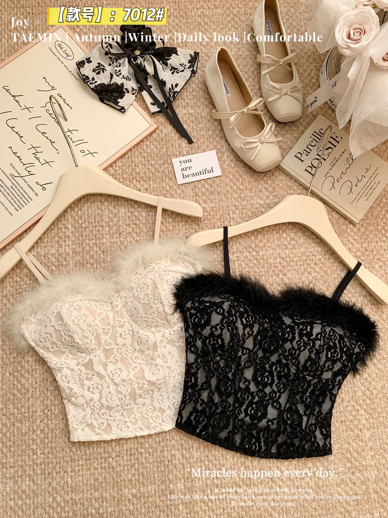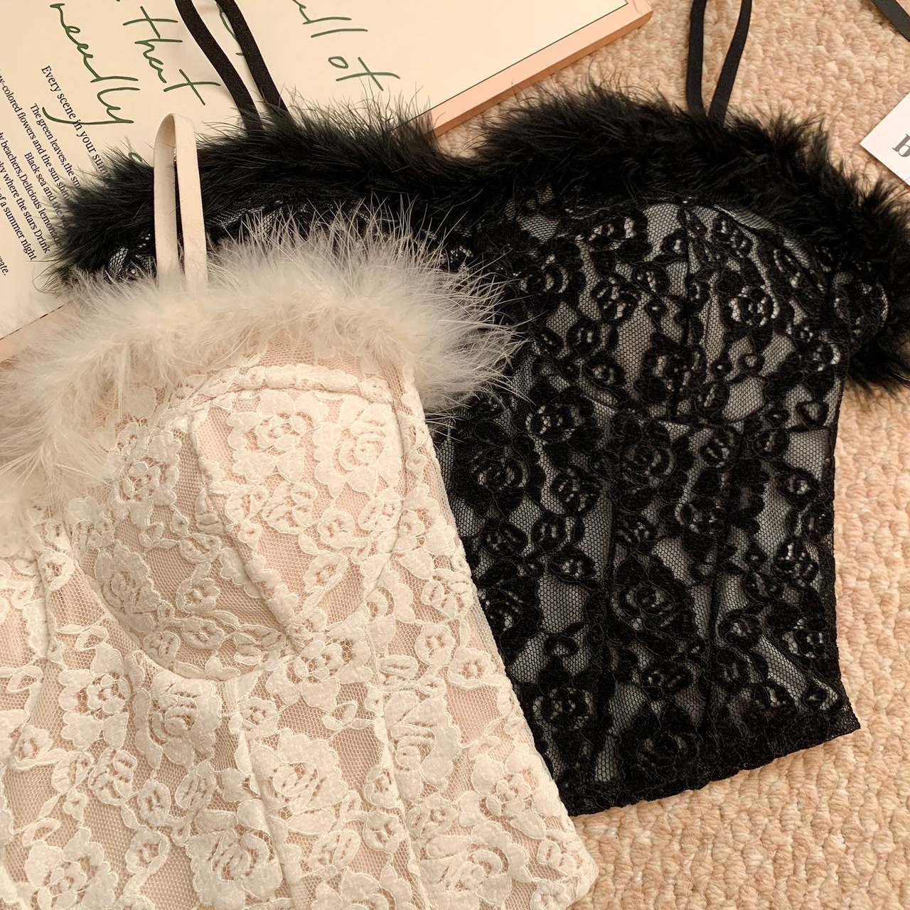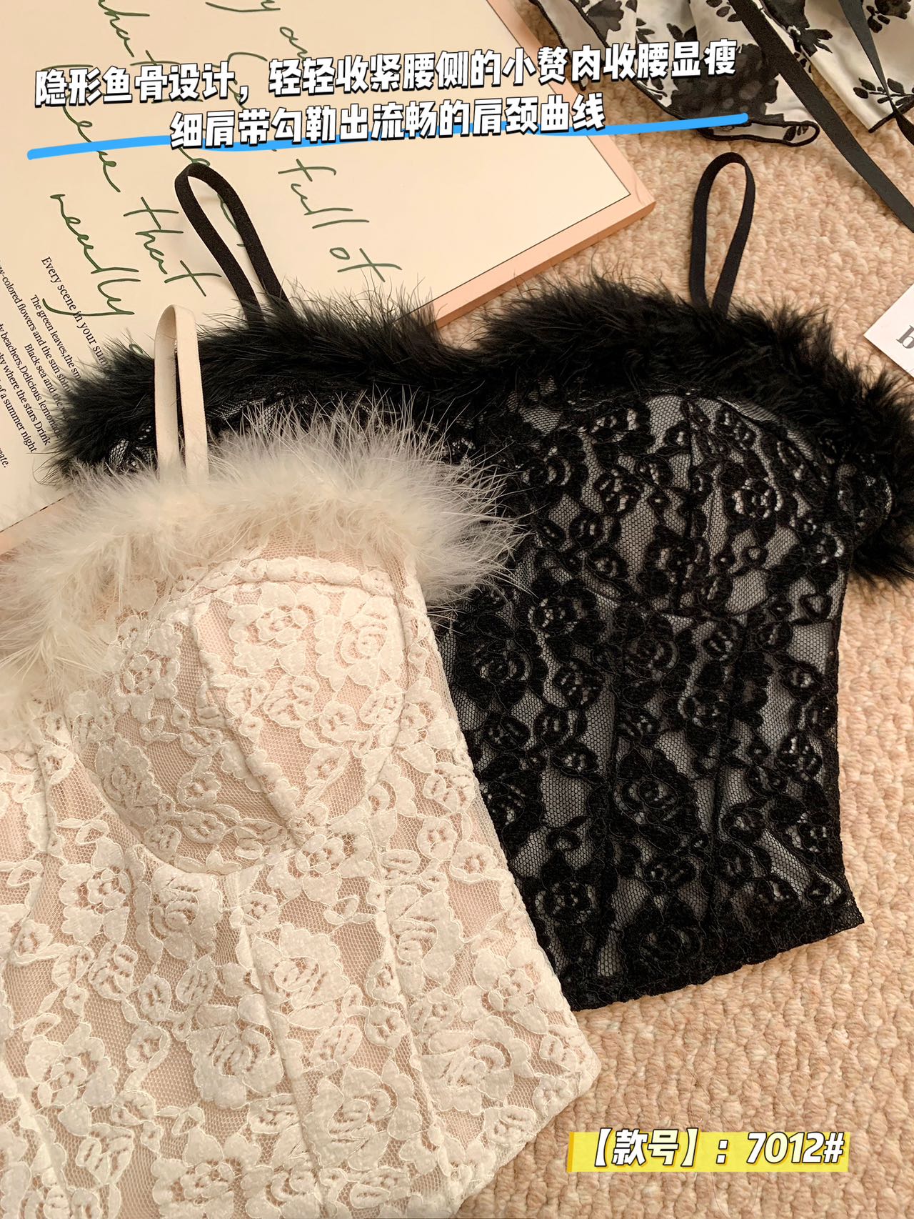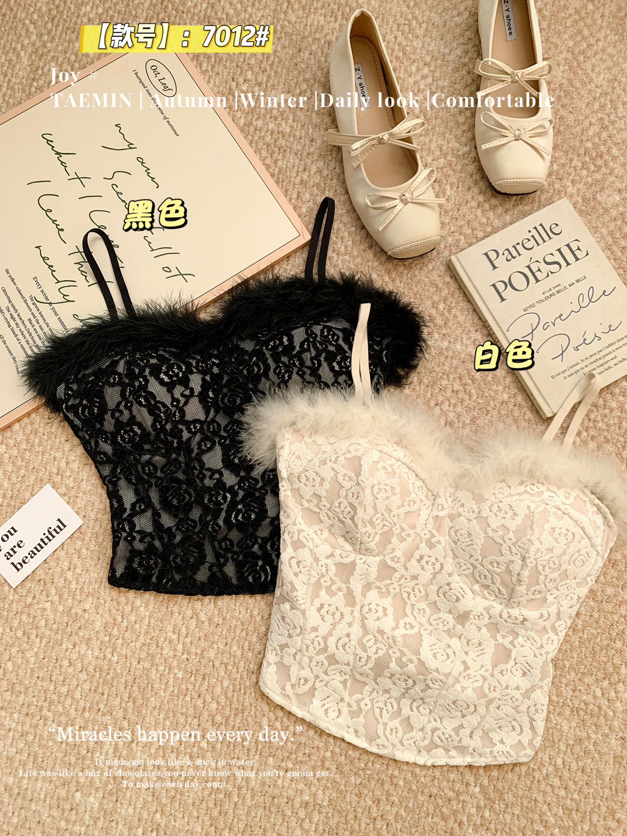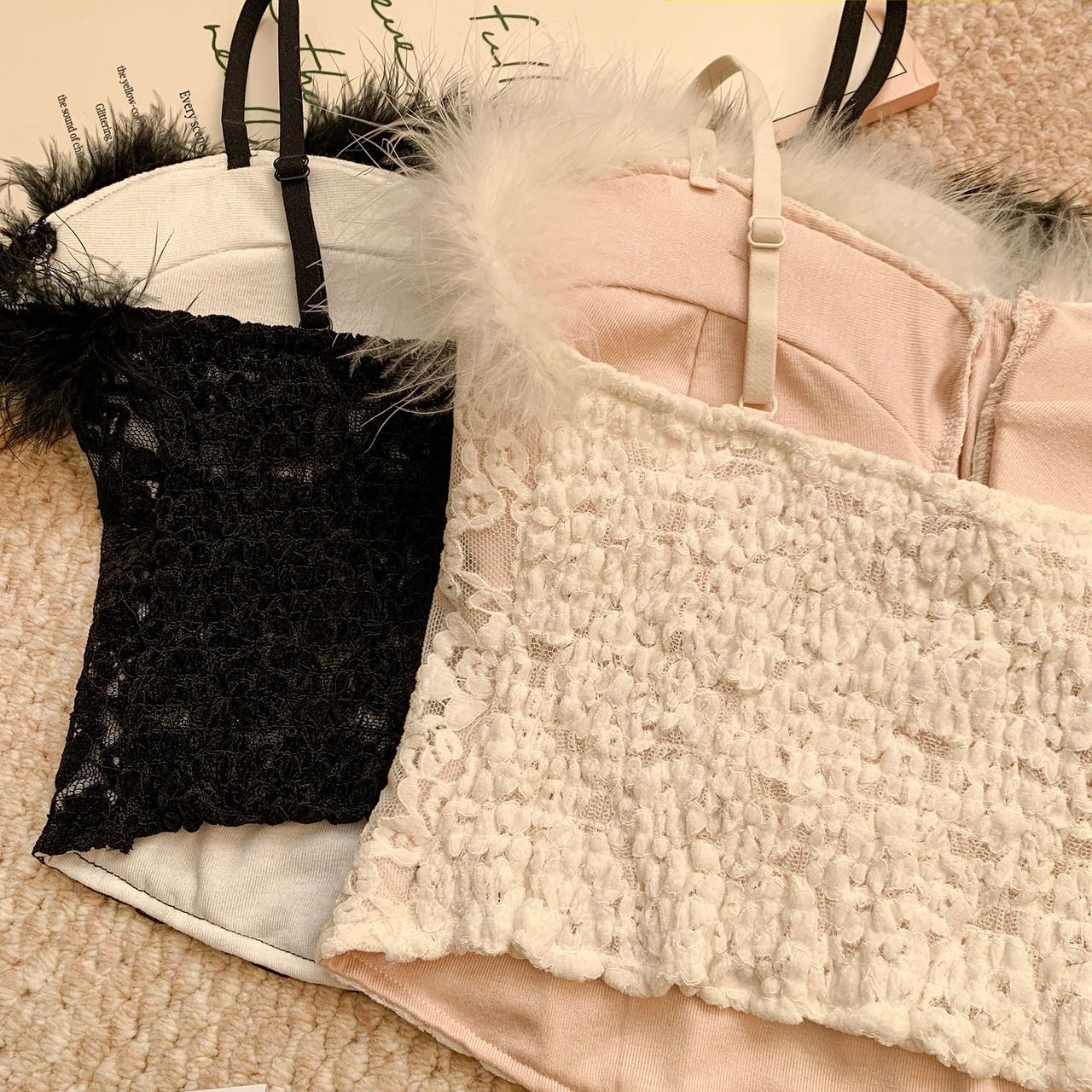 MY17428# 新款纯欲法式立体蕾丝花纹毛毛领口吊带自带罩杯女女裝貨源服裝批發