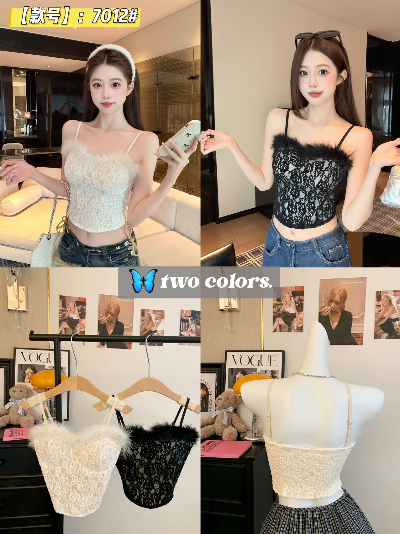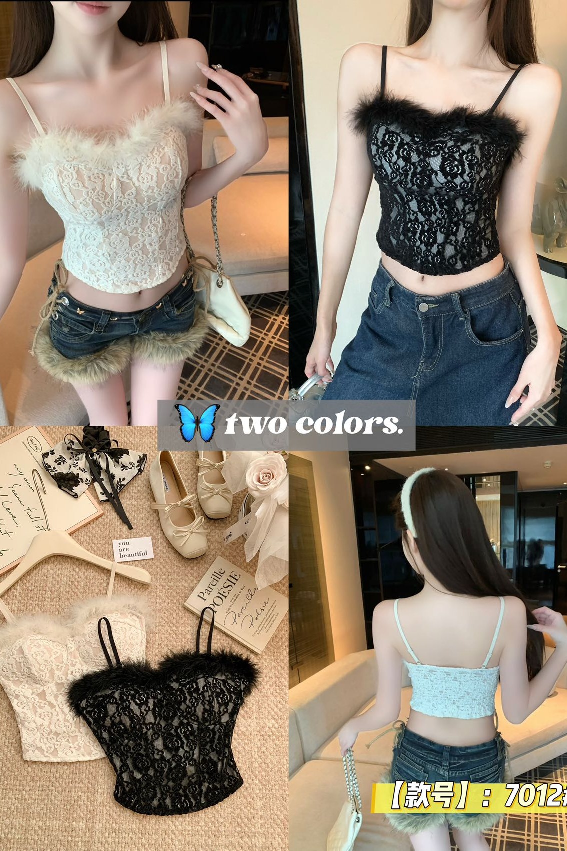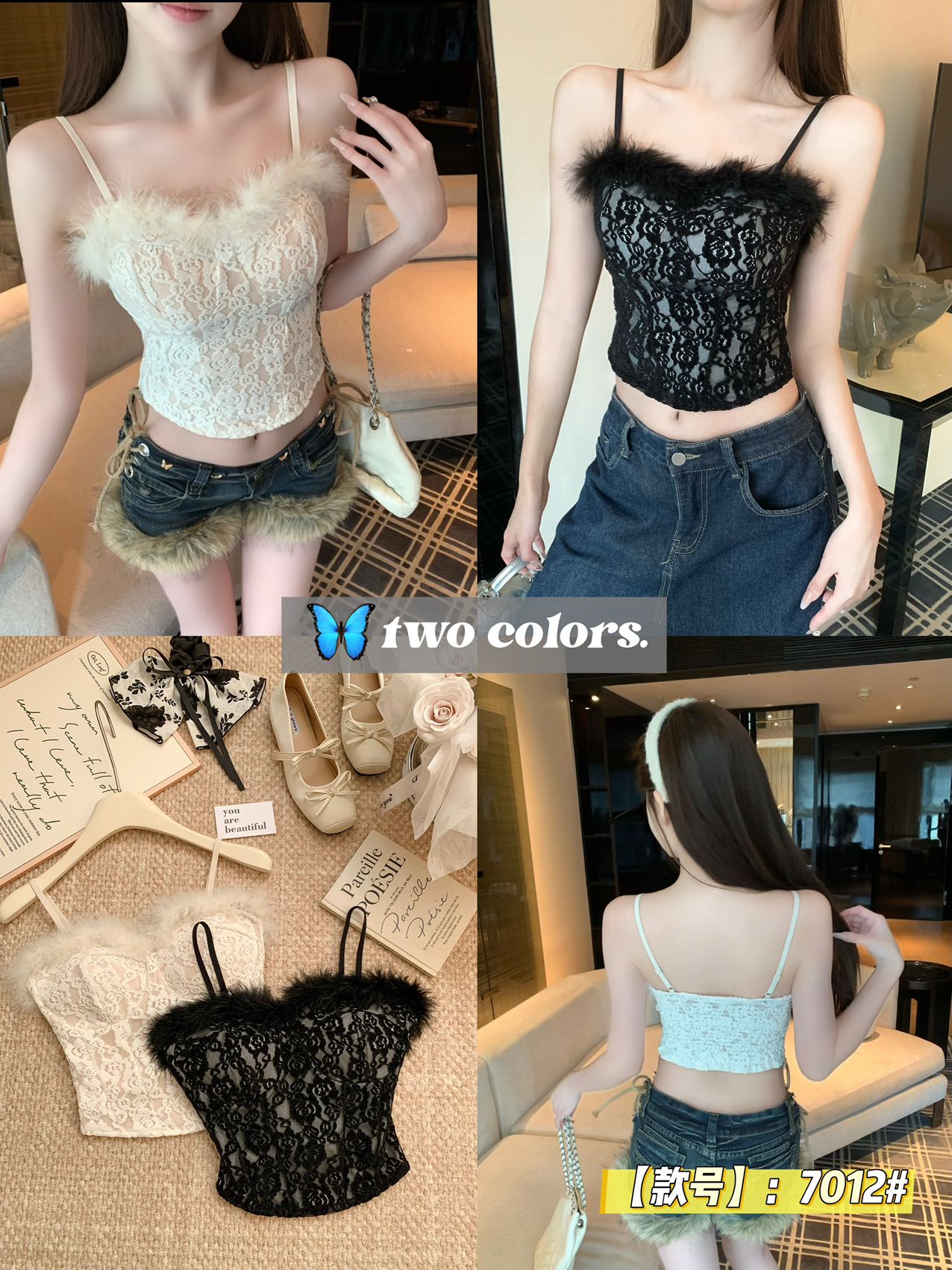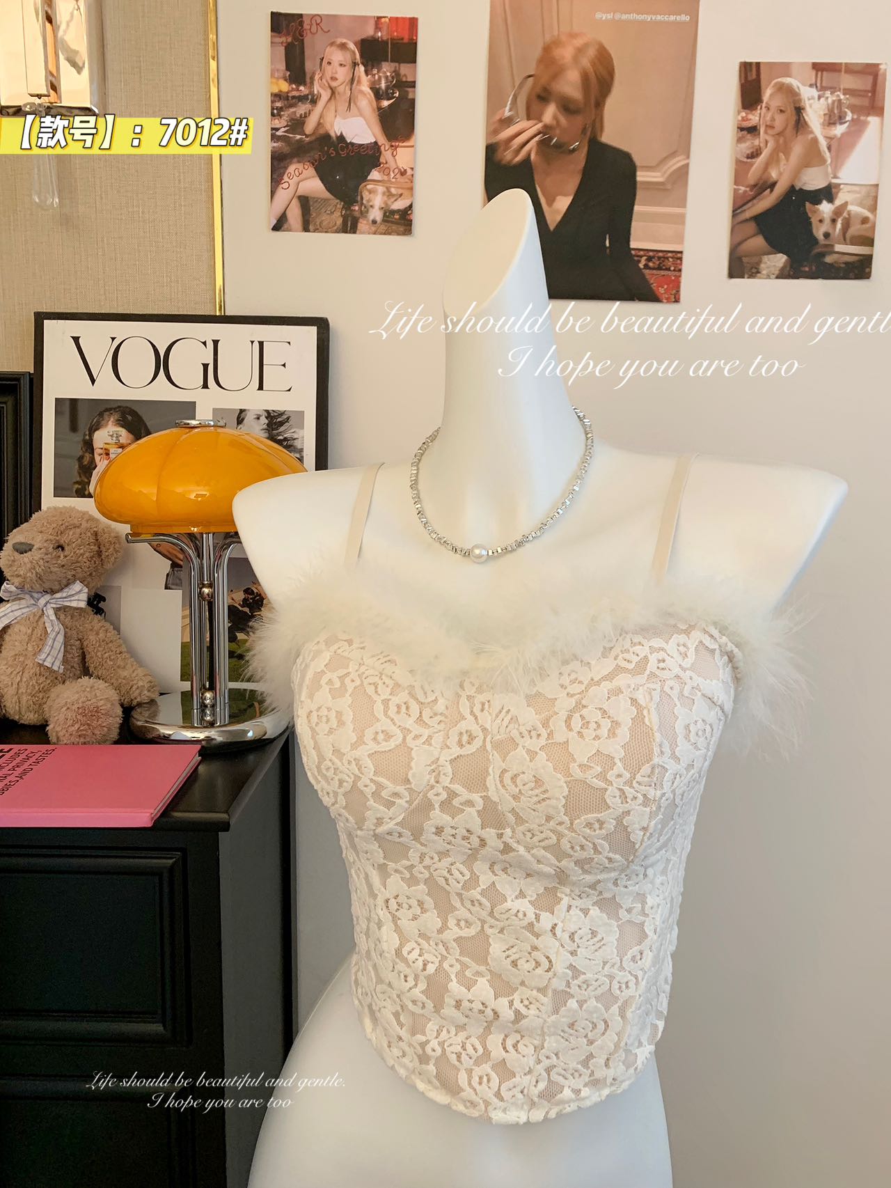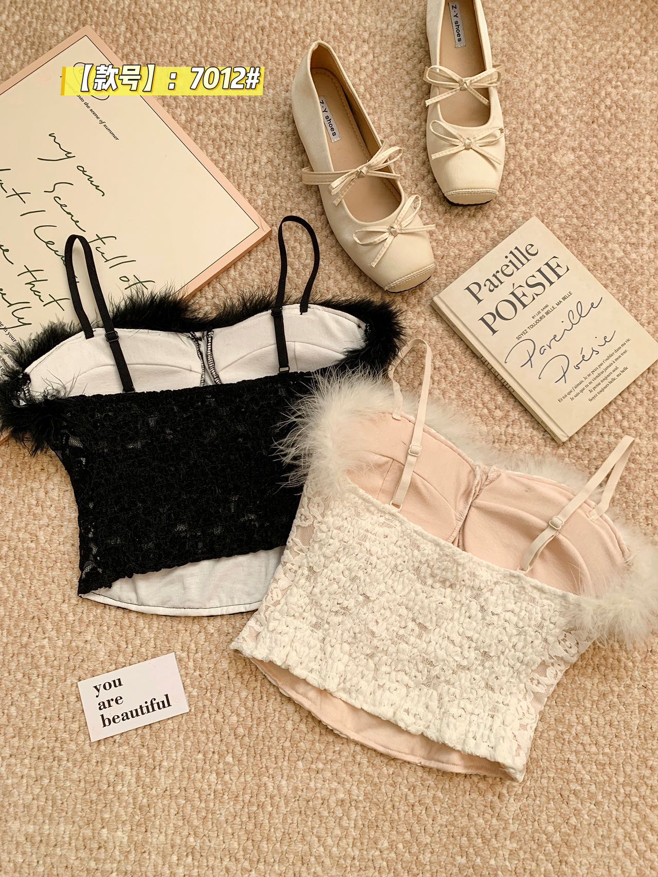 MY17428# 新款纯欲法式立体蕾丝花纹毛毛领口吊带自带罩杯女女裝貨源服裝批發