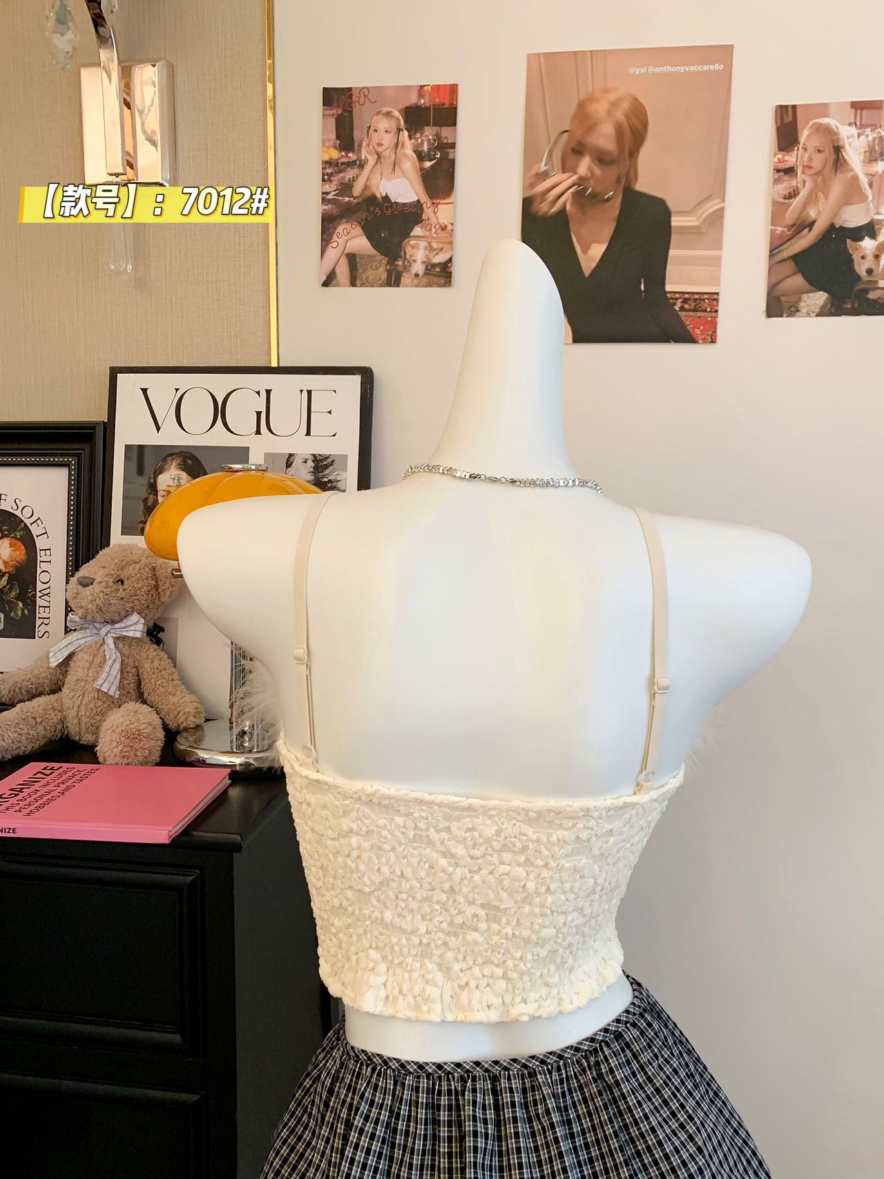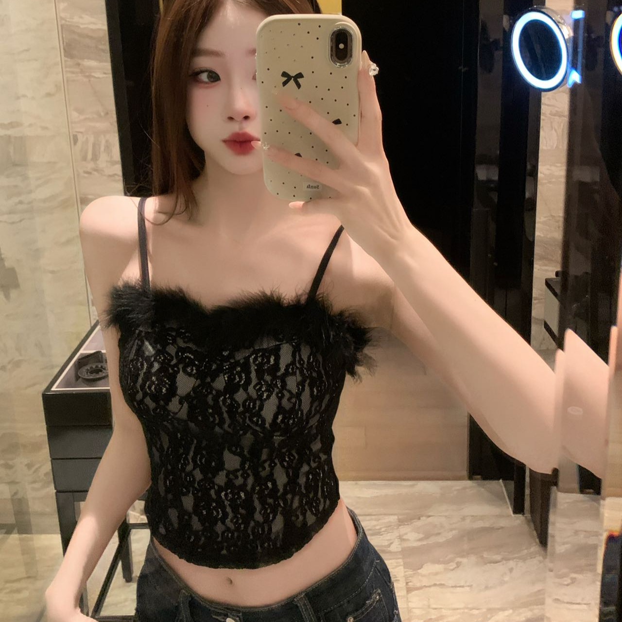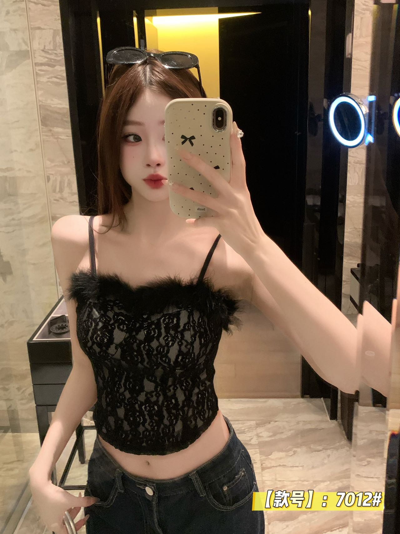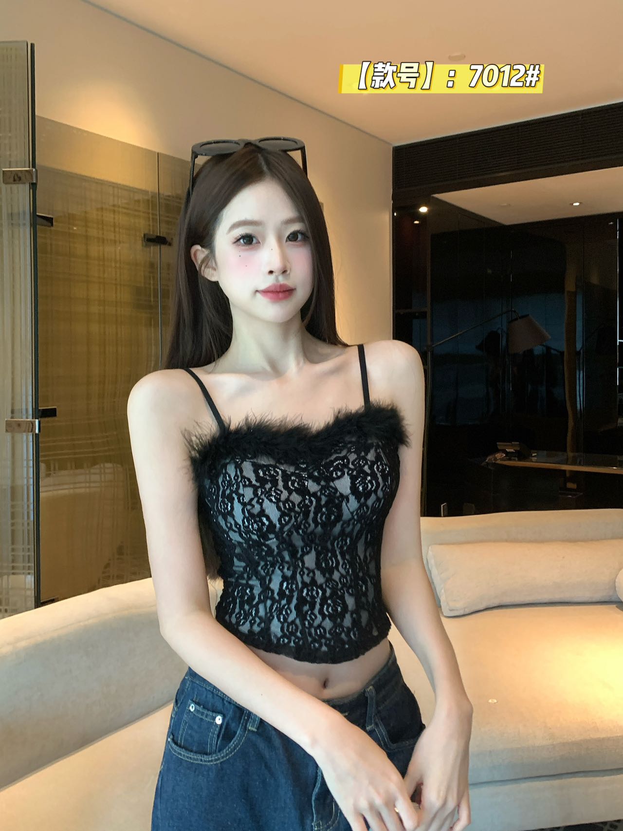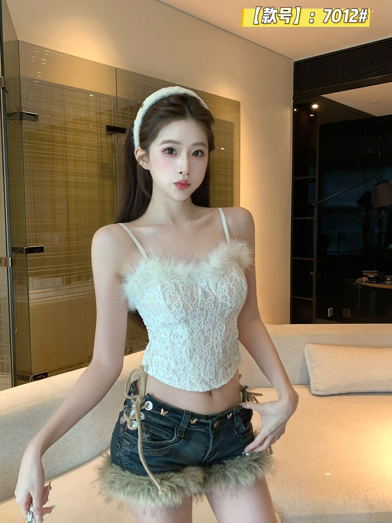 MY17428# 新款纯欲法式立体蕾丝花纹毛毛领口吊带自带罩杯女女裝貨源服裝批發
