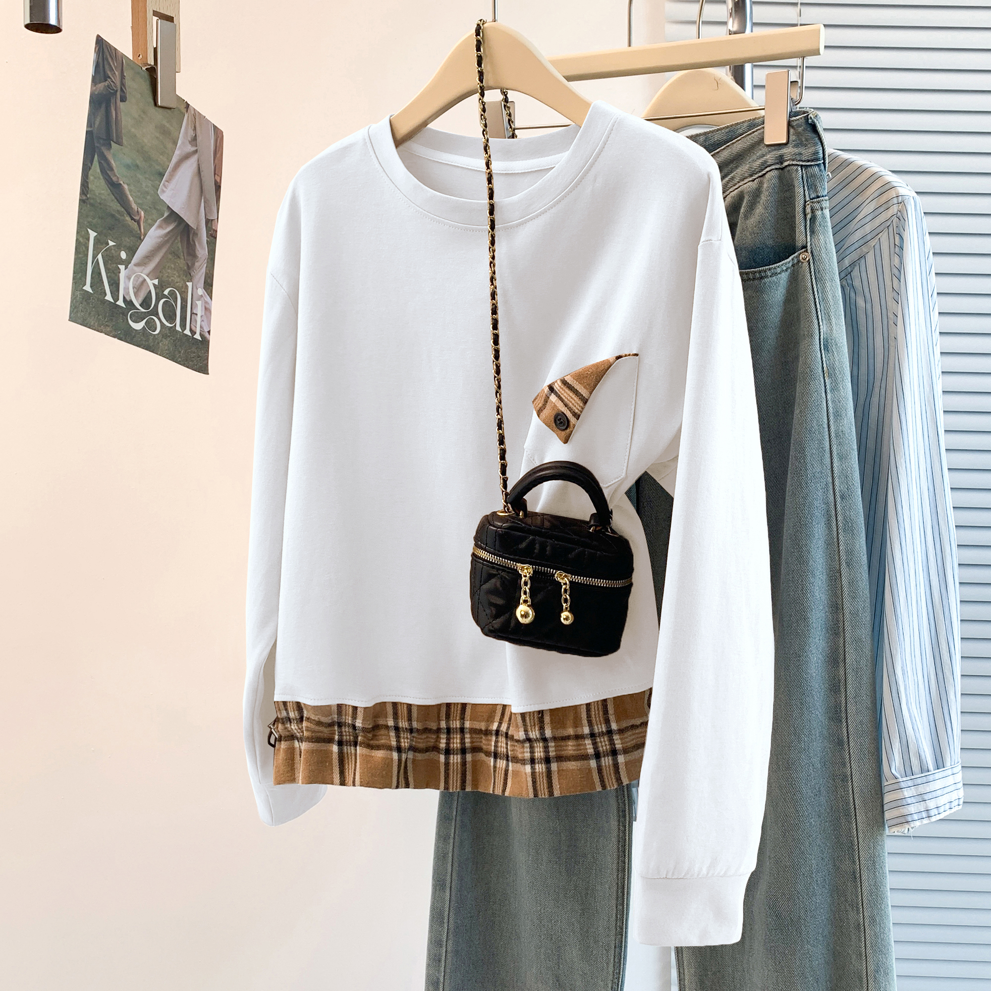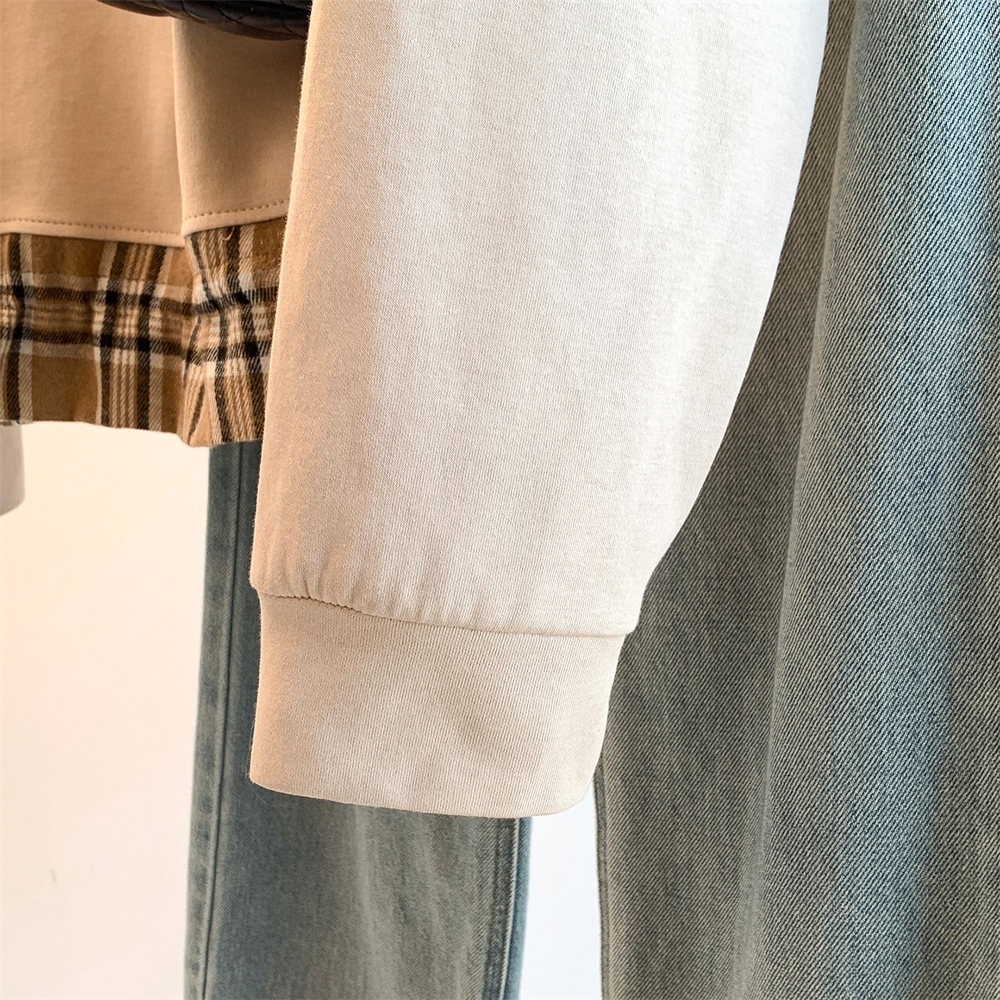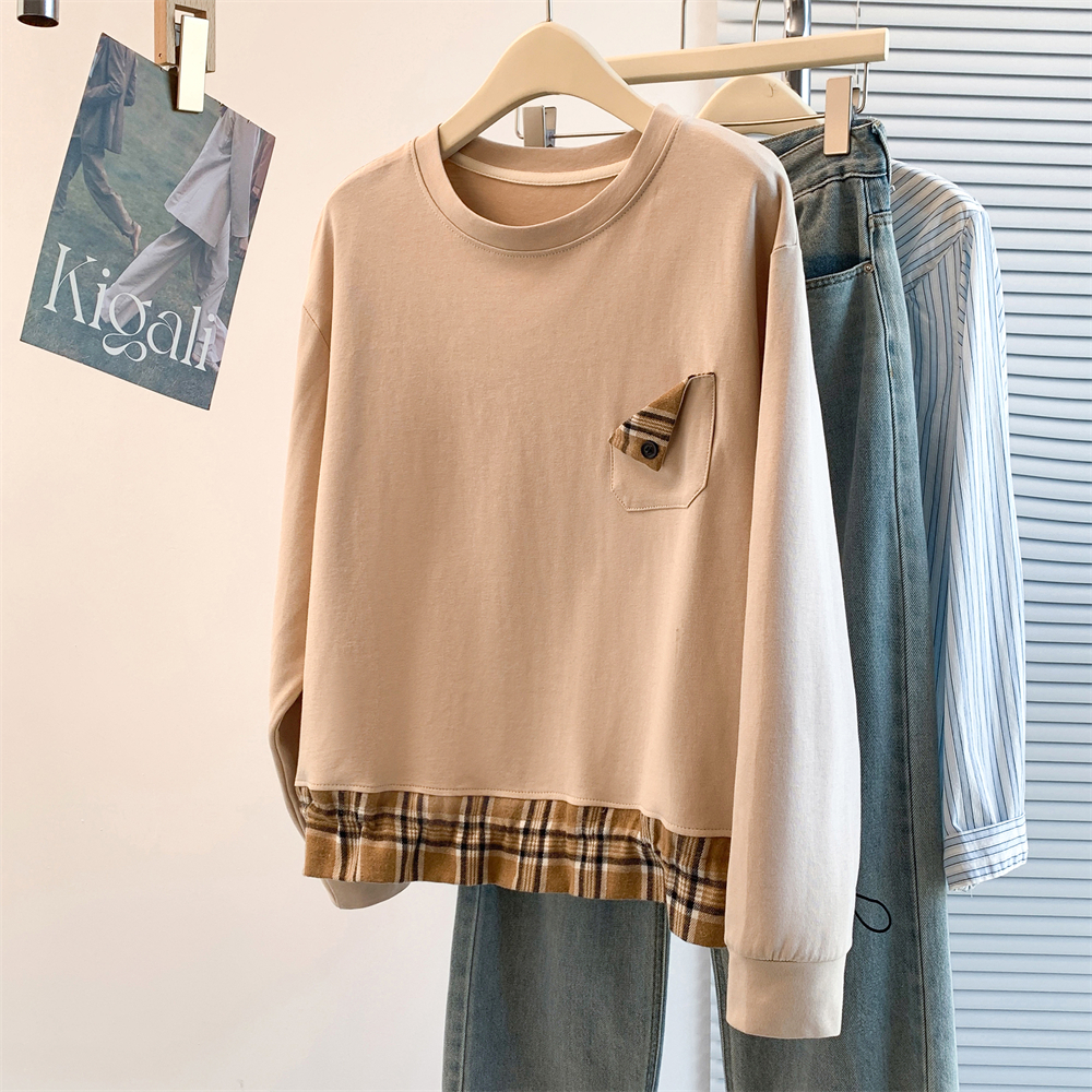 MY17435# 新款设计感洋气减龄格子拼接T恤宽松休闲百搭韩版卫衣女女裝貨源服裝批發