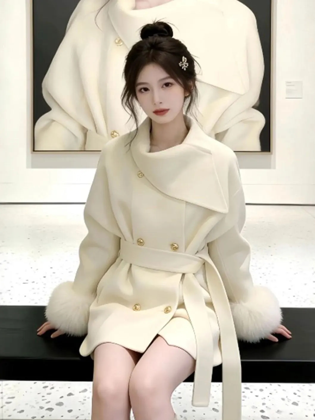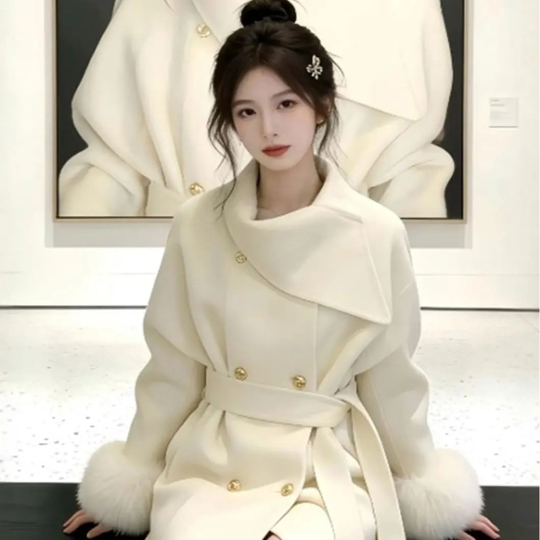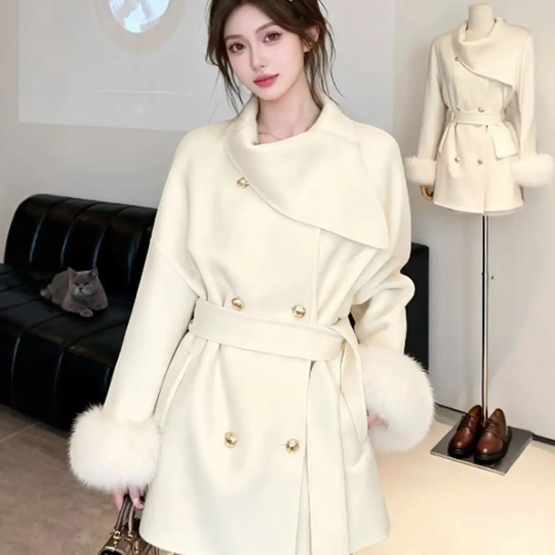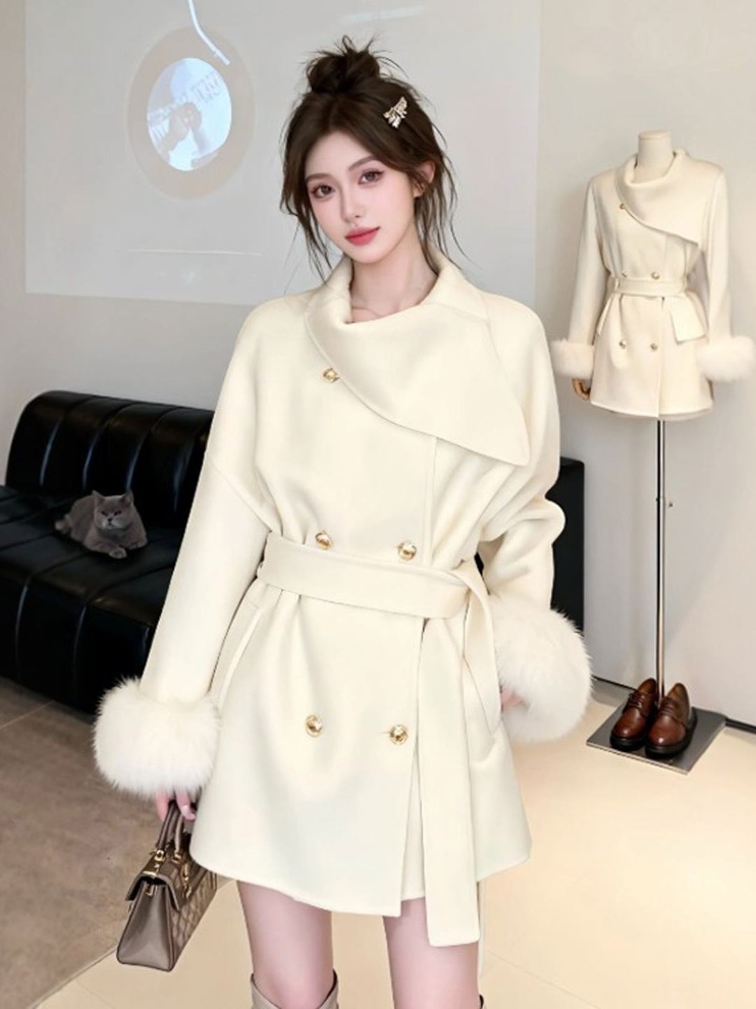 MY17436# 系富家千金毛呢外套新款短款设计感毛毛袖呢子大衣女裝貨源服裝批發