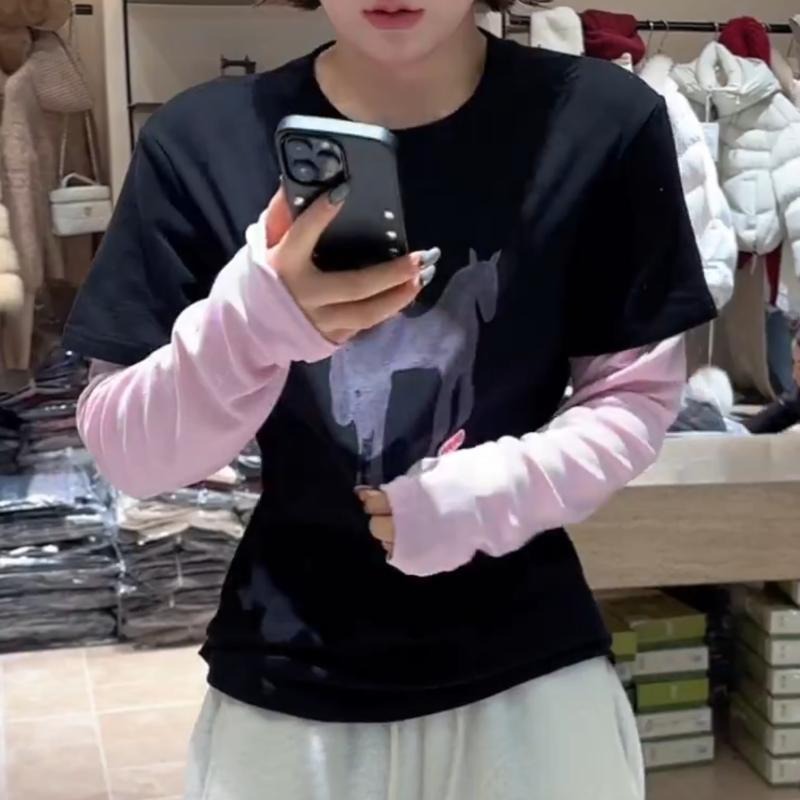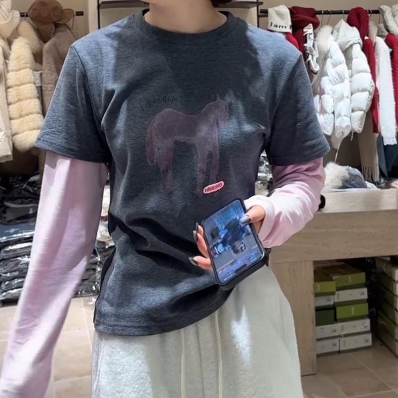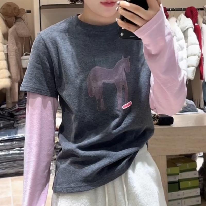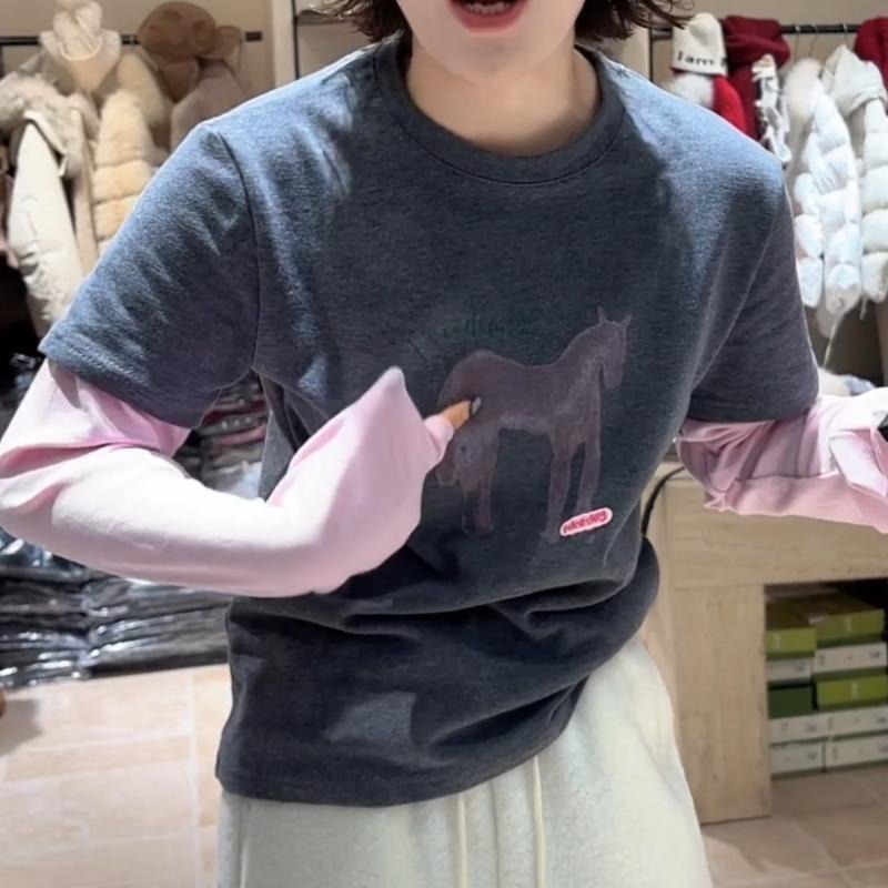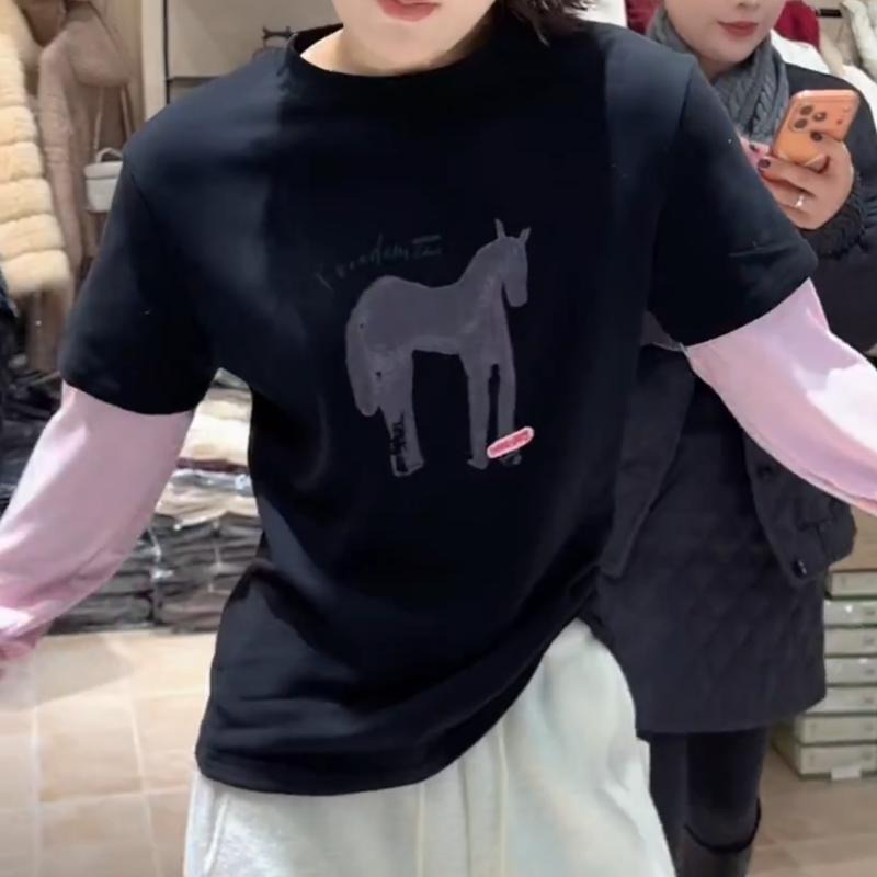 MY17443# 新款时尚百搭韩版设计感小马动物图案拼色假两件T恤女上衣女裝貨源服裝批發