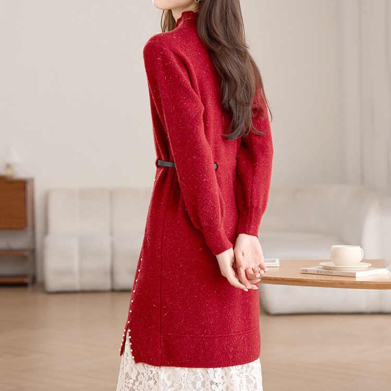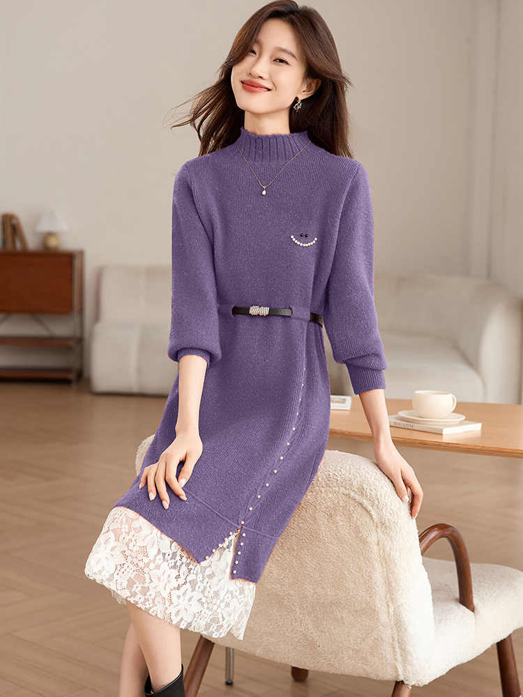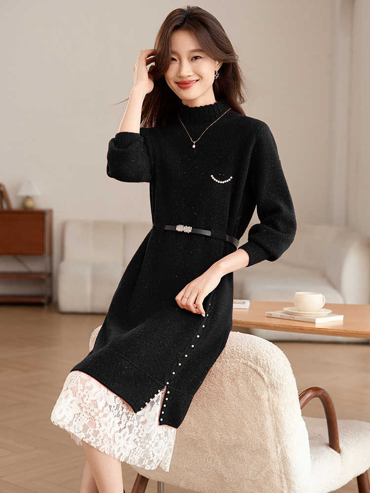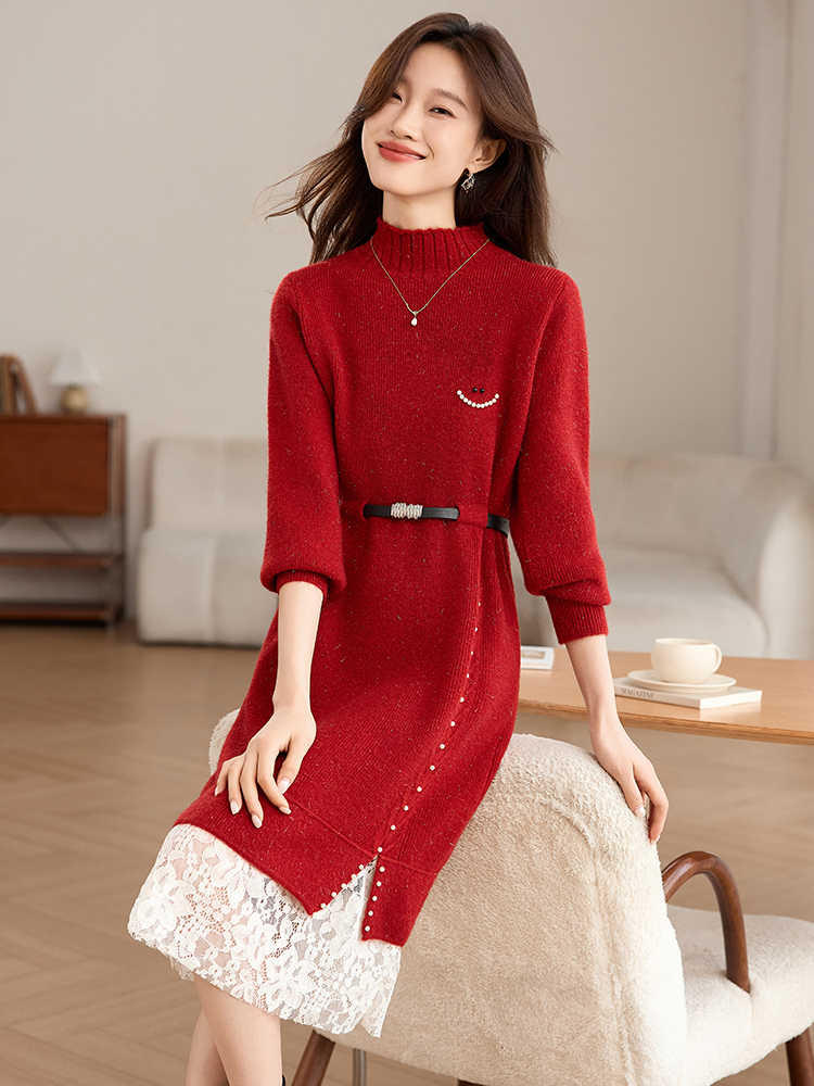 MY17448# 高级感减龄红色毛衣裙女拼接蕾丝配大衣中长款针织打底连衣裙女裝貨源服裝批發