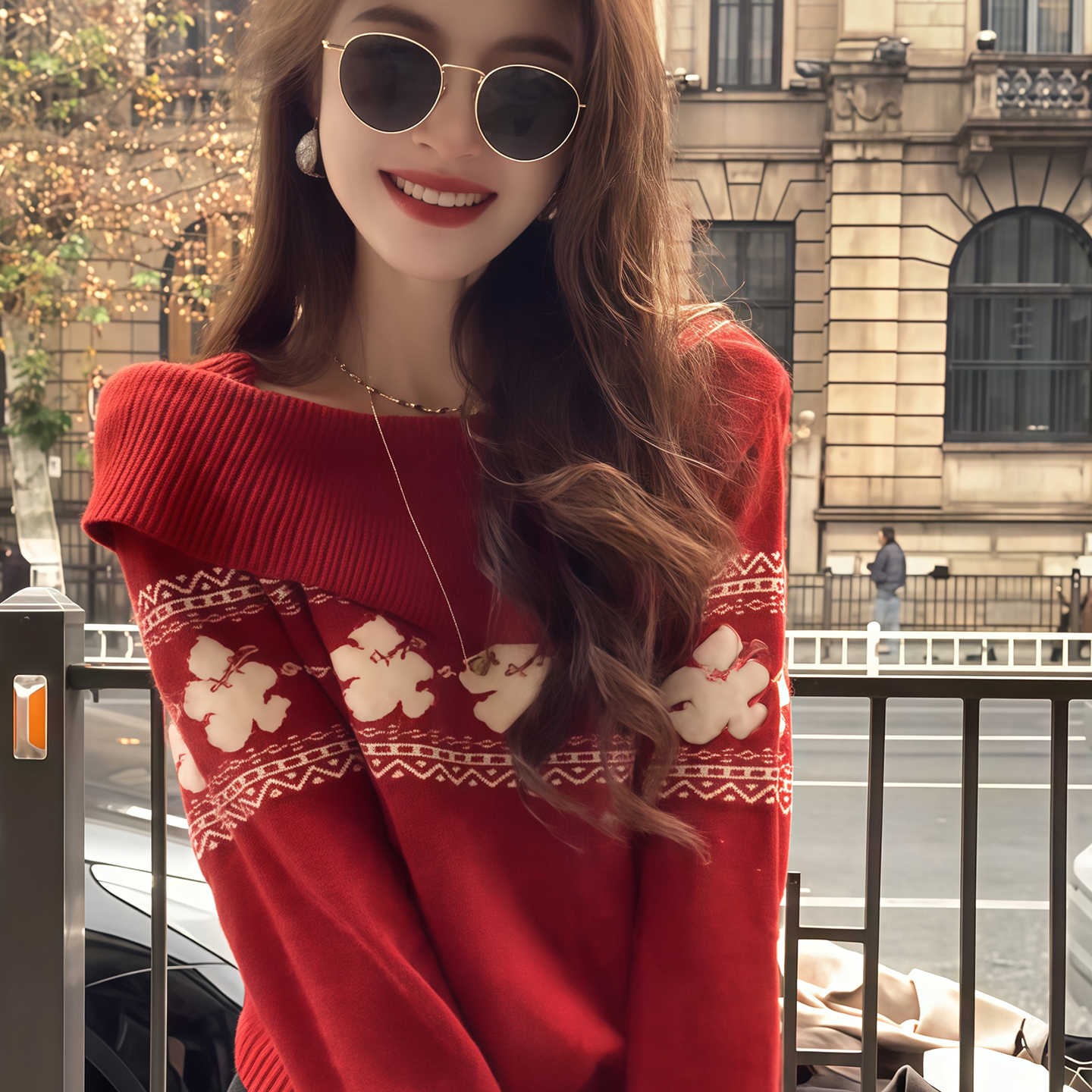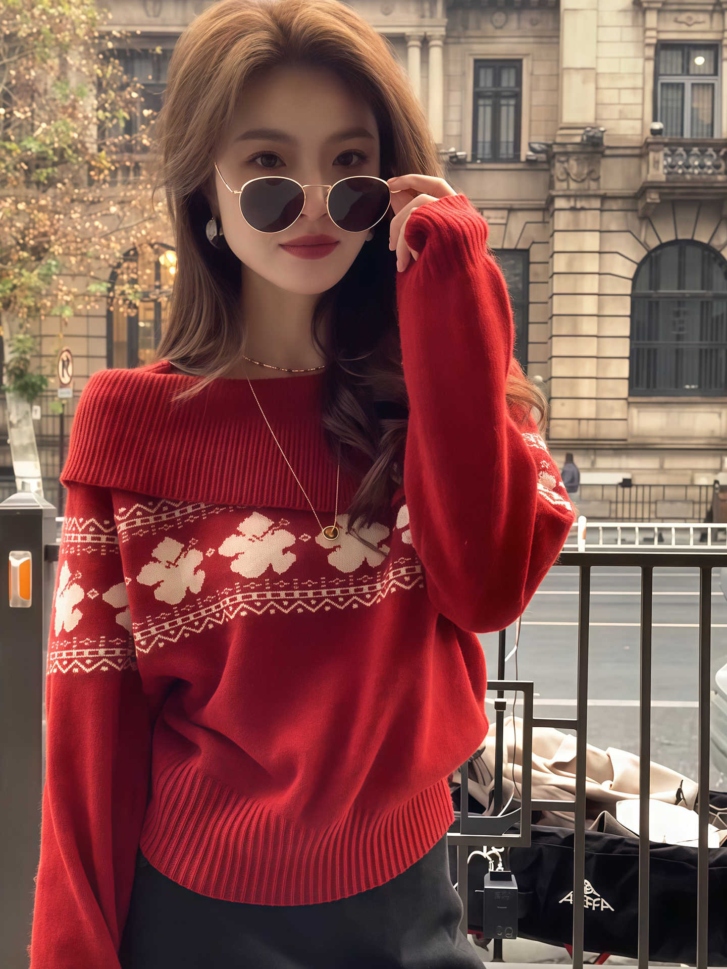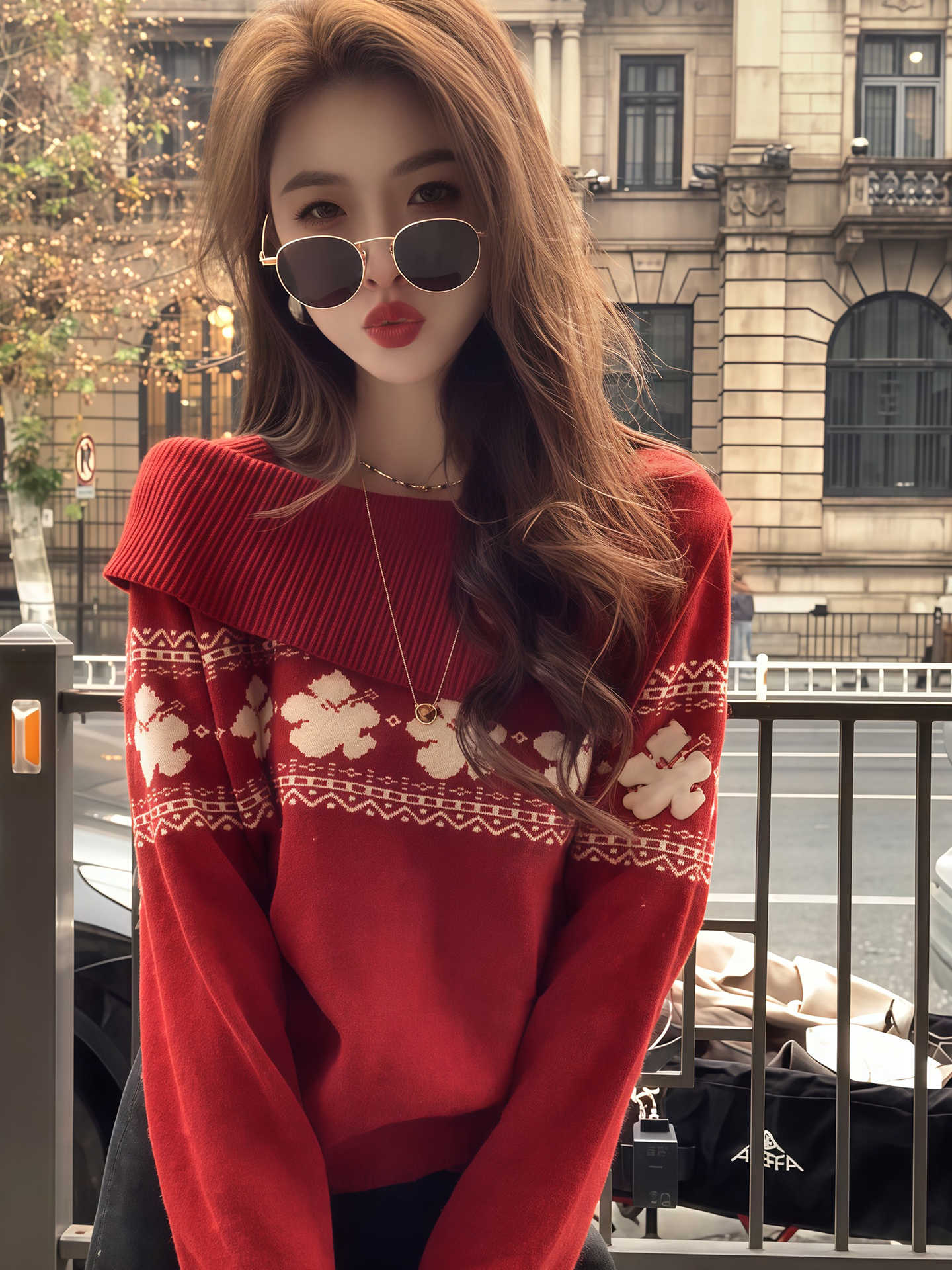 MY17451# 韩系穿搭费尔岛风大翻领针织衫新款红色高级感气质毛衣女裝貨源服裝批發