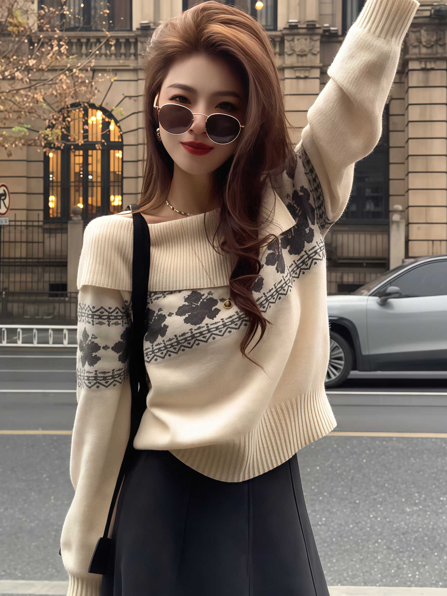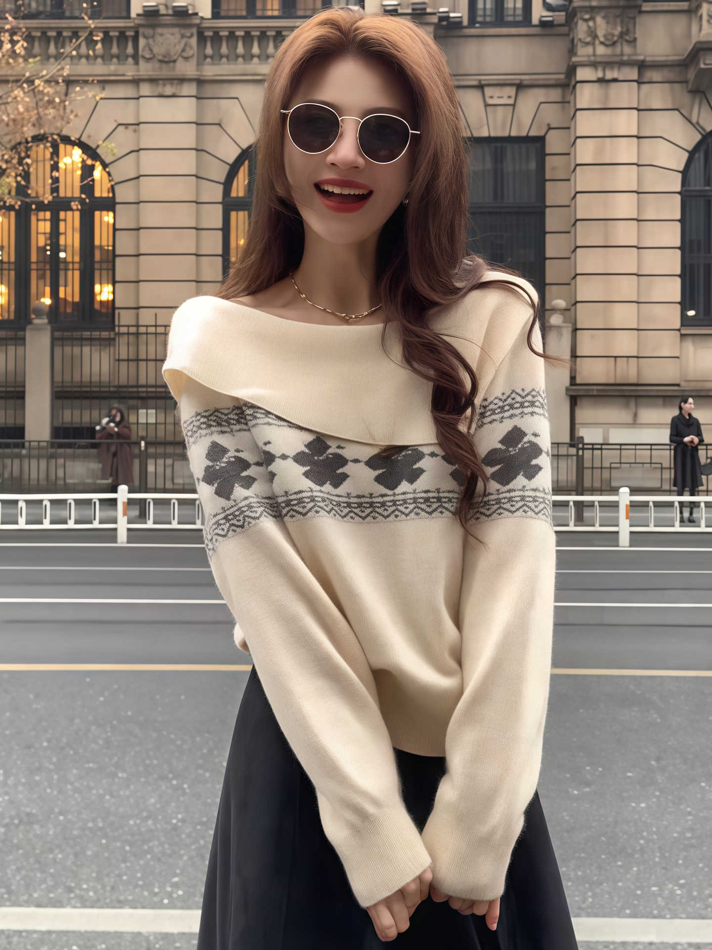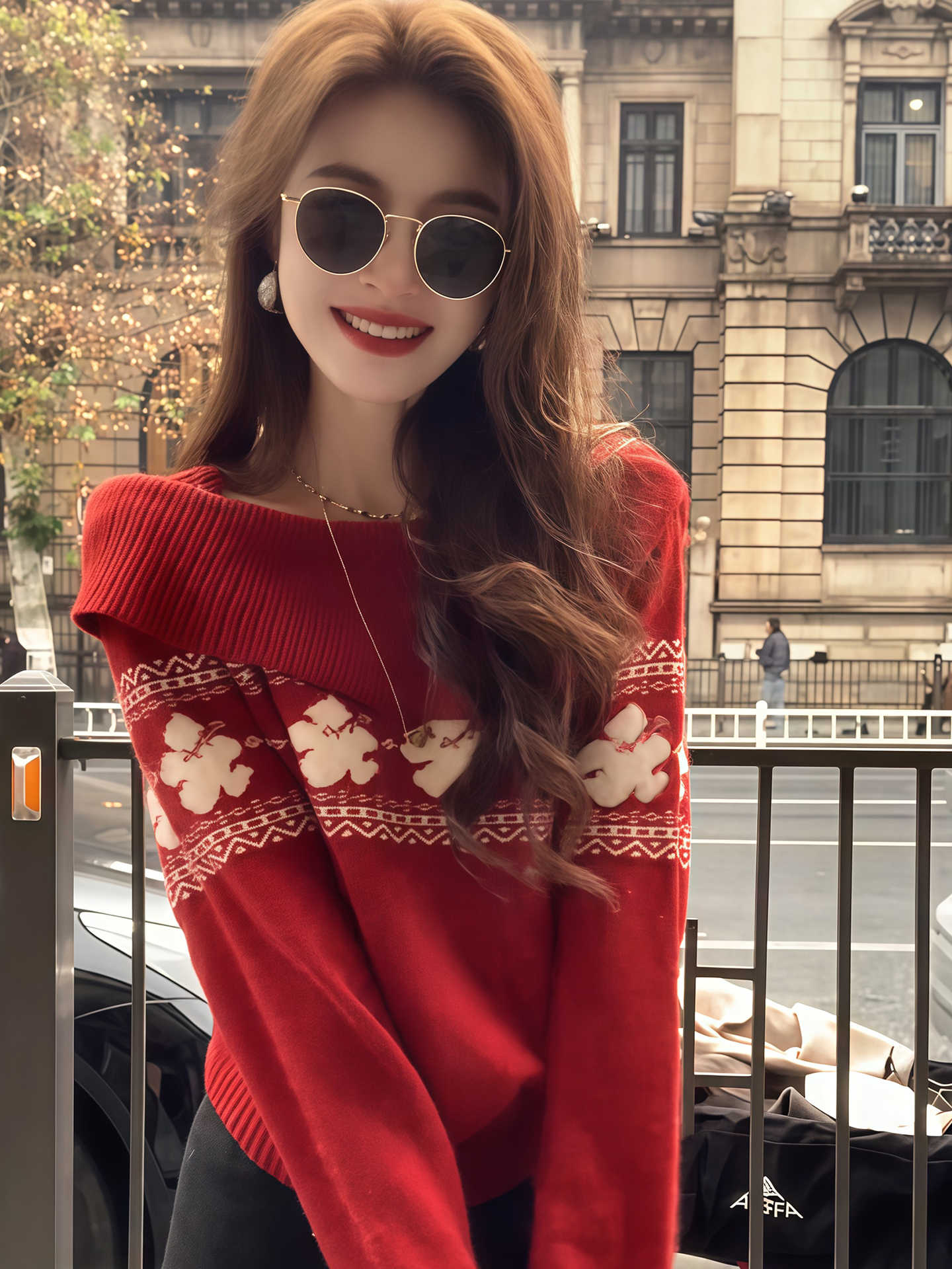 MY17451# 韩系穿搭费尔岛风大翻领针织衫新款红色高级感气质毛衣女裝貨源服裝批發