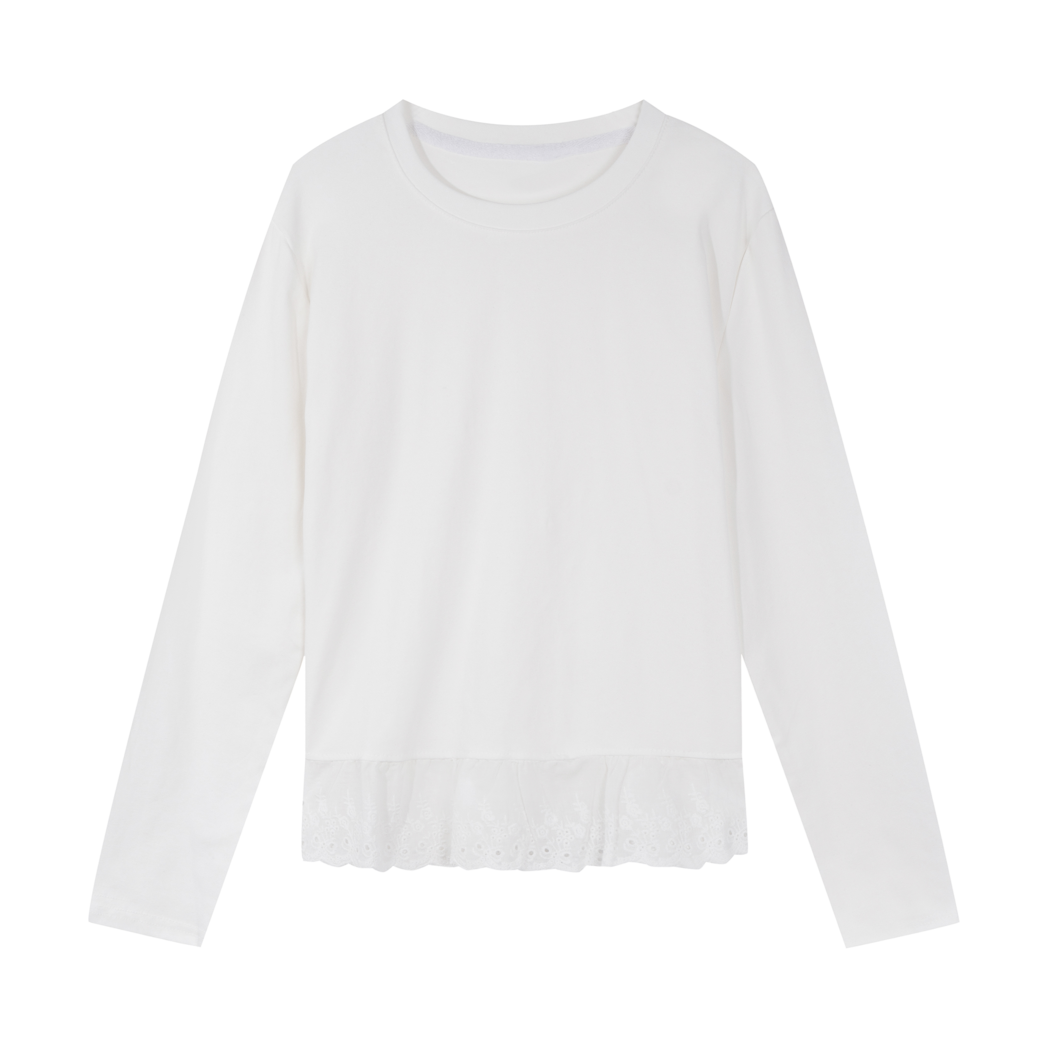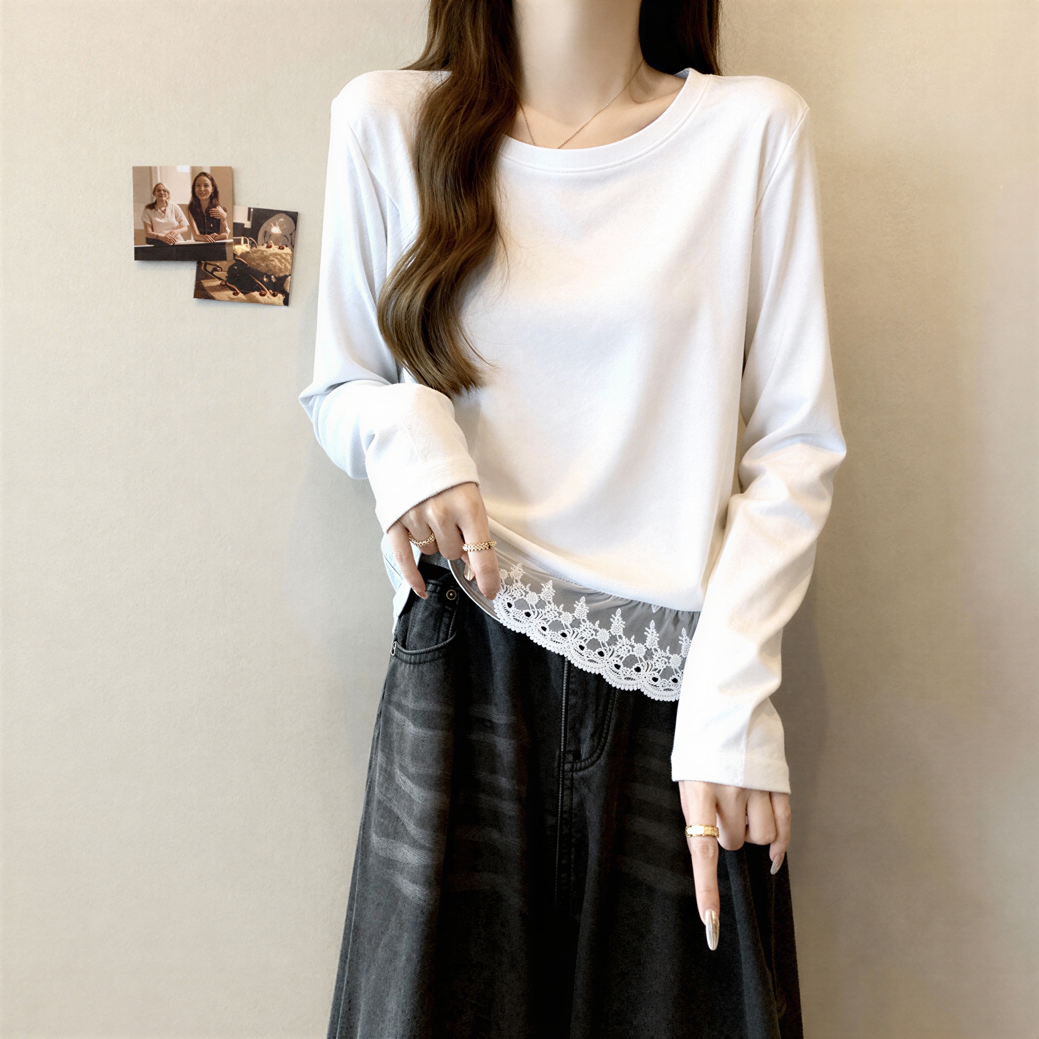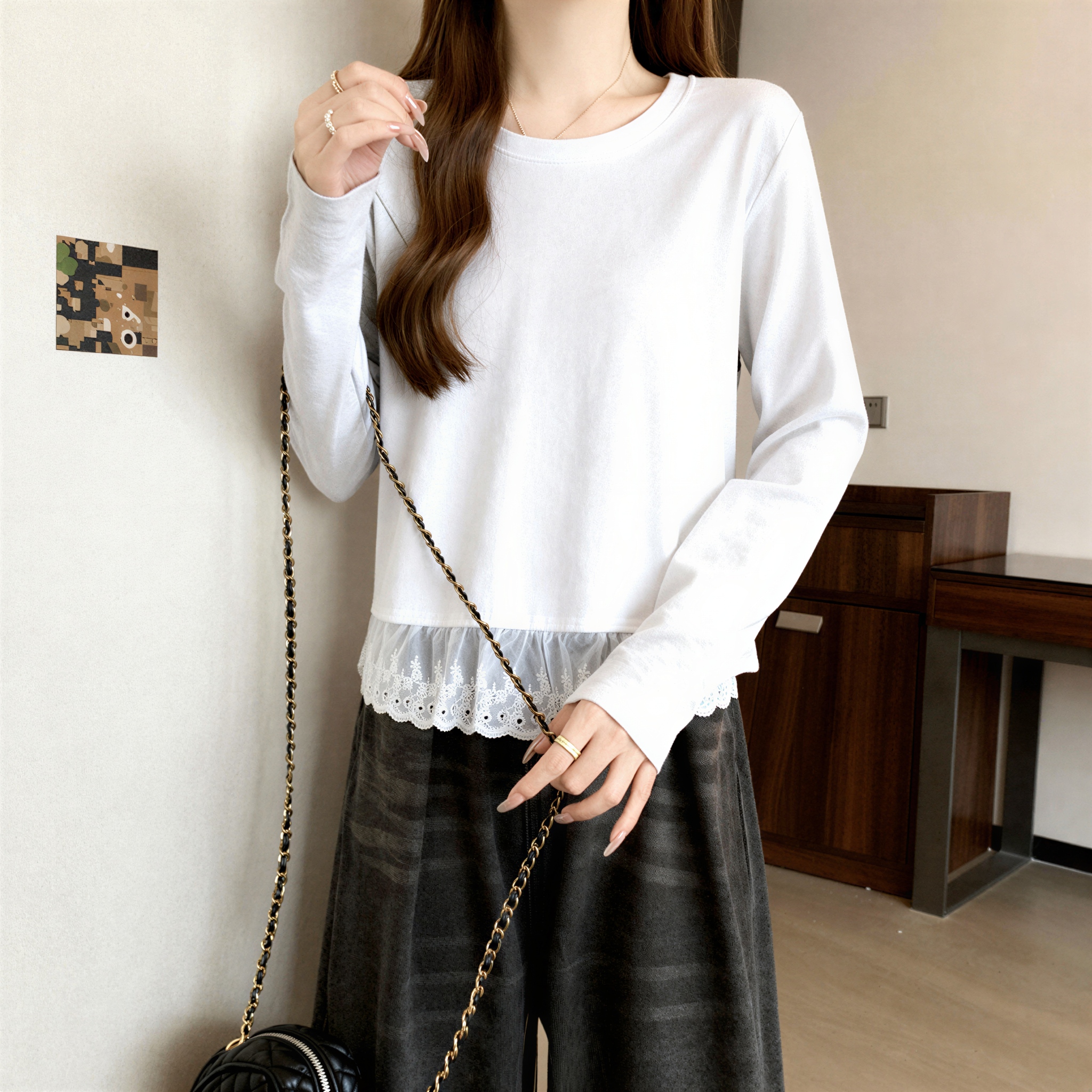 MY17452# 大码纯棉蕾丝拼接白色正肩长袖t恤胖MM显瘦设计感上衣女裝貨源服裝批發