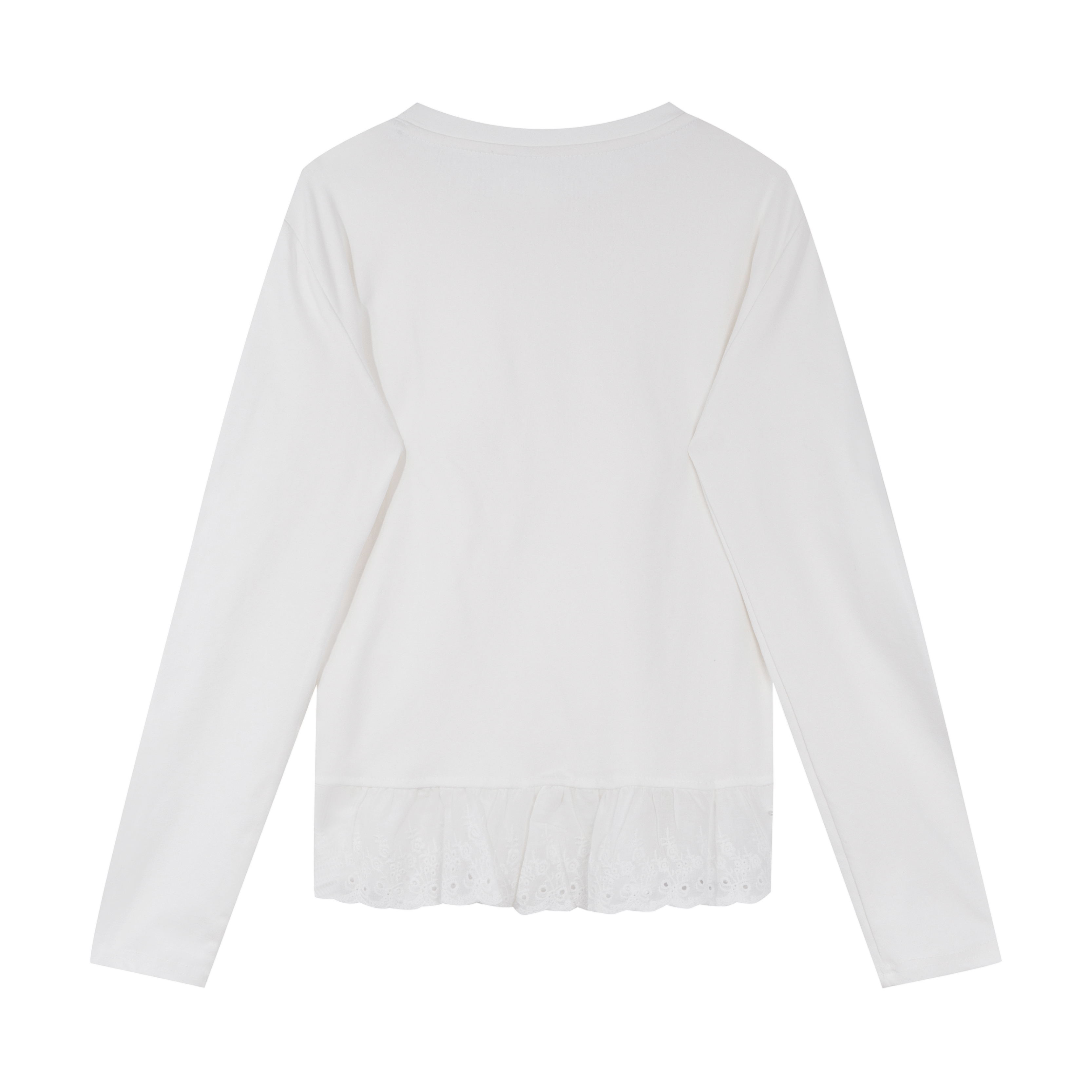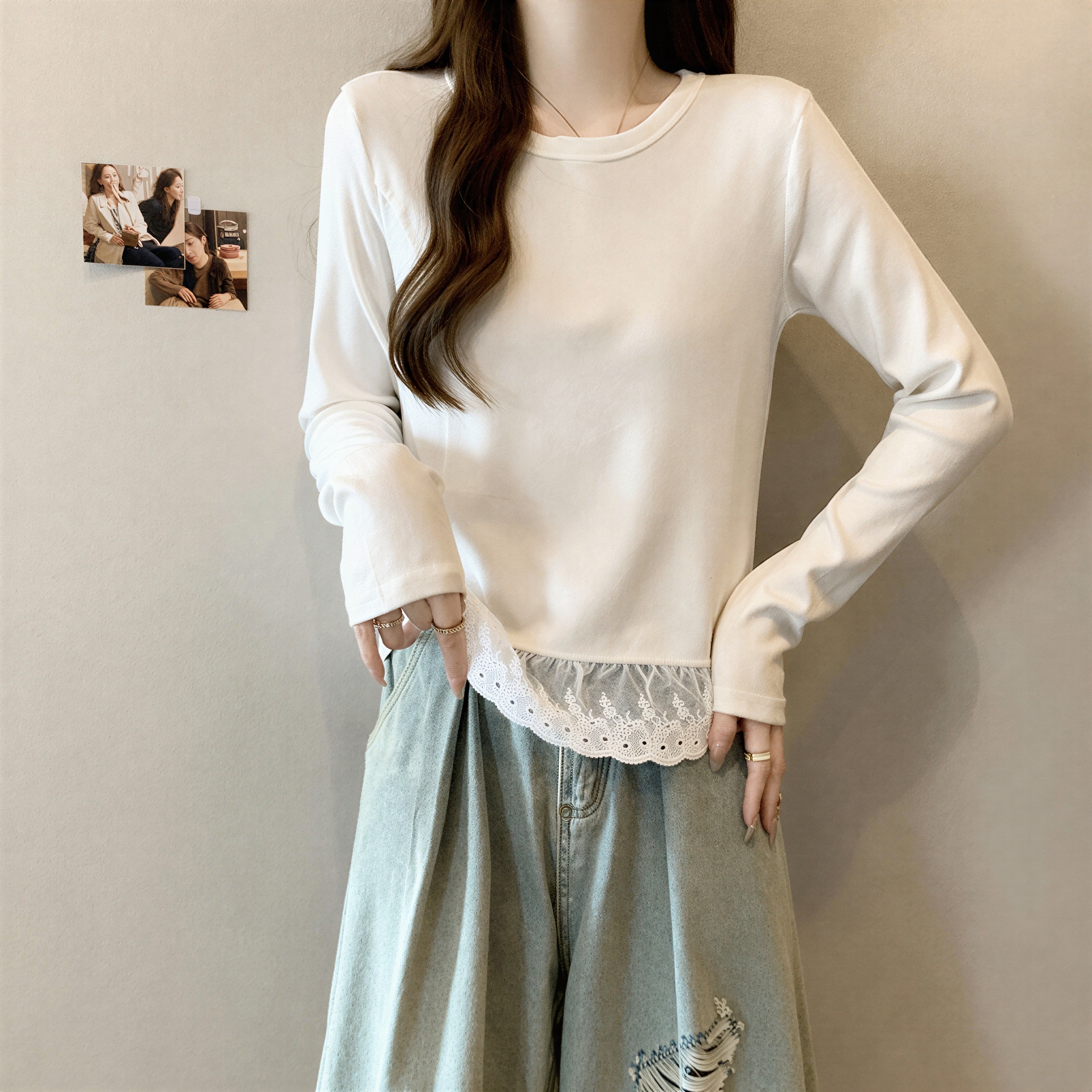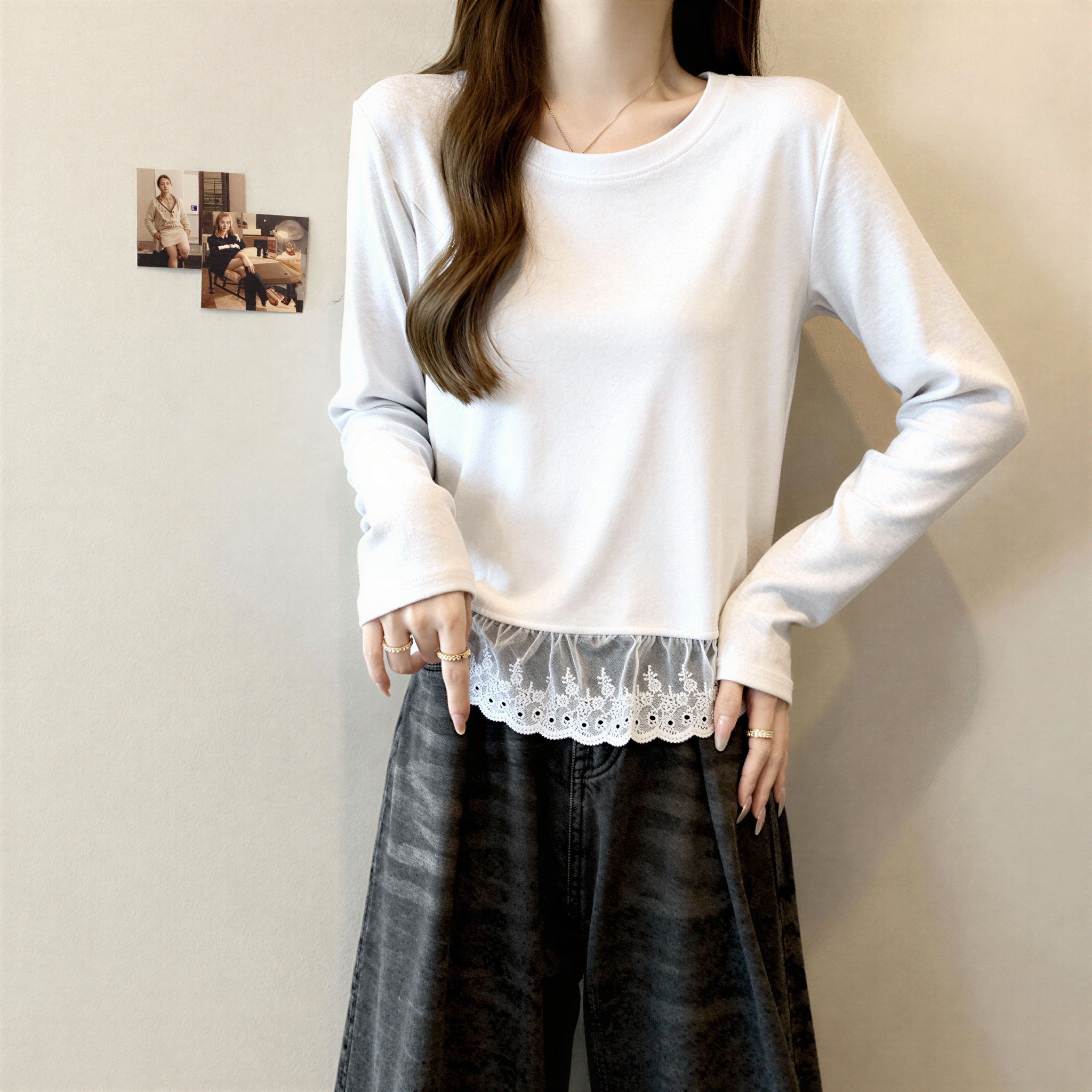 MY17452# 大码纯棉蕾丝拼接白色正肩长袖t恤胖MM显瘦设计感上衣女裝貨源服裝批發