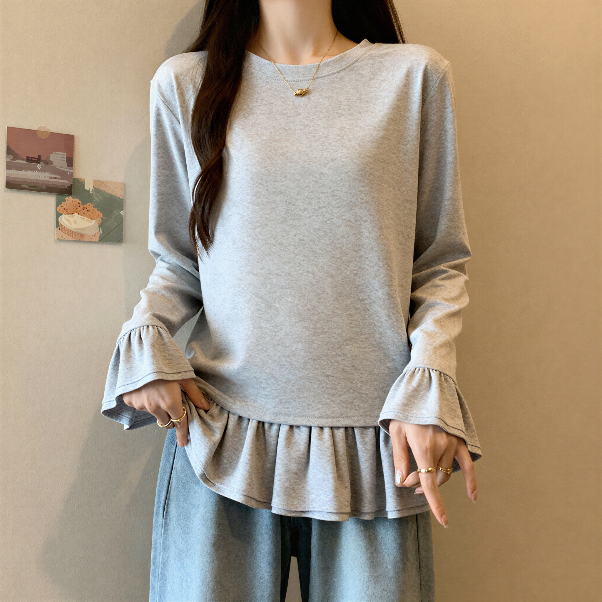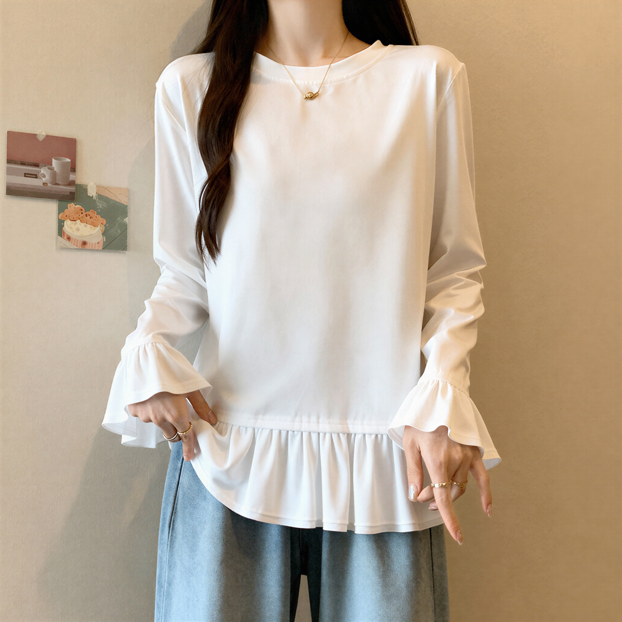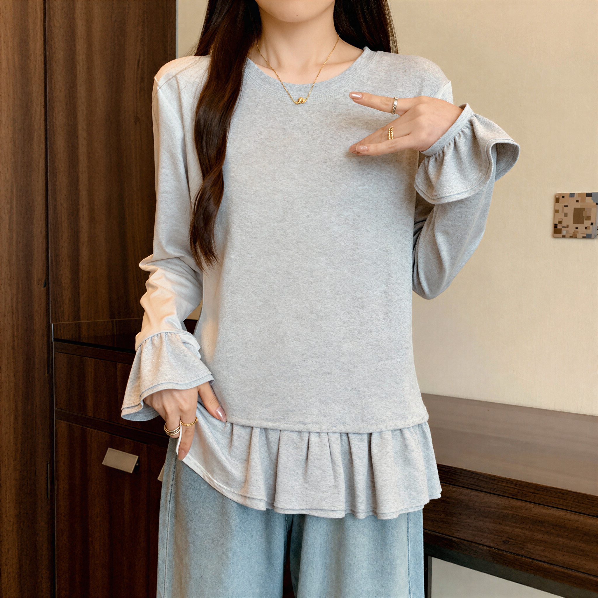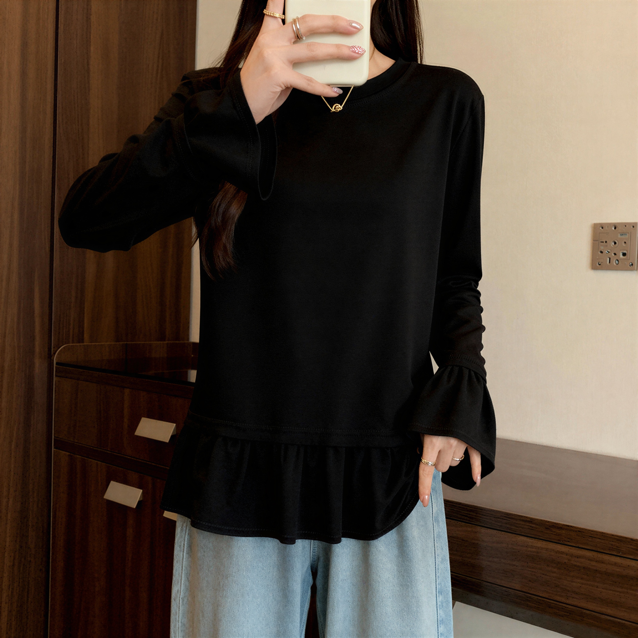 MY17455# 大码拼接木耳边长袖T恤新款胖mm遮肚子纯棉打底衫上衣女裝貨源服裝批發